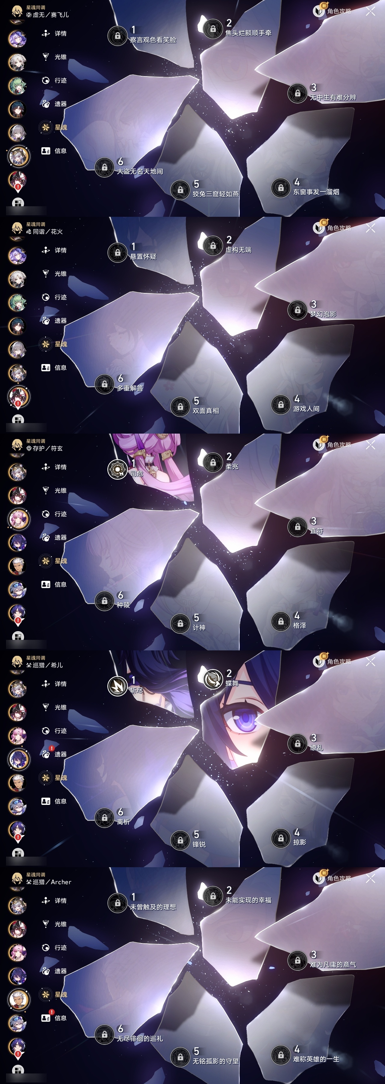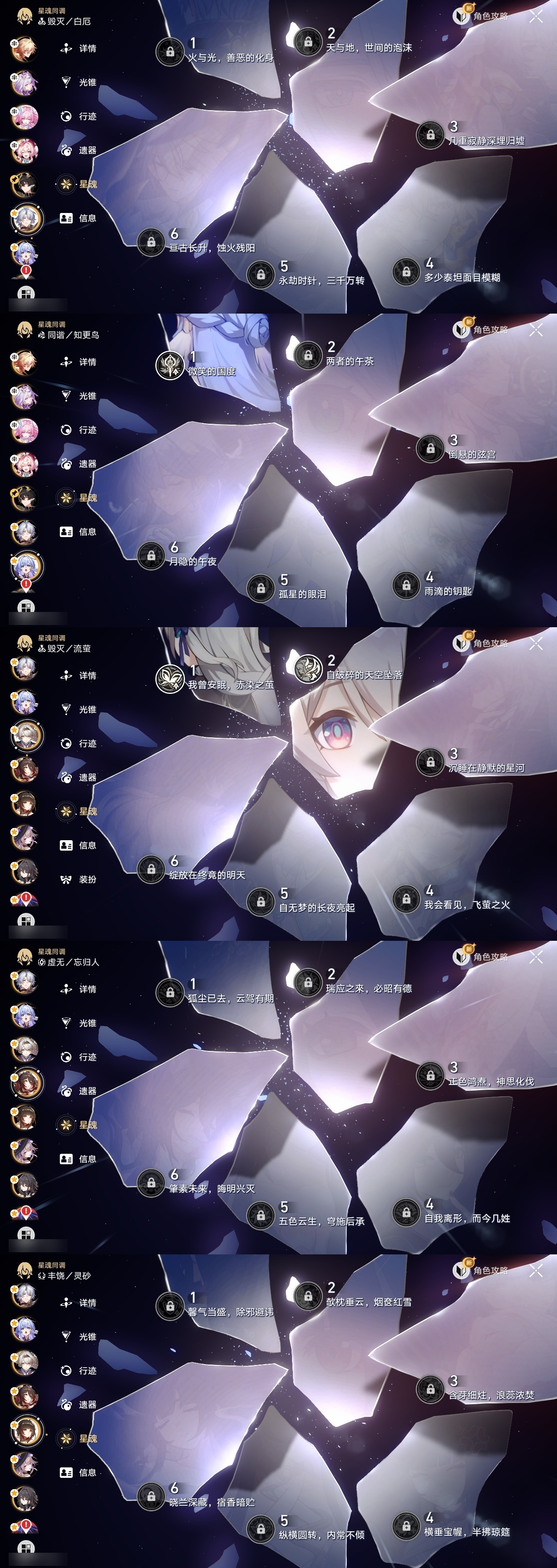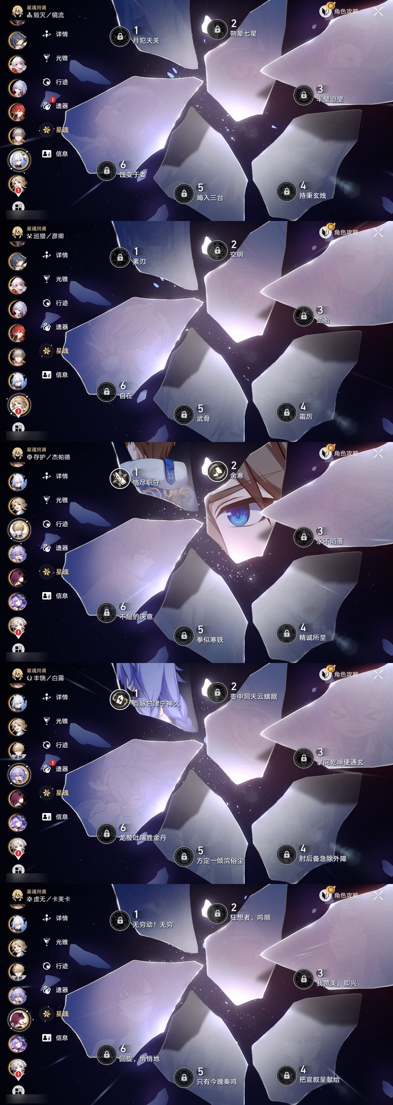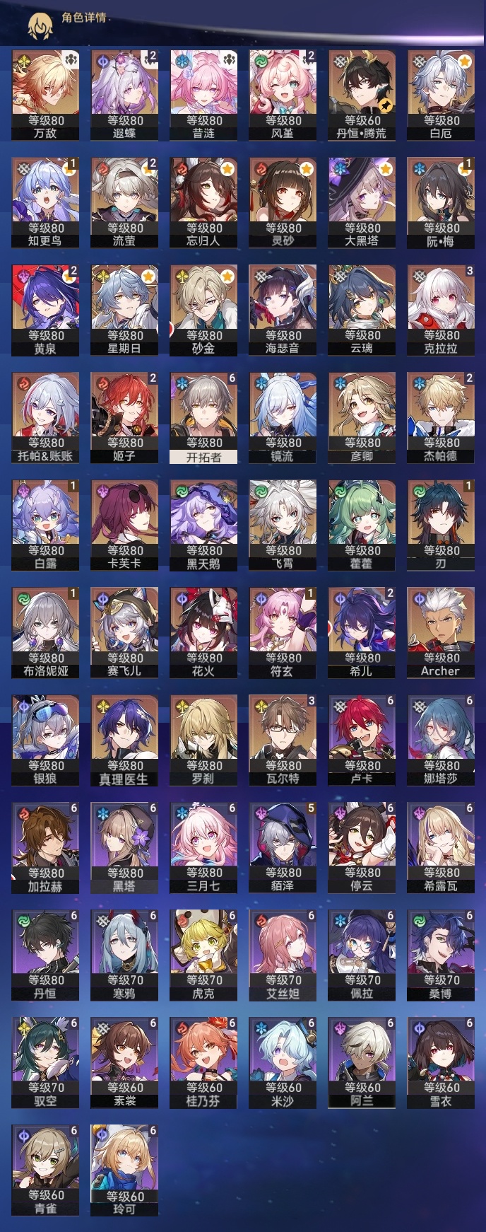 【崩坏·星穹铁道】【lyxq9694】冒险等级:70,男主,五星数量:63,五星角色:瓦尔特 3命克拉拉 3命希儿 2命姬子 2命杰帕德 2命遐蝶 2命黄泉 2命风堇 2命流萤 2命白露 1命布洛妮娅 1命刃 1命符玄 1命知更鸟 1命云璃飞霄银狼灵砂彦卿星期日大黑塔忘归人罗刹万敌卡芙卡镜流托帕账账藿藿真理医生黑天鹅花火砂金赛飞儿白厄archer海瑟音丹恒·腾荒昔涟__五星光锥:星海巡航 5精记忆的质料 5精记一位星神的陨落 3精但战斗还未结束 2精制胜的瞬间银河铁道之夜以世界之名以世界之名以世界之名无可取代的东西如泥酣眠于夜色中我将,巡征追猎回到大地的飞行棺的回响到不了的彼岸她已闭上双眼让告别,更美一些烦恼着,幸福着镜中故我行于流逝的岸愿虹光永驻天空夜色流光溢彩黎明恰如此燃烧理想燃烧的地狱__四星角色:阿兰 6命娜塔莎 6命虎克 6命黑塔 6命丹恒 6命艾丝妲 6命希露瓦 6命停云 6命素裳 6命桑博 6命三月七 6命青雀 6命佩拉 6命驭空 6命卢卡 6命玲可 6命桂乃芬 6命寒鸦 6命雪衣 6命米沙 6命加拉赫 6命貊泽 5命