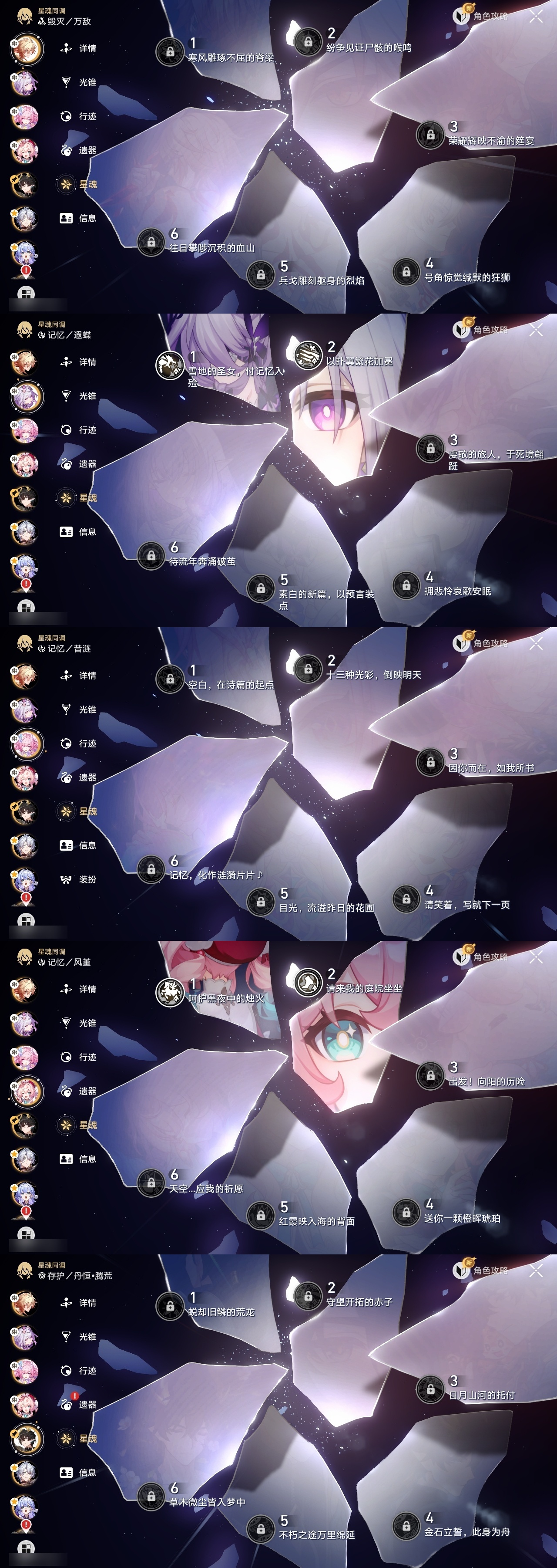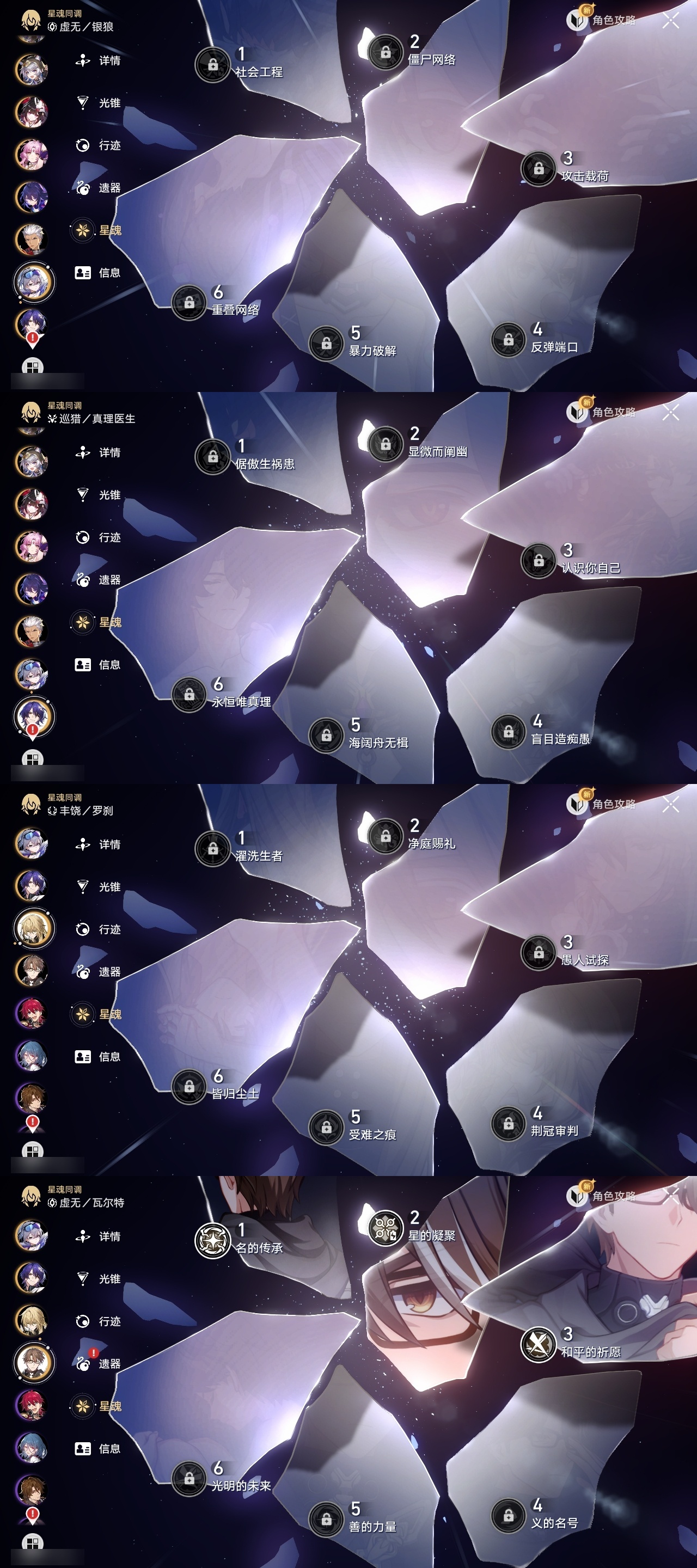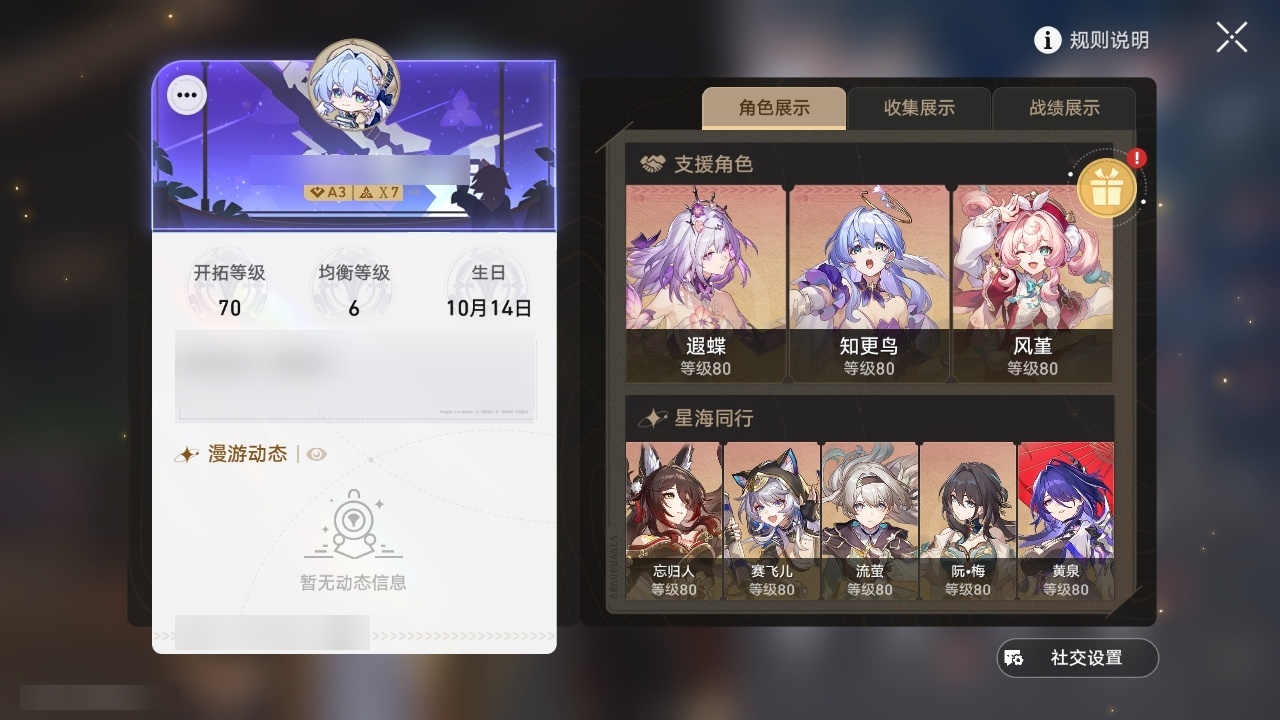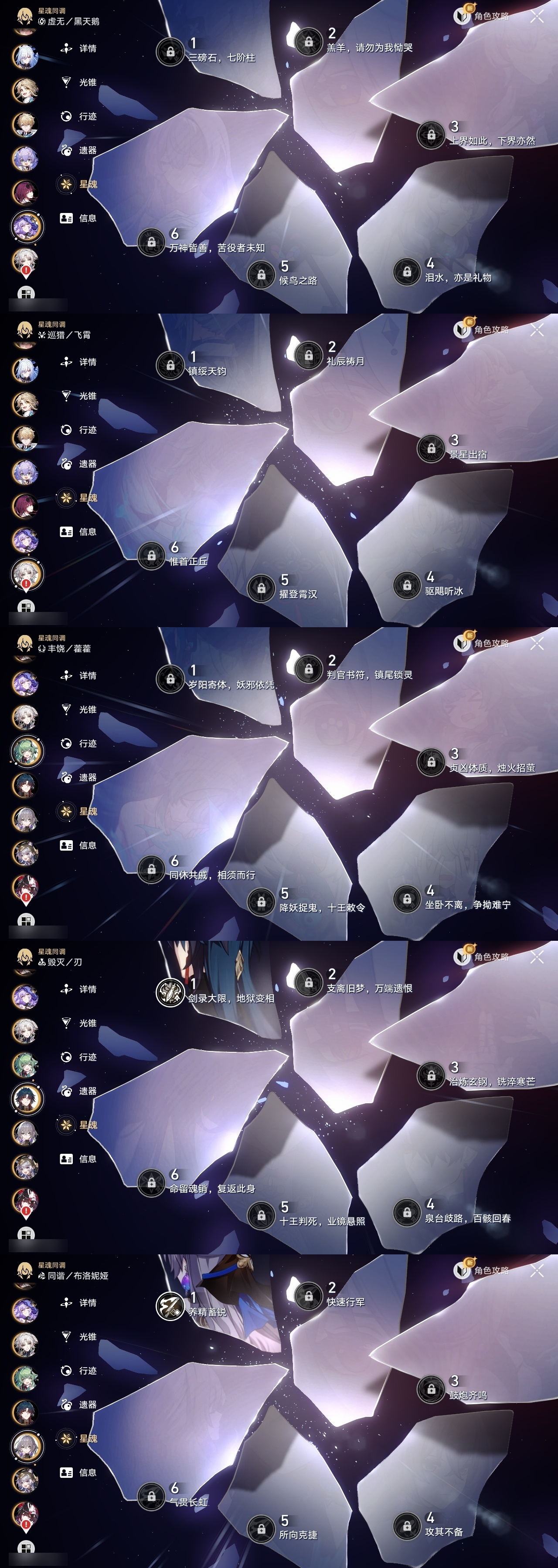 【崩坏·星穹铁道】【lyxq9694】冒险等级:70,男主,五星数量:63,五星角色:瓦尔特 3命克拉拉 3命希儿 2命姬子 2命杰帕德 2命遐蝶 2命黄泉 2命风堇 2命流萤 2命白露 1命布洛妮娅 1命刃 1命符玄 1命知更鸟 1命云璃飞霄银狼灵砂彦卿星期日大黑塔忘归人罗刹万敌卡芙卡镜流托帕账账藿藿真理医生黑天鹅花火砂金赛飞儿白厄archer海瑟音丹恒·腾荒昔涟__五星光锥:星海巡航 5精记忆的质料 5精记一位星神的陨落 3精但战斗还未结束 2精制胜的瞬间银河铁道之夜以世界之名以世界之名以世界之名无可取代的东西如泥酣眠于夜色中我将,巡征追猎回到大地的飞行棺的回响到不了的彼岸她已闭上双眼让告别,更美一些烦恼着,幸福着镜中故我行于流逝的岸愿虹光永驻天空夜色流光溢彩黎明恰如此燃烧理想燃烧的地狱__四星角色:阿兰 6命娜塔莎 6命虎克 6命黑塔 6命丹恒 6命艾丝妲 6命希露瓦 6命停云 6命素裳 6命桑博 6命三月七 6命青雀 6命佩拉 6命驭空 6命卢卡 6命玲可 6命桂乃芬 6命寒鸦 6命雪衣 6命米沙 6命加拉赫 6命貊泽 5命