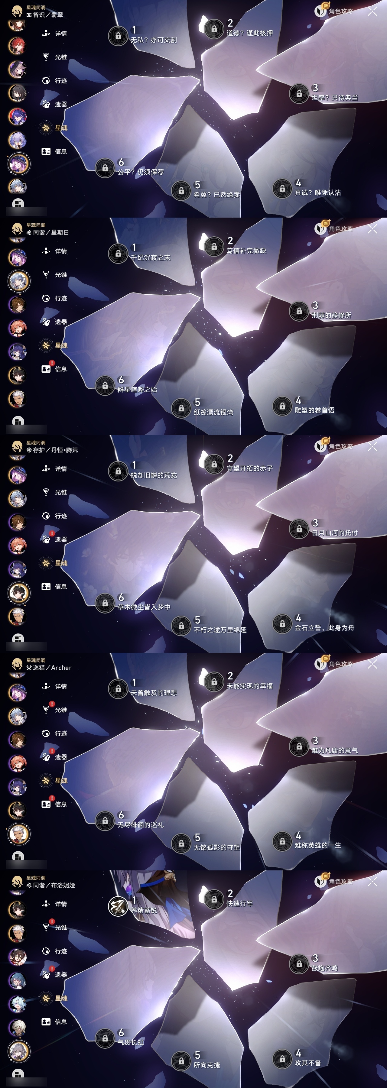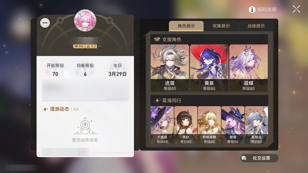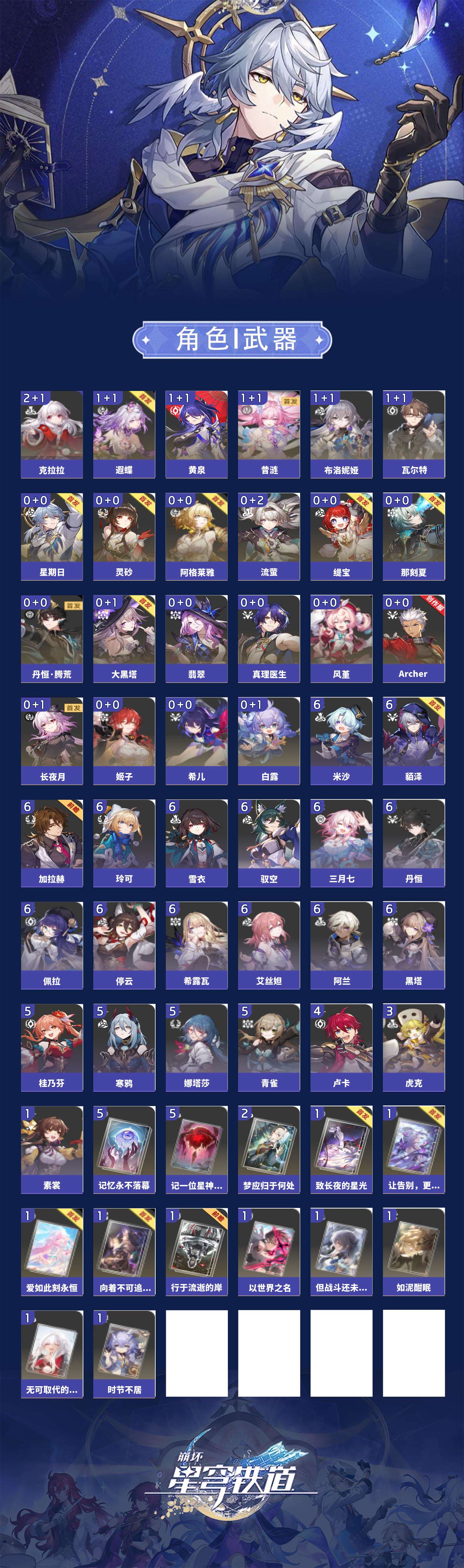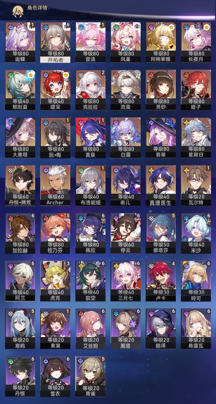 【崩坏·星穹铁道】【lyxq9690】冒险等级:70,女主,五星数量:36,五星角色:克拉拉 2命布洛妮娅 1命瓦尔特 1命遐蝶 1命黄泉 1命昔涟 1命希儿白露姬子灵砂星期日大黑塔阿格莱雅缇宝真理医生那刻夏风堇archer长夜月丹恒·腾荒流萤翡翠__五星光锥:记一位星神的陨落 5精不息的演算 5精记忆永不落幕 5精梦应归于何处 2精以世界之名无可取代的东西时节不居如泥酣眠但战斗还未结束向着不可追问处让告别,更美一些行于流逝的岸致长夜的星光爱如此刻永恒__四星角色:阿兰 6命貊泽 6命黑塔 6命丹恒 6命艾丝妲 6命希露瓦 6命停云 6命三月七 6命佩拉 6命驭空 6命玲可 6命雪衣 6命米沙 6命加拉赫 6命娜塔莎 5命青雀 5命桂乃芬 5命寒鸦 5命卢卡 4命虎克 3命素裳 1命