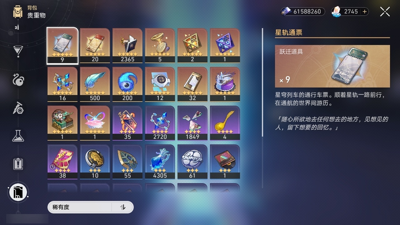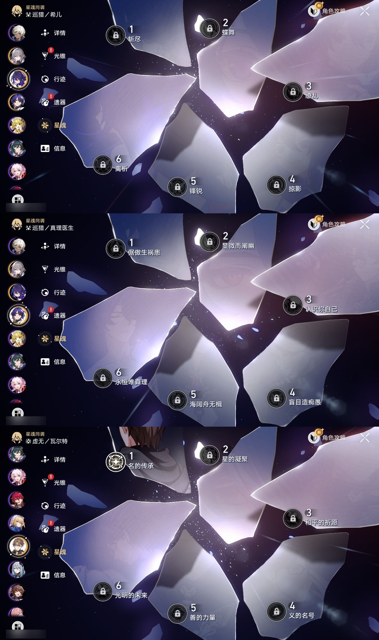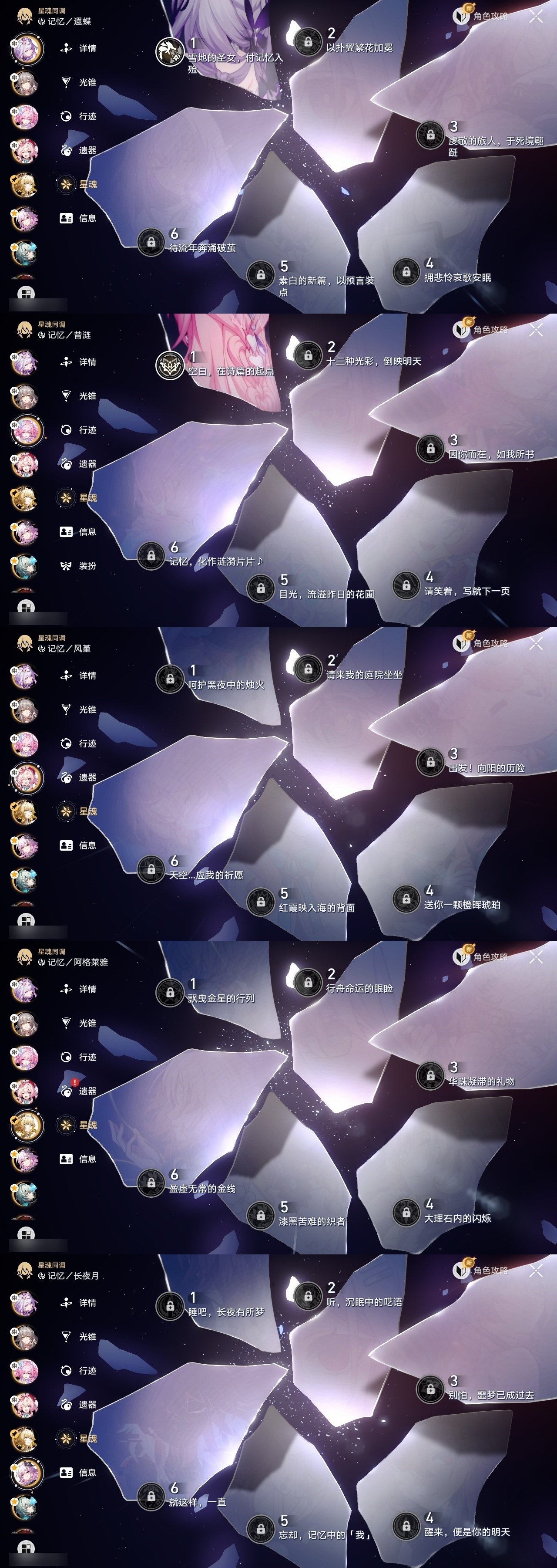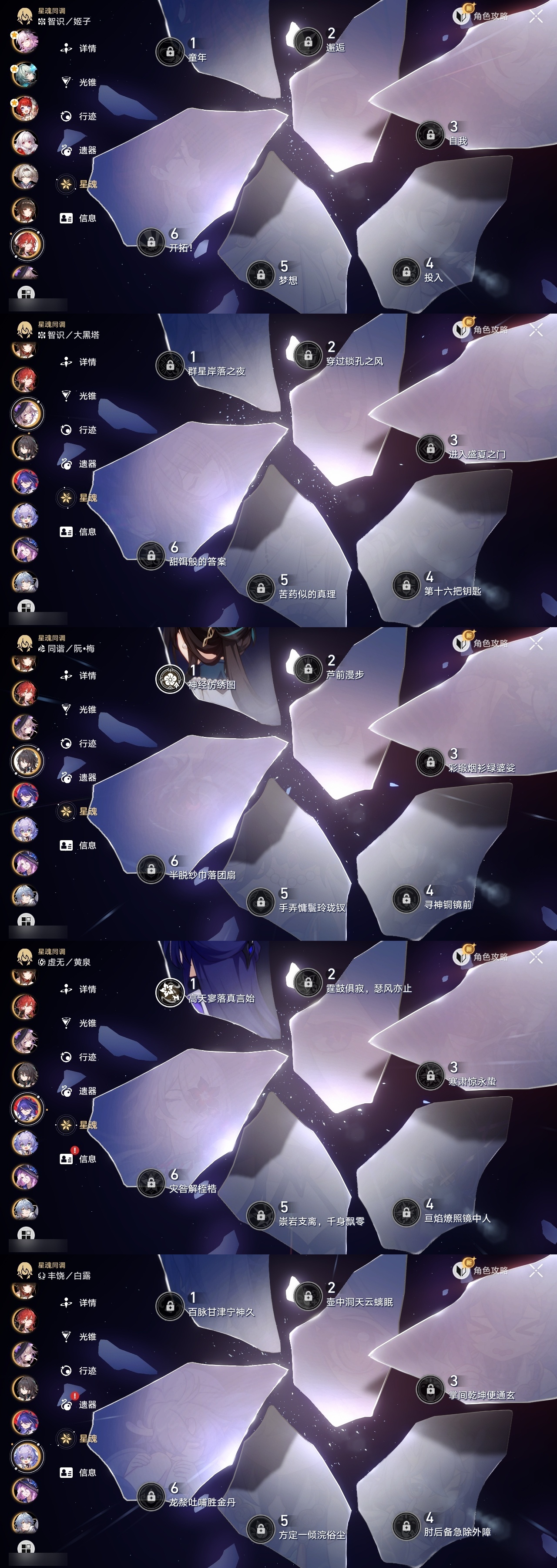 【崩坏·星穹铁道】【lyxq9690】冒险等级:70,女主,五星数量:36,五星角色:克拉拉 2命布洛妮娅 1命瓦尔特 1命遐蝶 1命黄泉 1命昔涟 1命希儿白露姬子灵砂星期日大黑塔阿格莱雅缇宝真理医生那刻夏风堇archer长夜月丹恒·腾荒流萤翡翠__五星光锥:记一位星神的陨落 5精不息的演算 5精记忆永不落幕 5精梦应归于何处 2精以世界之名无可取代的东西时节不居如泥酣眠但战斗还未结束向着不可追问处让告别,更美一些行于流逝的岸致长夜的星光爱如此刻永恒__四星角色:阿兰 6命貊泽 6命黑塔 6命丹恒 6命艾丝妲 6命希露瓦 6命停云 6命三月七 6命佩拉 6命驭空 6命玲可 6命雪衣 6命米沙 6命加拉赫 6命娜塔莎 5命青雀 5命桂乃芬 5命寒鸦 5命卢卡 4命虎克 3命素裳 1命