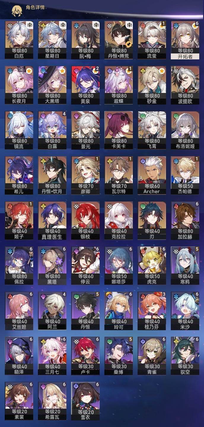 [15207871]等级:70/总黄数:84/女主/角色黄数:40 长夜月archer白厄遐蝶大黑塔星期日飞霄流萤波提欧砂金黄泉真理医生阮•梅银枝镜流卡芙卡刃景元希儿白露彦卿克拉拉杰帕德布洛妮娅瓦尔特姬子纵然山河万程让告别,更美一些记忆永不落幕向着不可追问处我将,巡征追猎梦应归于何处不息的演算行于流逝的岸比阳光更明亮的时节不居但战斗还未结束制胜的瞬间如泥酣眠无可取代的东西星海巡航记一位星神的陨落4命白露2命黄泉1命遐蝶1命流萤1命彦卿1命杰帕德1命瓦尔特1命姬子0命长夜月0命archer0命白厄0命大黑塔0命星期日0命飞霄0命波提欧0命砂金0命真理医生0命阮•梅0命银枝0命镜流0命卡芙卡0命刃0命景元0命希儿0命克拉拉0命布洛妮娅精5不息的演算精5记一位星神的陨落精4记忆永不落幕精2制胜的瞬间精1纵然山河万程精1让告别,更美一些精1向着不可追问处精1我将,巡征追猎精1梦应归于何处精1行于流逝的岸精1比阳光更明亮的精1时节不居精1但战斗还未结束精1无可取代的东西精1如泥酣眠精1星海巡航