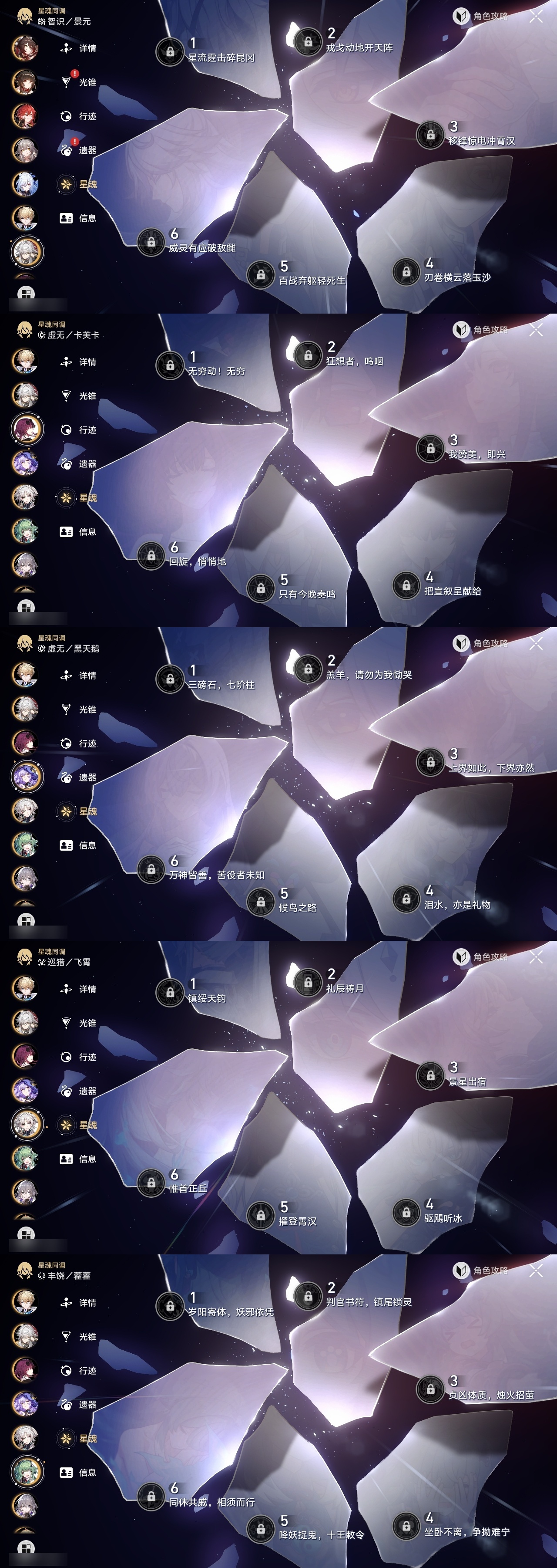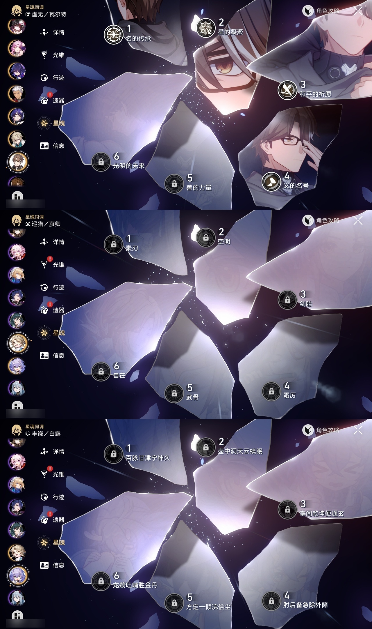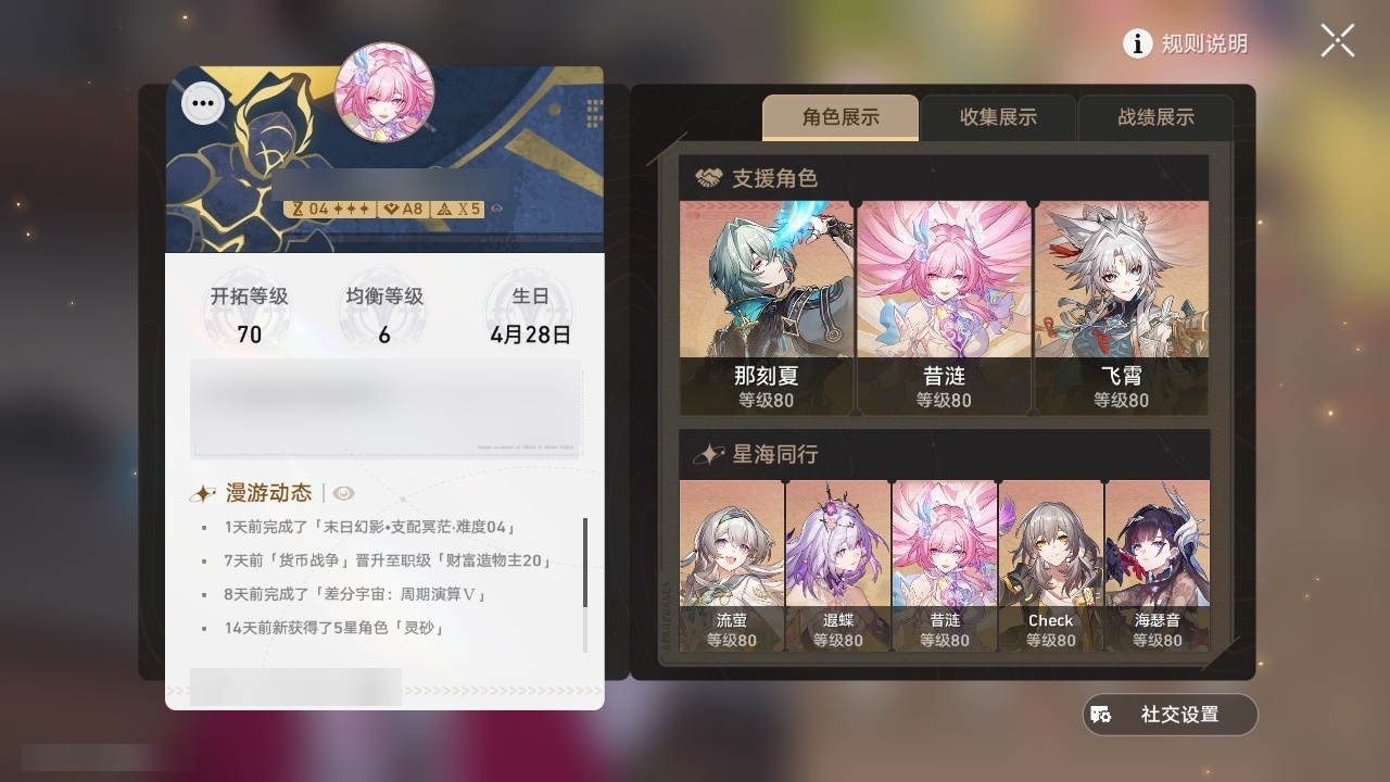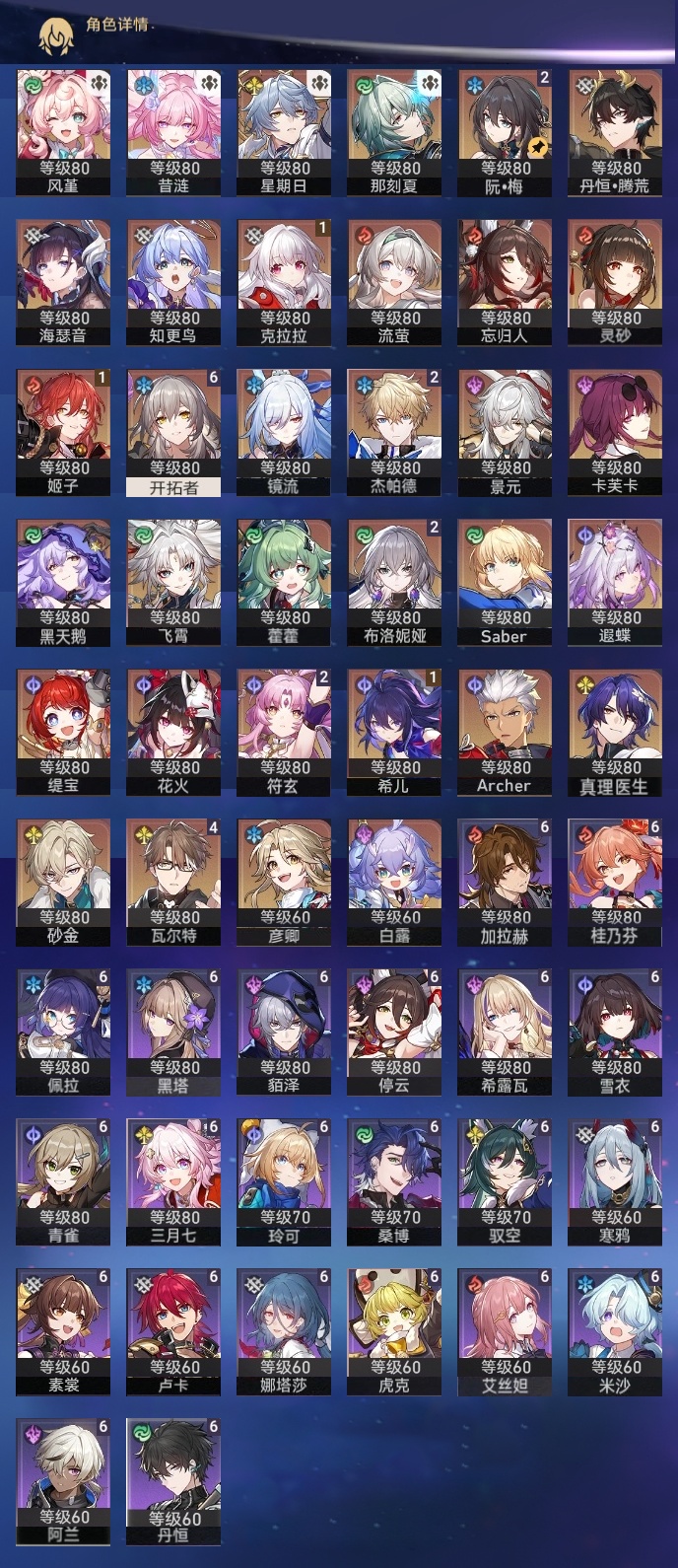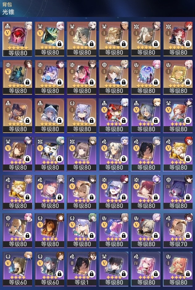 【崩坏·星穹铁道】【lyxq9707】冒险等级:70,女主,五星数量:47,五星角色:瓦尔特 4命布洛妮娅 2命杰帕德 2命符玄 2命希儿 1命姬子 1命克拉拉 1命飞霄景元白露灵砂彦卿星期日忘归人缇宝卡芙卡遐蝶镜流藿藿真理医生黑天鹅花火那刻夏风堇砂金知更鸟saberarcher海瑟音丹恒·腾荒昔涟流萤__五星光锥:星海巡航 5精记一位星神的陨落 5精孤独的疗愈 5精记忆永不落幕 4精以世界之名 3精落日时起舞制胜的瞬间银河铁道之夜时节不居如泥酣眠拂晓之前我将,巡征追猎将光阴织成黄金此身为剑重塑时光之忆__四星角色:阿兰 6命娜塔莎 6命虎克 6命貊泽 6命黑塔 6命丹恒 6命艾丝妲 6命希露瓦 6命停云 6命素裳 6命桑博 6命三月七 6命青雀 6命佩拉 6命驭空 6命卢卡 6命玲可 6命桂乃芬 6命寒鸦 6命雪衣 6命米沙 6命加拉赫 6命记忆队击破队带辅助