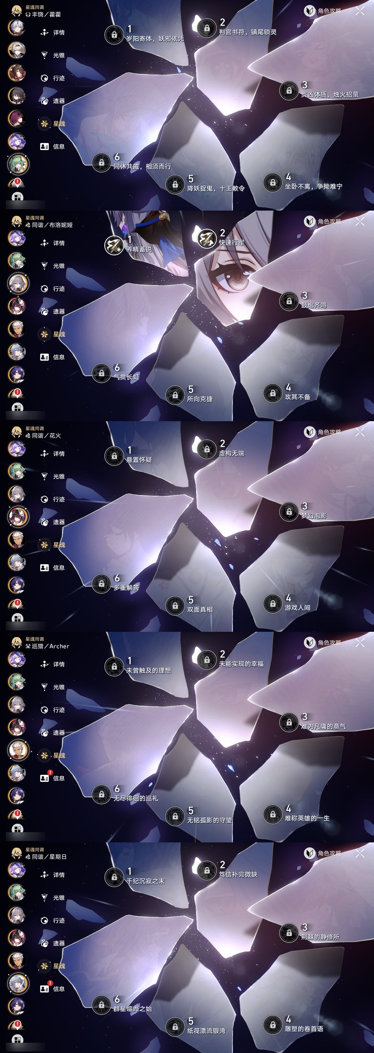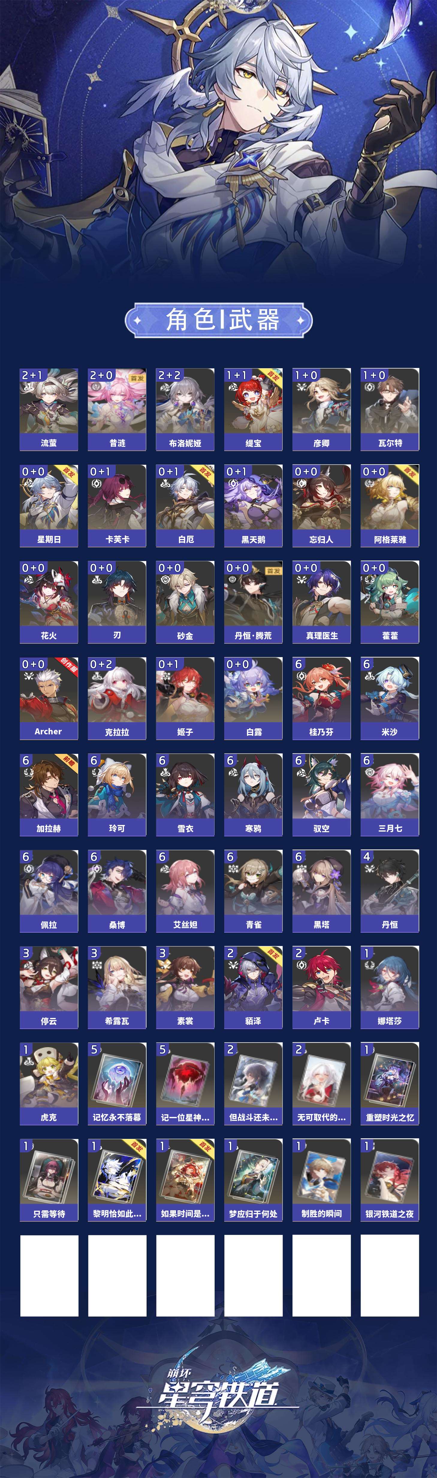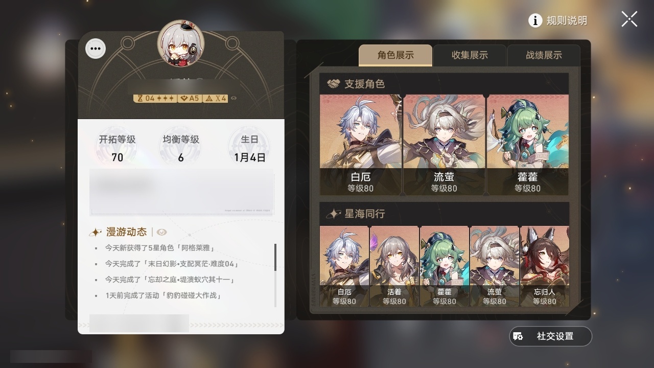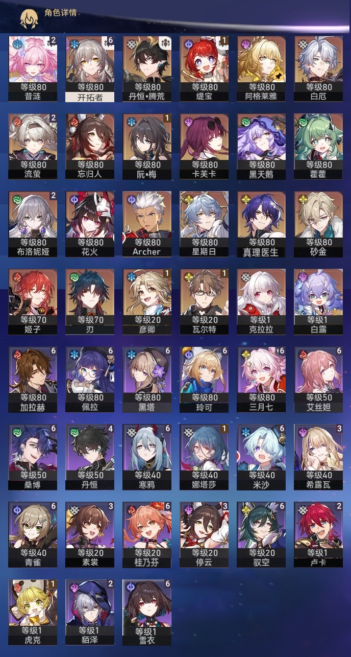 【崩坏·星穹铁道】【lyxq9705】冒险等级:70,女主,五星数量:33,五星角色:布洛妮娅 2命昔涟 2命流萤 2命彦卿 1命瓦尔特 1命缇宝 1命白露姬子克拉拉星期日忘归人阿格莱雅刃卡芙卡藿藿真理医生黑天鹅花火砂金白厄archer丹恒·腾荒__五星光锥:记一位星神的陨落 5精记忆永不落幕 5精无可取代的东西 2精但战斗还未结束 2精制胜的瞬间银河铁道之夜如果时间是一朵花只需等待重塑时光之忆黎明恰如此燃烧梦应归于何处__四星角色:黑塔 6命艾丝妲 6命桑博 6命三月七 6命青雀 6命佩拉 6命驭空 6命玲可 6命桂乃芬 6命寒鸦 6命雪衣 6命米沙 6命加拉赫 6命丹恒 4命希露瓦 3命停云 3命素裳 3命貊泽 2命卢卡 2命娜塔莎 1命虎克 1命白厄队,2命昔涟,击破队