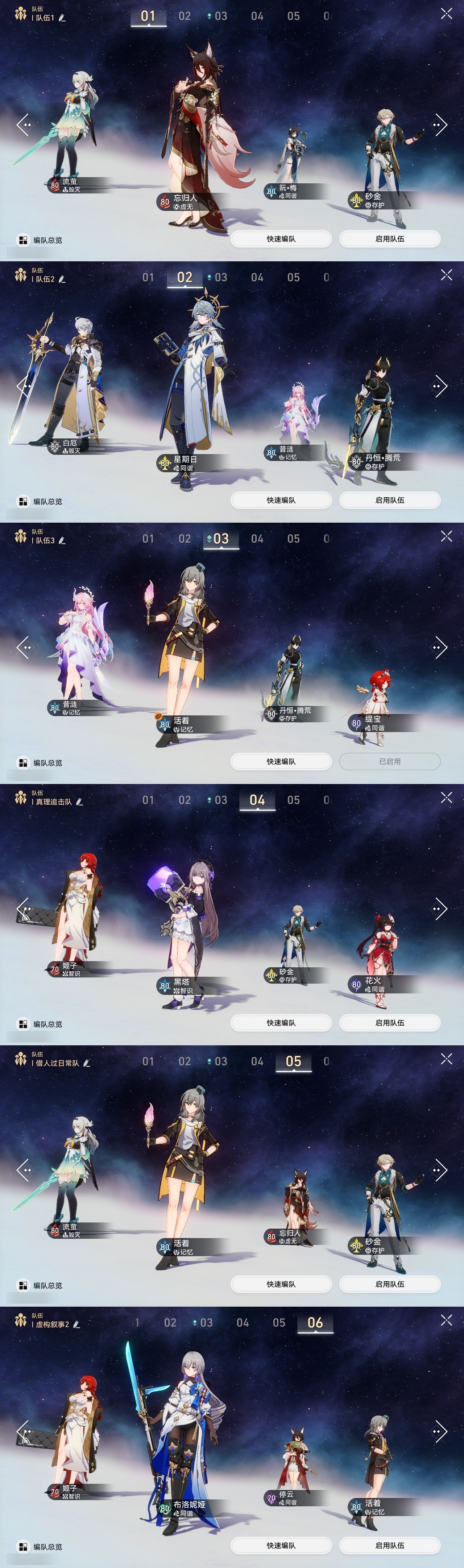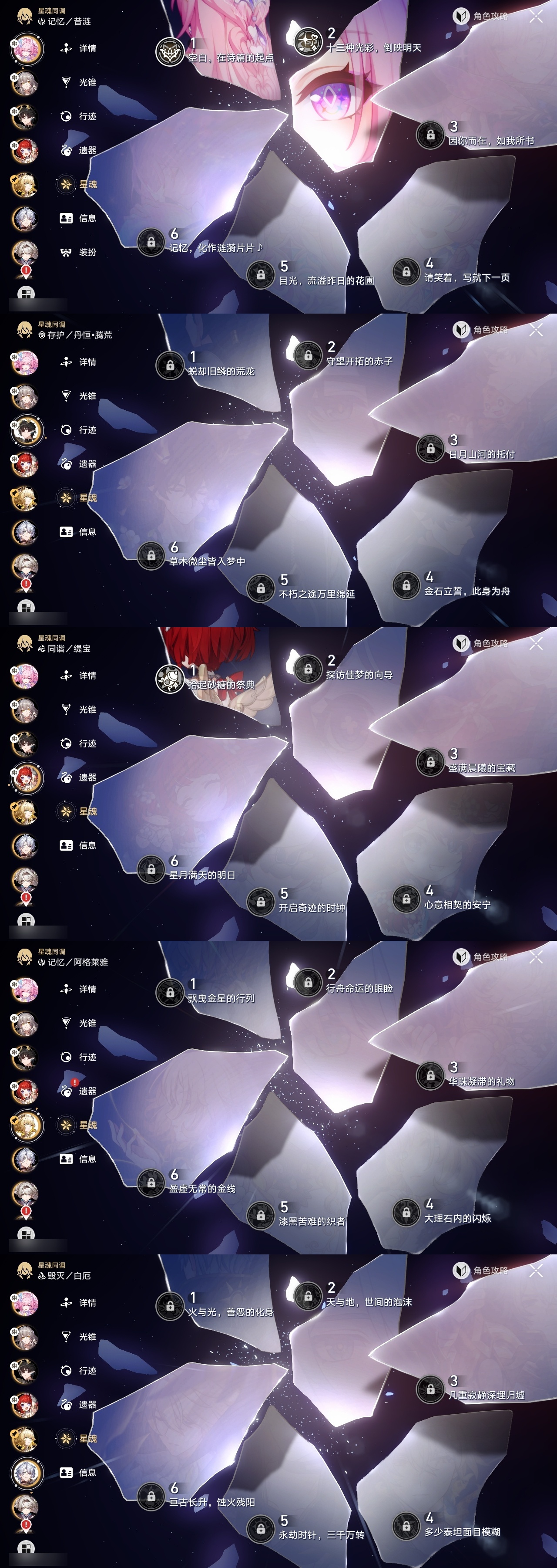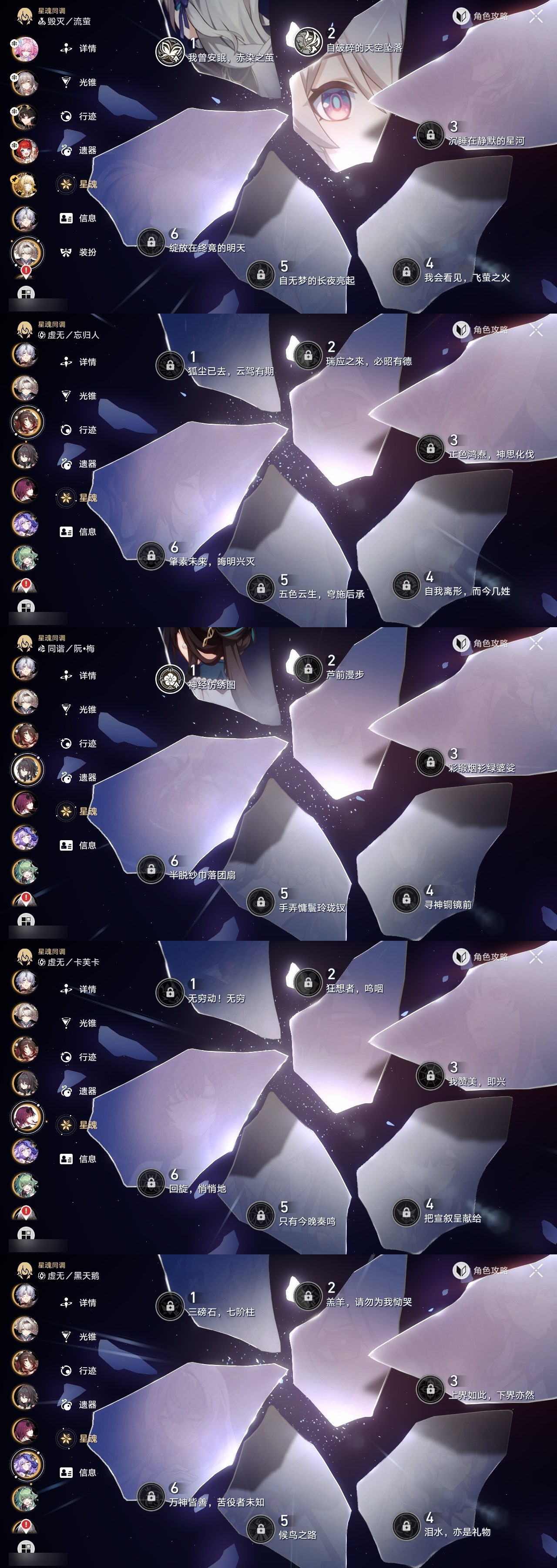 【崩坏·星穹铁道】【lyxq9705】冒险等级:70,女主,五星数量:33,五星角色:布洛妮娅 2命昔涟 2命流萤 2命彦卿 1命瓦尔特 1命缇宝 1命白露姬子克拉拉星期日忘归人阿格莱雅刃卡芙卡藿藿真理医生黑天鹅花火砂金白厄archer丹恒·腾荒__五星光锥:记一位星神的陨落 5精记忆永不落幕 5精无可取代的东西 2精但战斗还未结束 2精制胜的瞬间银河铁道之夜如果时间是一朵花只需等待重塑时光之忆黎明恰如此燃烧梦应归于何处__四星角色:黑塔 6命艾丝妲 6命桑博 6命三月七 6命青雀 6命佩拉 6命驭空 6命玲可 6命桂乃芬 6命寒鸦 6命雪衣 6命米沙 6命加拉赫 6命丹恒 4命希露瓦 3命停云 3命素裳 3命貊泽 2命卢卡 2命娜塔莎 1命虎克 1命白厄队,2命昔涟,击破队