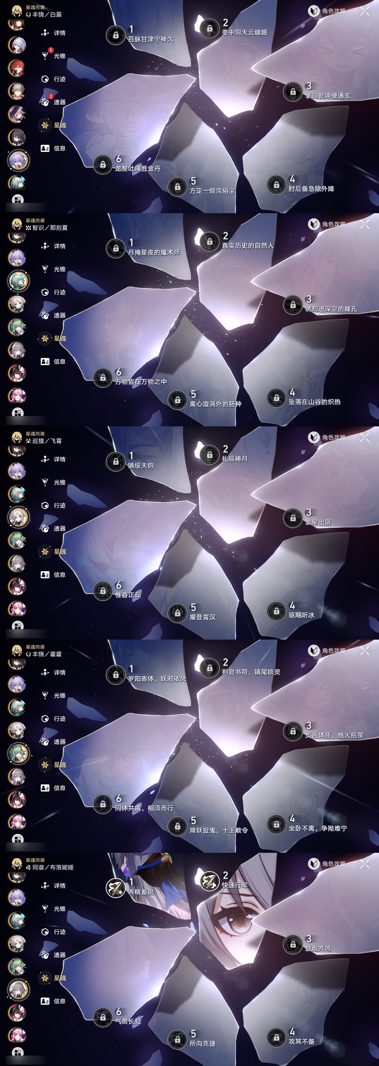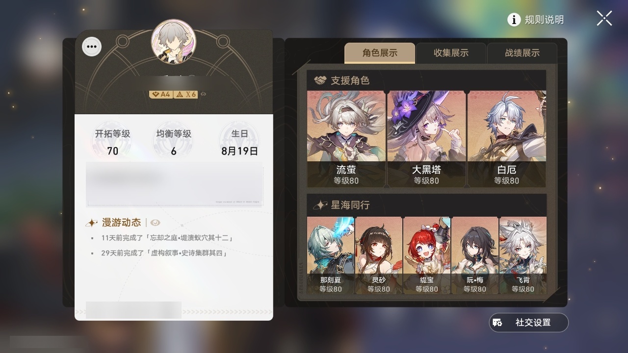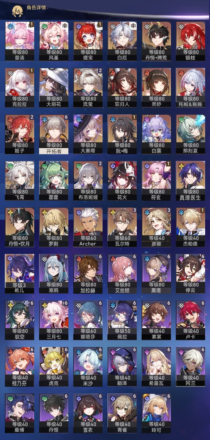 【崩坏·星穹铁道】【lyxq9704】冒险等级:70,男主,五星数量:48,五星角色:彦卿 3命瓦尔特 3命布洛妮娅 2命姬子 2命流萤 2命杰帕德 1命克拉拉 1命缇宝 1命符玄 1命昔涟 1命飞霄希儿白露灵砂大黑塔忘归人罗刹丹恒·饮月托帕账账藿藿银枝真理医生花火那刻夏风堇白厄archer丹恒·腾荒大丽花__五星光锥:星海巡航 5精记一位星神的陨落 5精不息的演算 5精孤独的疗愈 5精记忆永不落幕 5精制胜的瞬间 3精记忆的质料以世界之名以世界之名以世界之名如泥酣眠但战斗还未结束向着不可追问处长路终有归途比阳光更明亮的烦恼着,幸福着黎明恰如此燃烧爱如此刻永恒梦应归于何处__四星角色:阿兰 6命娜塔莎 6命虎克 6命貊泽 6命黑塔 6命丹恒 6命艾丝妲 6命希露瓦 6命停云 6命素裳 6命三月七 6命青雀 6命佩拉 6命驭空 6命卢卡 6命玲可 6命桂乃芬 6命寒鸦 6命雪衣 6命米沙 6命加拉赫 6命桑博21流萤击破队辅助全,白厄队