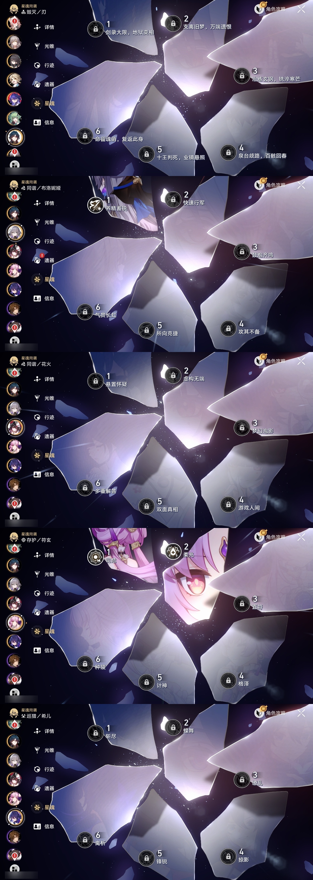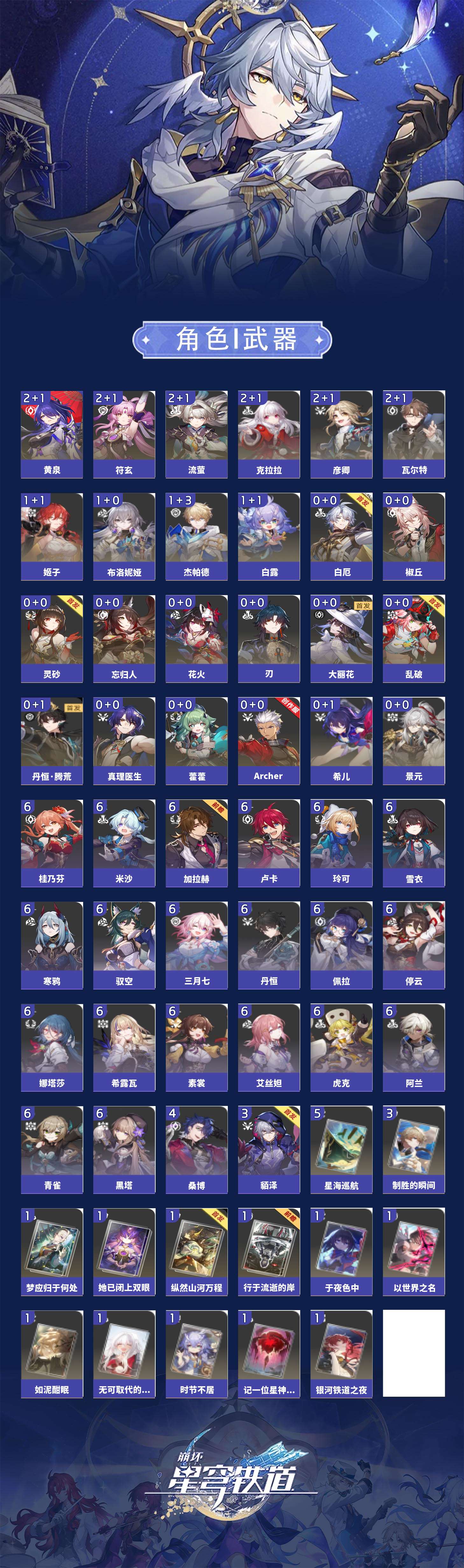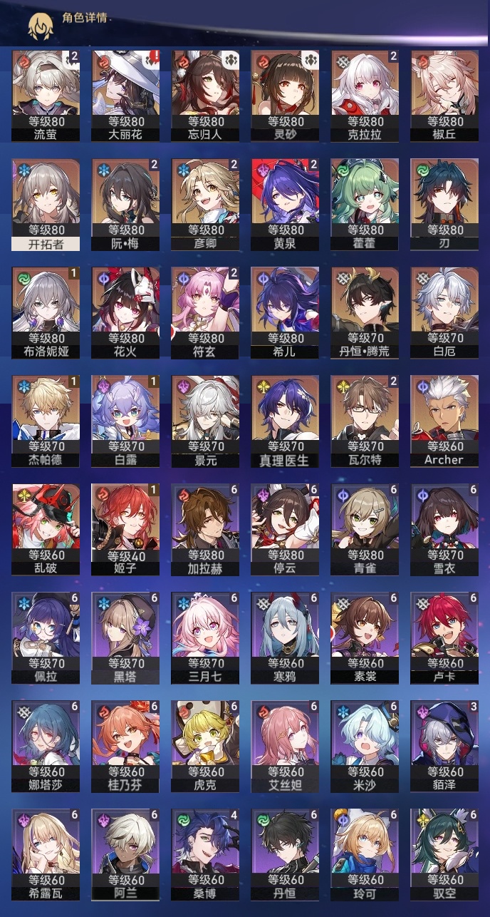 【崩坏·星穹铁道】【lyxq9700】冒险等级:70,女主,五星数量:37,五星角色:彦卿 2命瓦尔特 2命克拉拉 2命符玄 2命黄泉 2命流萤 2命白露 1命布洛妮娅 1命姬子 1命杰帕德 1命椒丘景元希儿灵砂乱破忘归人刃藿藿真理医生花火白厄archer丹恒·腾荒大丽花__五星光锥:星海巡航 5精制胜的瞬间 3精记一位星神的陨落银河铁道之夜以世界之名无可取代的东西时节不居如泥酣眠于夜色中她已闭上双眼行于流逝的岸纵然山河万程梦应归于何处__四星角色:阿兰 6命娜塔莎 6命虎克 6命黑塔 6命丹恒 6命艾丝妲 6命希露瓦 6命停云 6命素裳 6命三月七 6命青雀 6命佩拉 6命驭空 6命卢卡 6命玲可 6命桂乃芬 6命寒鸦 6命雪衣 6命米沙 6命加拉赫 6命桑博 4命貊泽 3命击破队,黄泉队