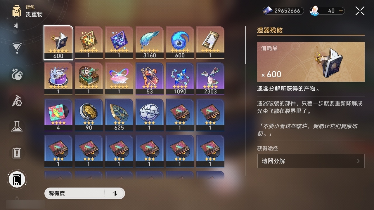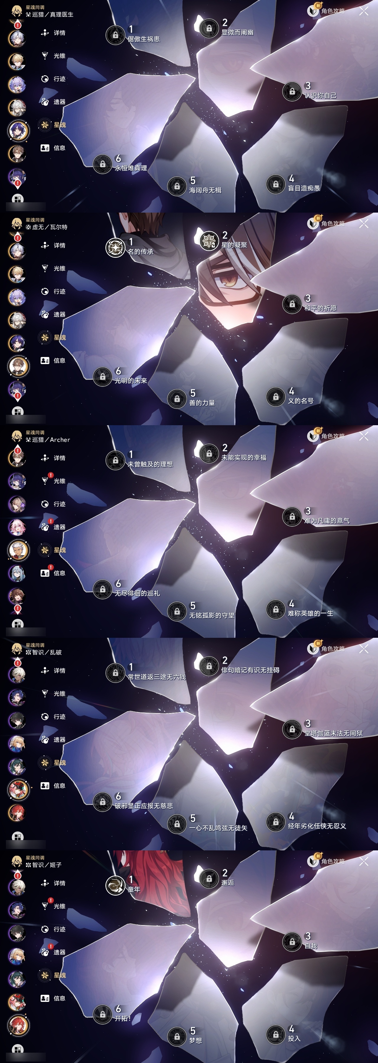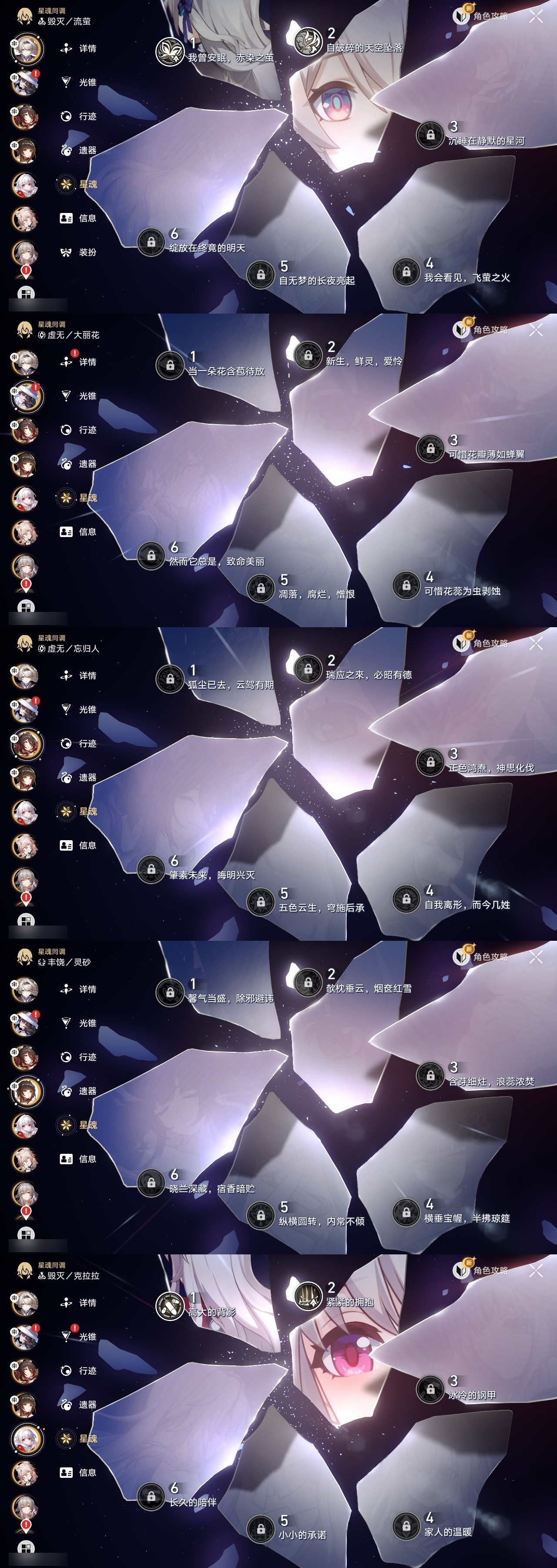 【崩坏·星穹铁道】【lyxq9700】冒险等级:70,女主,五星数量:37,五星角色:彦卿 2命瓦尔特 2命克拉拉 2命符玄 2命黄泉 2命流萤 2命白露 1命布洛妮娅 1命姬子 1命杰帕德 1命椒丘景元希儿灵砂乱破忘归人刃藿藿真理医生花火白厄archer丹恒·腾荒大丽花__五星光锥:星海巡航 5精制胜的瞬间 3精记一位星神的陨落银河铁道之夜以世界之名无可取代的东西时节不居如泥酣眠于夜色中她已闭上双眼行于流逝的岸纵然山河万程梦应归于何处__四星角色:阿兰 6命娜塔莎 6命虎克 6命黑塔 6命丹恒 6命艾丝妲 6命希露瓦 6命停云 6命素裳 6命三月七 6命青雀 6命佩拉 6命驭空 6命卢卡 6命玲可 6命桂乃芬 6命寒鸦 6命雪衣 6命米沙 6命加拉赫 6命桑博 4命貊泽 3命击破队,黄泉队