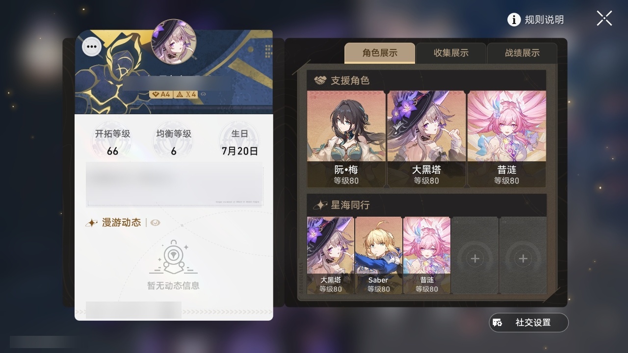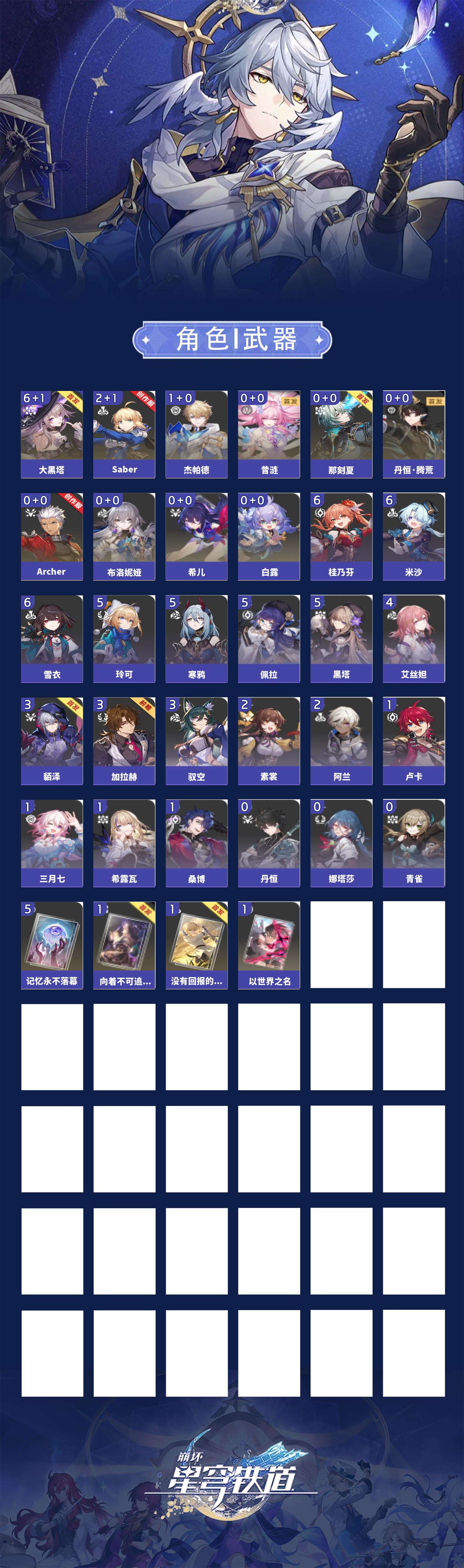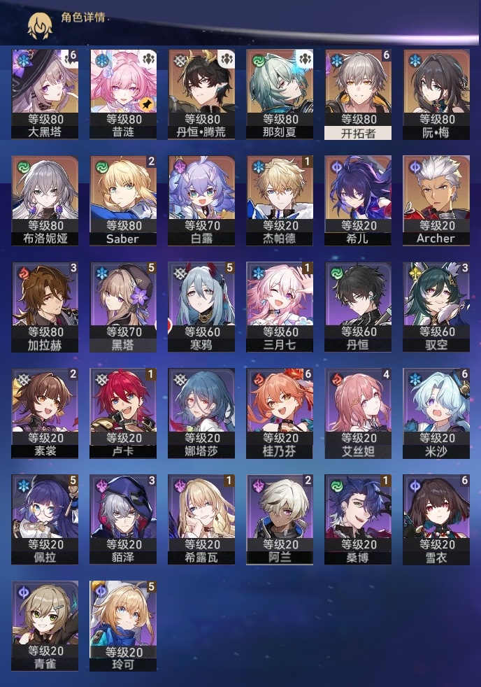 【崩坏·星穹铁道】【lyxq9730】冒险等级:66,男主,五星数量:15,五星角色:大黑塔 6命saber 2命杰帕德 1命希儿白露布洛妮娅那刻夏archer丹恒·腾荒昔涟__五星光锥:记忆永不落幕 5精不息的演算 2精以世界之名向着不可追问处没有回报的加冕__四星角色:桂乃芬 6命雪衣 6命米沙 6命黑塔 5命佩拉 5命玲可 5命寒鸦 5命艾丝妲 4命貊泽 3命驭空 3命加拉赫 3命阿兰 2命素裳 2命希露瓦 1命桑博 1命三月七 1命卢卡 1命娜塔莎丹恒青雀