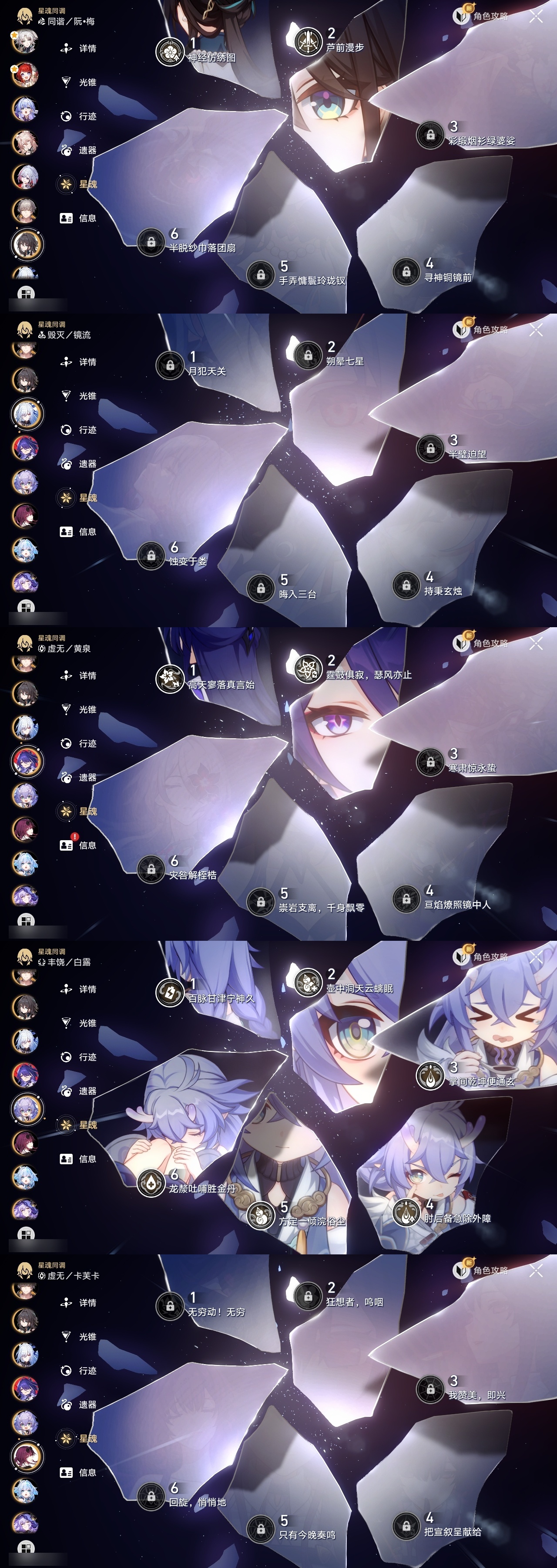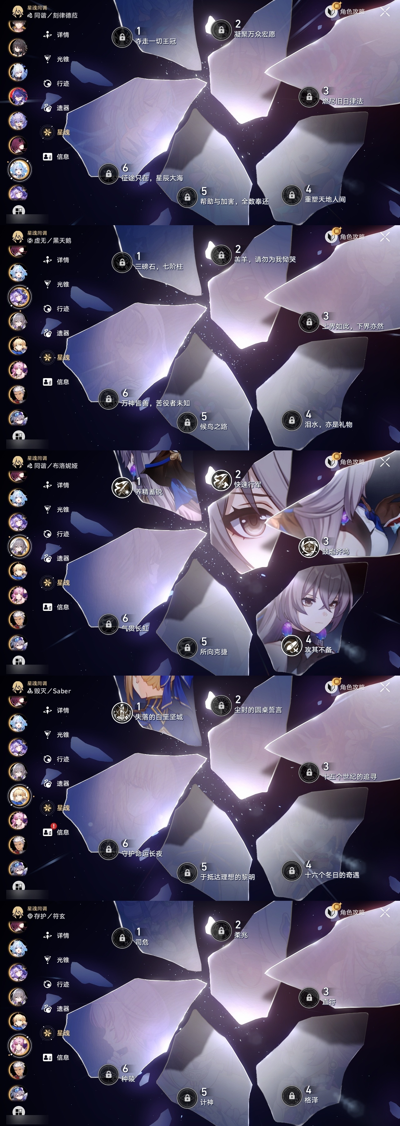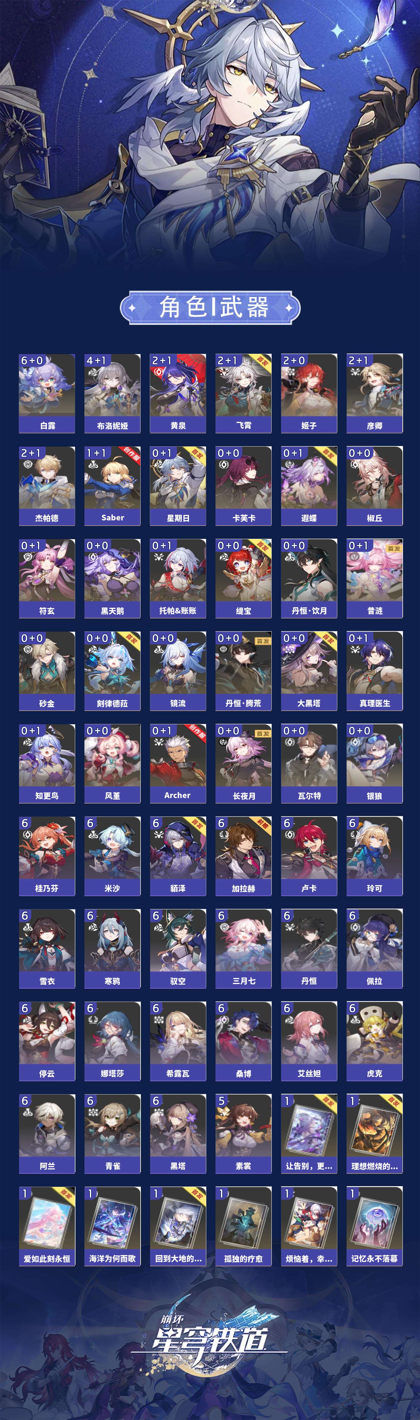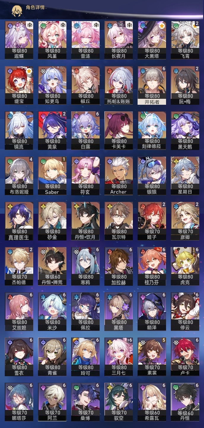 【崩坏·星穹铁道】【lyxq9720】冒险等级:70,男主,五星数量:53,五星角色:白露 6命布洛妮娅 4命飞霄 2命姬子 2命杰帕德 2命彦卿 2命黄泉 2命saber 1命椒丘银狼瓦尔特星期日大黑塔缇宝卡芙卡丹恒·饮月遐蝶符玄镜流托帕账账真理医生黑天鹅风堇砂金知更鸟archer刻律德菈长夜月丹恒·腾荒昔涟__五星光锥:星海巡航记一位星神的陨落制胜的瞬间制胜的瞬间制胜的瞬间无可取代的东西如泥酣眠但战斗还未结束我将,巡征追猎不息的演算回到大地的飞行孤独的疗愈她已闭上双眼让告别,更美一些烦恼着,幸福着纯粹思维的洗礼行于流逝的岸夜色流光溢彩记忆永不落幕理想燃烧的地狱没有回报的加冕海洋为何而歌爱如此刻永恒__四星角色:阿兰 6命娜塔莎 6命虎克 6命貊泽 6命黑塔 6命丹恒 6命艾丝妲 6命希露瓦 6命停云 6命桑博 6命三月七 6命青雀 6命佩拉 6命驭空 6命卢卡 6命玲可 6命桂乃芬 6命寒鸦 6命雪衣 6命米沙 6命加拉赫 6命素裳 5命