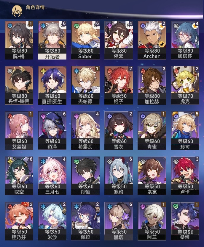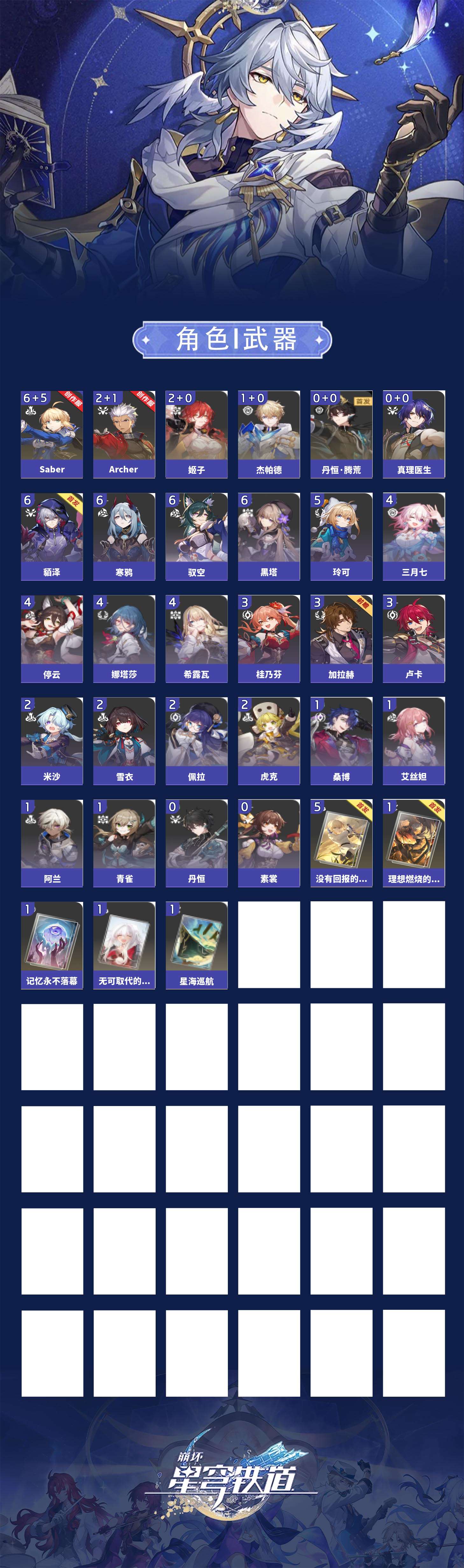 【崩坏·星穹铁道】【lyxq9719】冒险等级:65,男主,五星数量:11,五星角色:saber 6命姬子 2命archer 2命杰帕德 1命真理医生丹恒·腾荒__五星光锥:没有回报的加冕 5精星海巡航无可取代的东西记忆永不落幕理想燃烧的地狱__四星角色:貊泽 6命黑塔 6命驭空 6命寒鸦 6命玲可 5命娜塔莎 4命希露瓦 4命停云 4命三月七 4命卢卡 3命桂乃芬 3命加拉赫 3命虎克 2命佩拉 2命雪衣 2命米沙 2命阿兰 1命艾丝妲 1命桑博 1命青雀 1命丹恒素裳