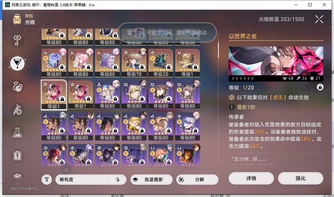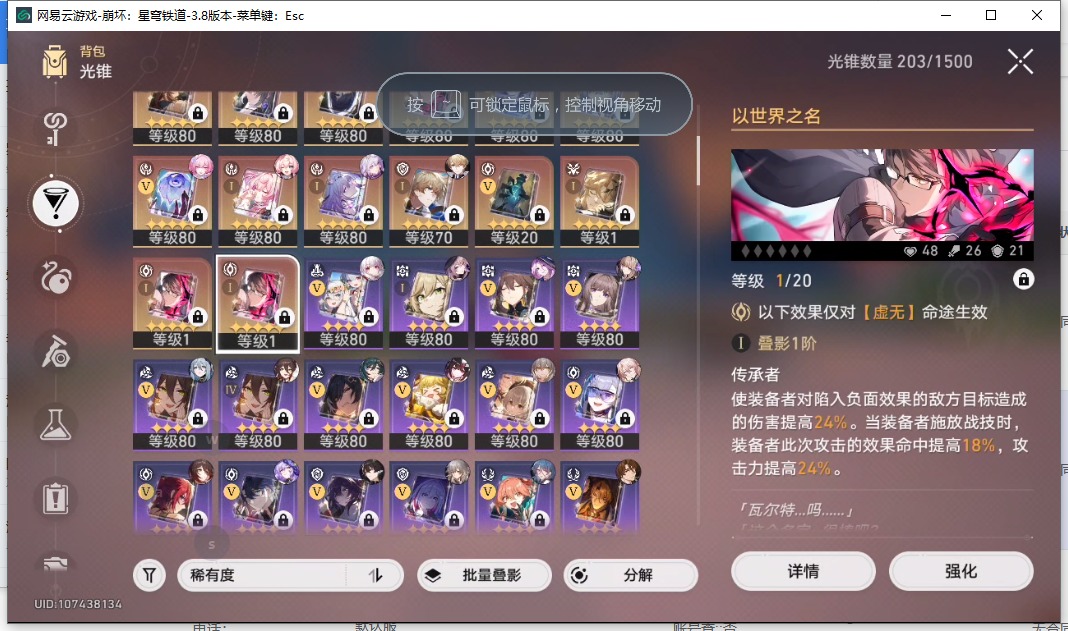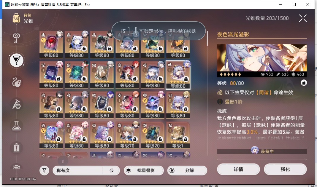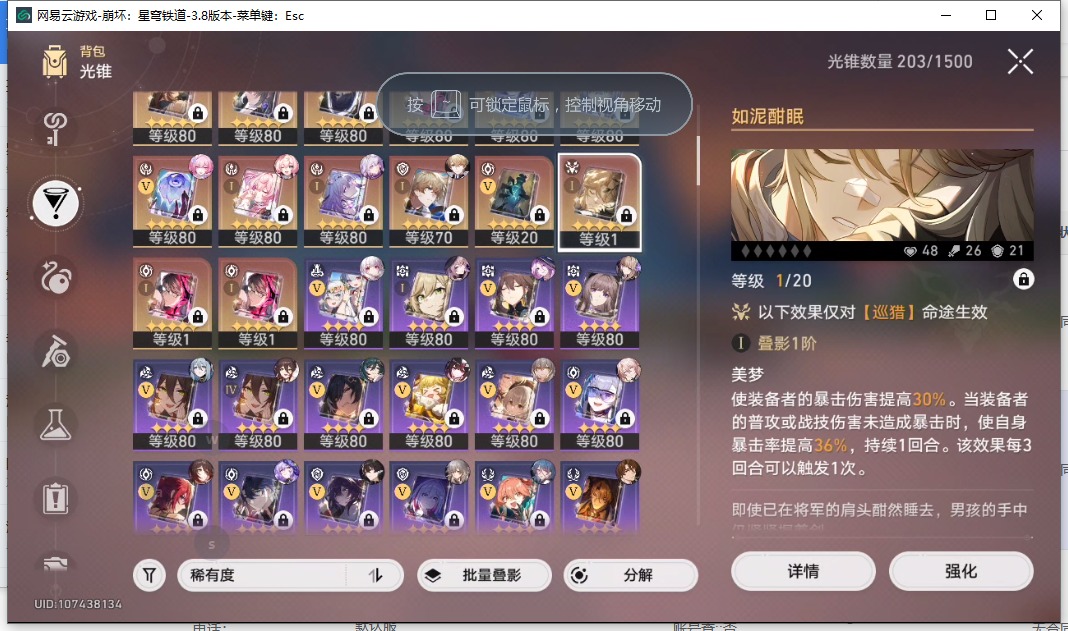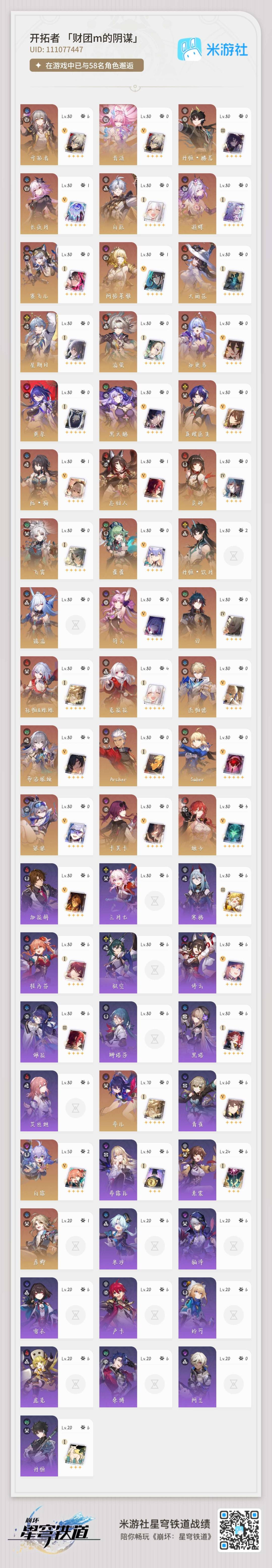 [16407206]【总黄数】108 【4命金色角色】4命布洛妮娅4命克拉拉 【3命金色角色】3命姬子 【2命金色角色】2命白露2命丹恒•饮月 【1命金色角色】1命忘归人1命阿格莱雅1命长夜月1命彦卿1命阮•梅 【0命金色角色】0命希儿0命飞霄0命灵砂0命星期日0命遐蝶0命流萤0命赛飞儿0命白厄0命saber0命archer0命丹恒·腾荒0命昔涟0命卡芙卡0命杰帕德0命银狼0命刃0命知更鸟0命托帕账账0命藿藿0命真理医生0命黑天鹅0命黄泉0命大丽花 【精5武器】精5不息的演算精5记忆永不落幕精5记忆的质料精5孤独的疗愈精5记一位星神的陨落精5星海巡航 【精3武器】精3时节不居 【精1武器】精1拂晓之前精1回到大地的飞行精1让告别,更美一些精1愿虹光永驻天空精1黎明恰如此燃烧精1理想燃烧的地狱精1夜色流光溢彩精1于夜色中精1如泥酣眠精1制胜的瞬间精1以世界之名精1但战斗还未结束精1银河铁道之夜精1比阳光更明亮的精1此身为剑精1镜中故我精1行于流逝的岸