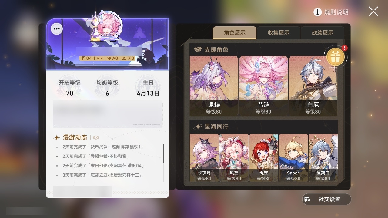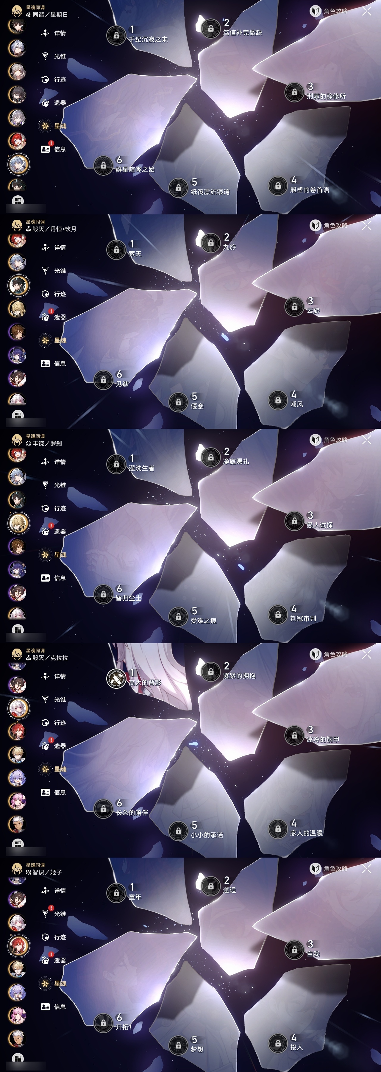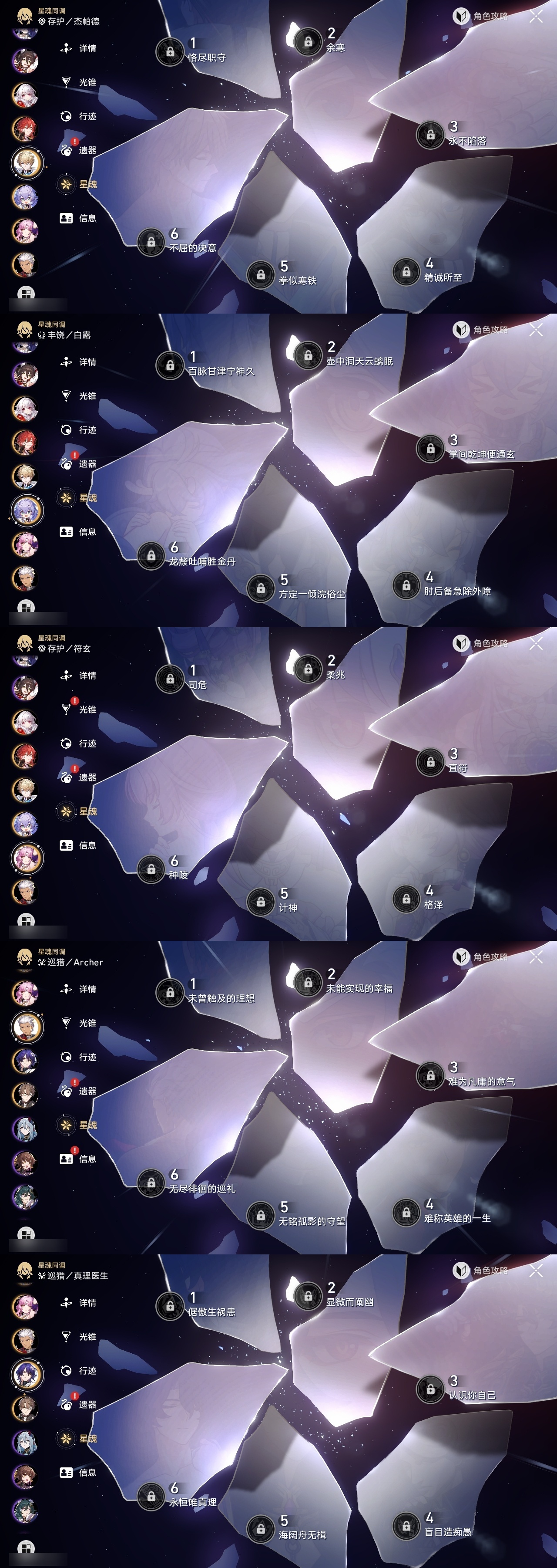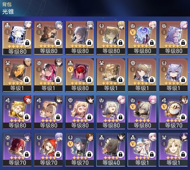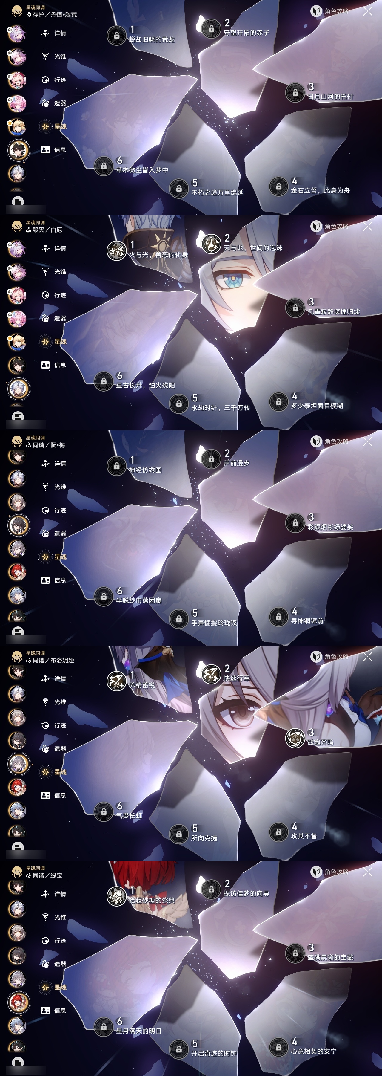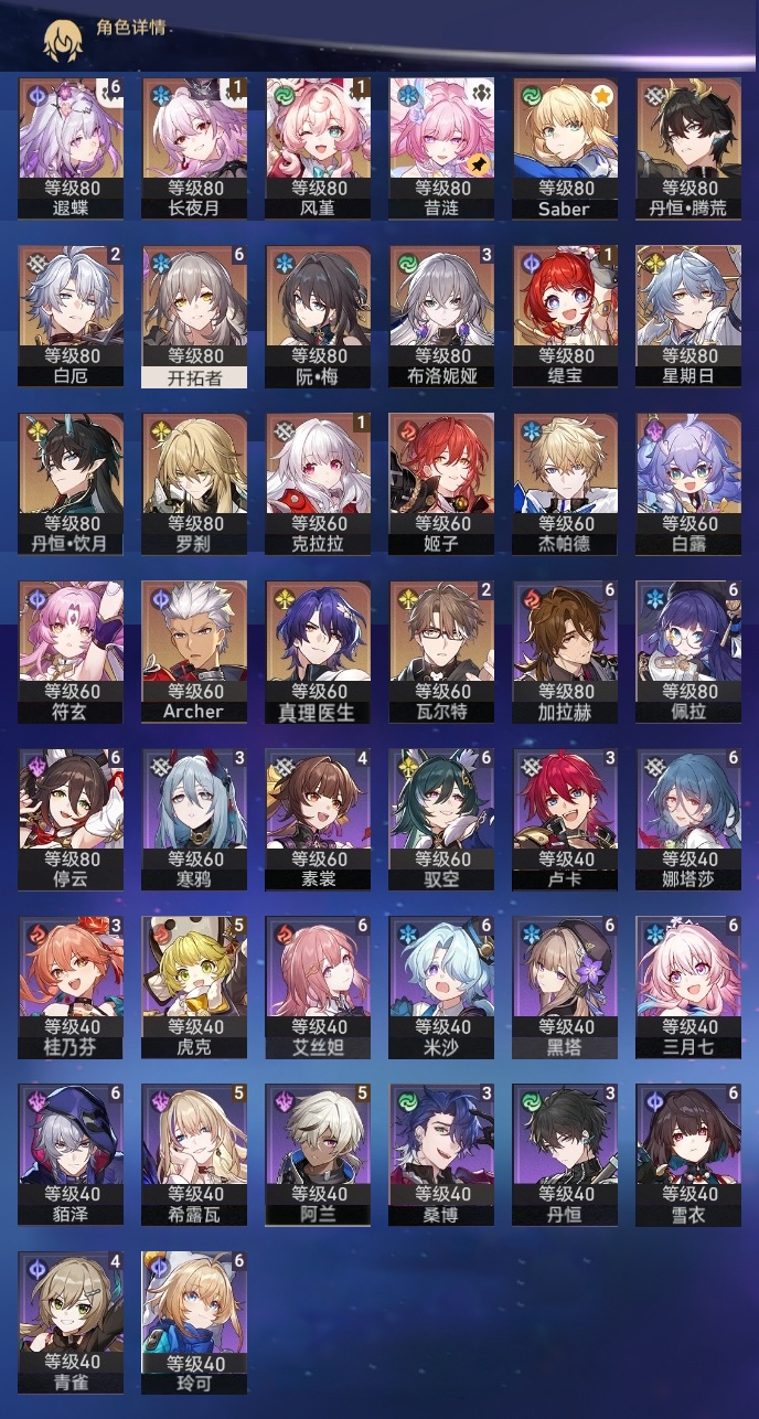 【崩坏·星穹铁道】【lyxq9755】冒险等级:70,女主,五星数量:32,五星角色:遐蝶 6命布洛妮娅 3命瓦尔特 2命白厄 2命克拉拉 1命缇宝 1命风堇 1命长夜月 1命白露姬子杰帕德星期日罗刹丹恒·饮月符玄真理医生saberarcher丹恒·腾荒昔涟__五星光锥:记一位星神的陨落 5精记忆永不落幕 5精制胜的瞬间以世界之名时节不居如泥酣眠但战斗还未结束棺的回响让告别,更美一些镜中故我黎明恰如此燃烧理想燃烧的地狱__四星角色:娜塔莎 6命貊泽 6命黑塔 6命艾丝妲 6命停云 6命三月七 6命佩拉 6命驭空 6命玲可 6命雪衣 6命米沙 6命加拉赫 6命阿兰 5命虎克 5命希露瓦 5命素裳 4命青雀 4命丹恒 3命桑博 3命卢卡 3命桂乃芬 3命寒鸦 3命满命瑕蝶记忆战舰,21白厄