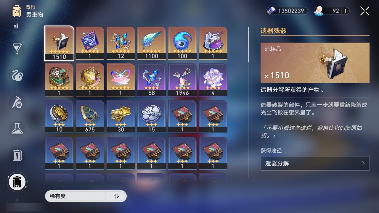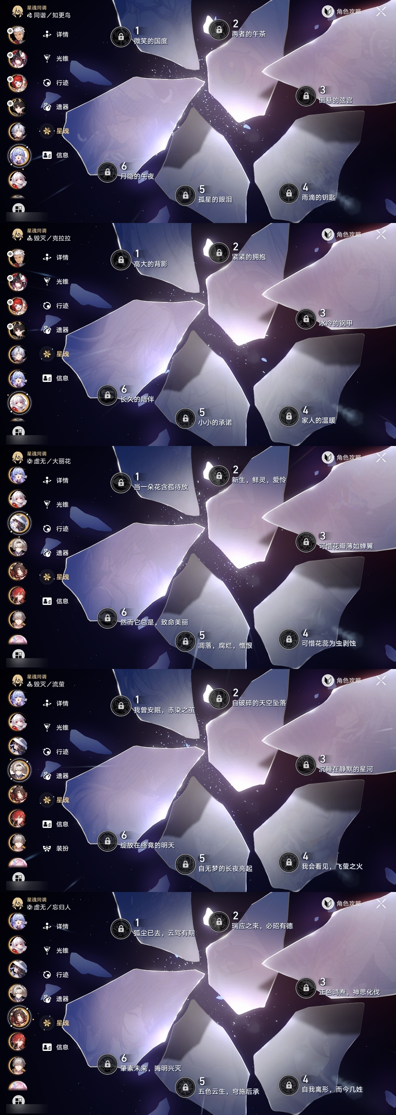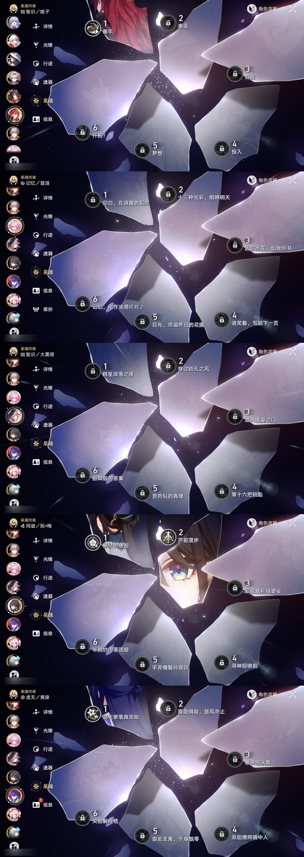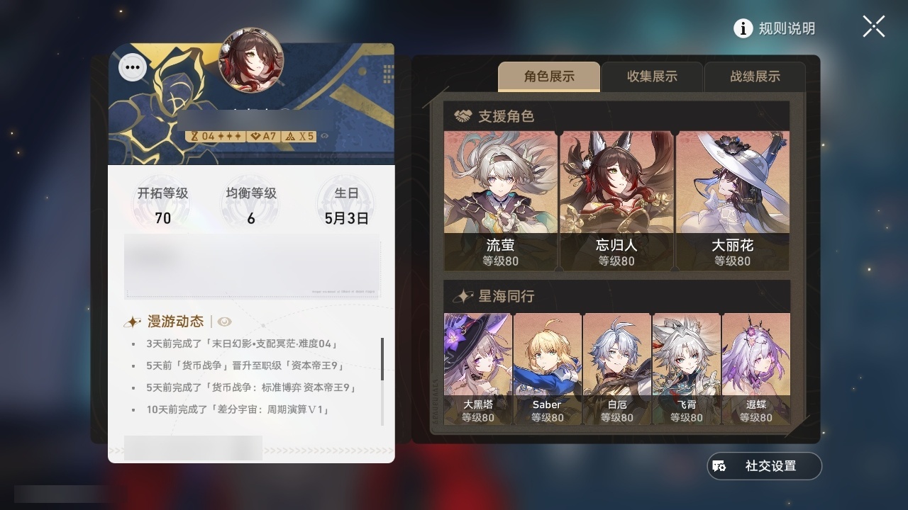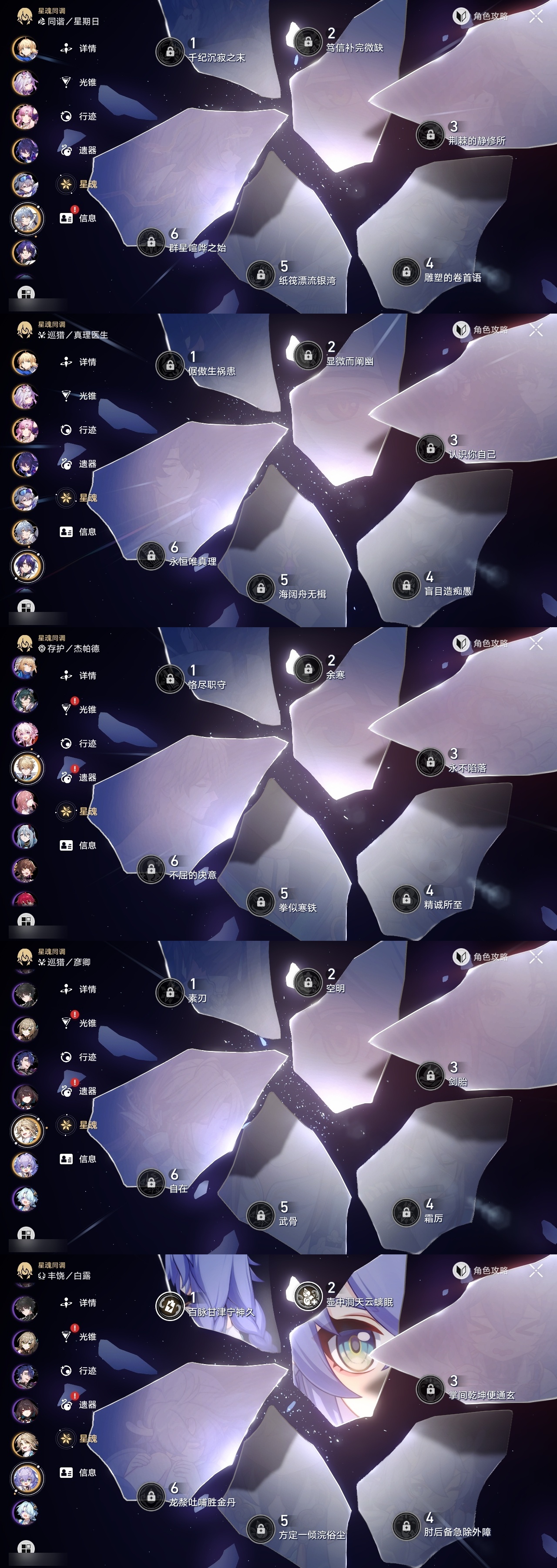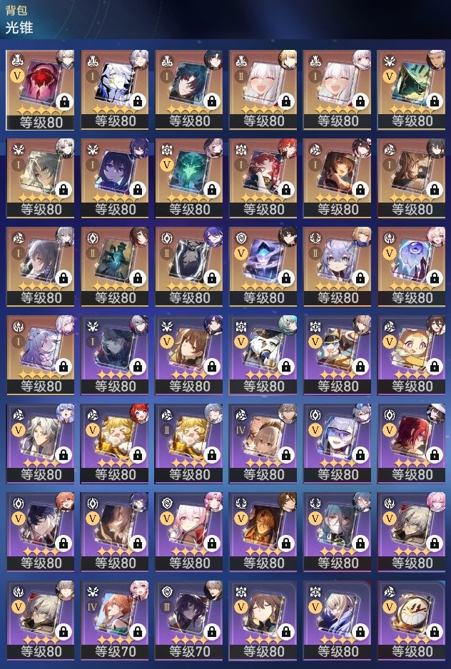 【崩坏·星穹铁道】【lyxq9775】冒险等级:70,男主,五星数量:48,五星角色:飞霄 2命白露 2命布洛妮娅 2命刃 2命希儿 1命姬子 1命遐蝶 1命黄泉 1命银狼杰帕德彦卿克拉拉星期日大黑塔忘归人缇宝符玄真理医生花火那刻夏风堇知更鸟白厄saberarcher丹恒·腾荒昔涟大丽花流萤__五星光锥:星海巡航 5精记忆的质料 5精记一位星神的陨落 5精不息的演算 5精记忆永不落幕 5精无可取代的东西 2精时节不居 2精孤独的疗愈 2精行于流逝的岸 2精银河铁道之夜无可取代的东西但战斗还未结束于夜色中我将,巡征追猎到不了的彼岸让告别,更美一些镜中故我游戏尘寰黎明恰如此燃烧__四星角色:阿兰 6命娜塔莎 6命虎克 6命貊泽 6命黑塔 6命丹恒 6命艾丝妲 6命希露瓦 6命停云 6命素裳 6命桑博 6命三月七 6命青雀 6命佩拉 6命驭空 6命卢卡 6命玲可 6命桂乃芬 6命寒鸦 6命米沙 6命加拉赫 6命雪衣 4命