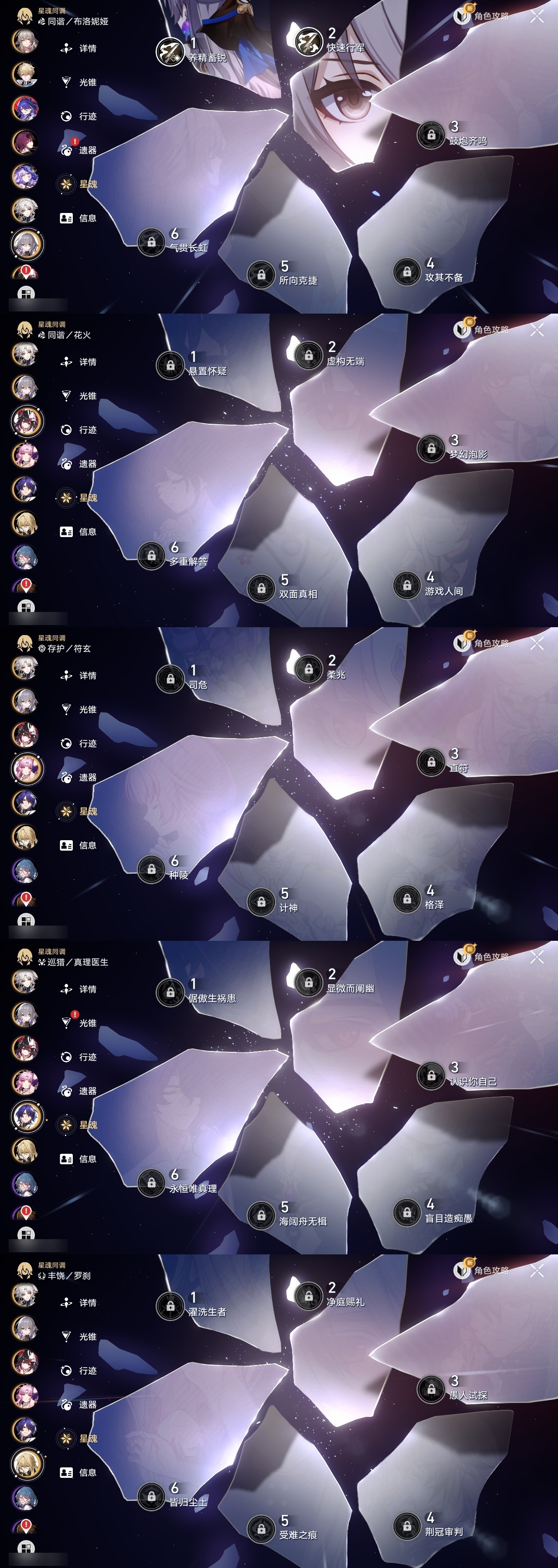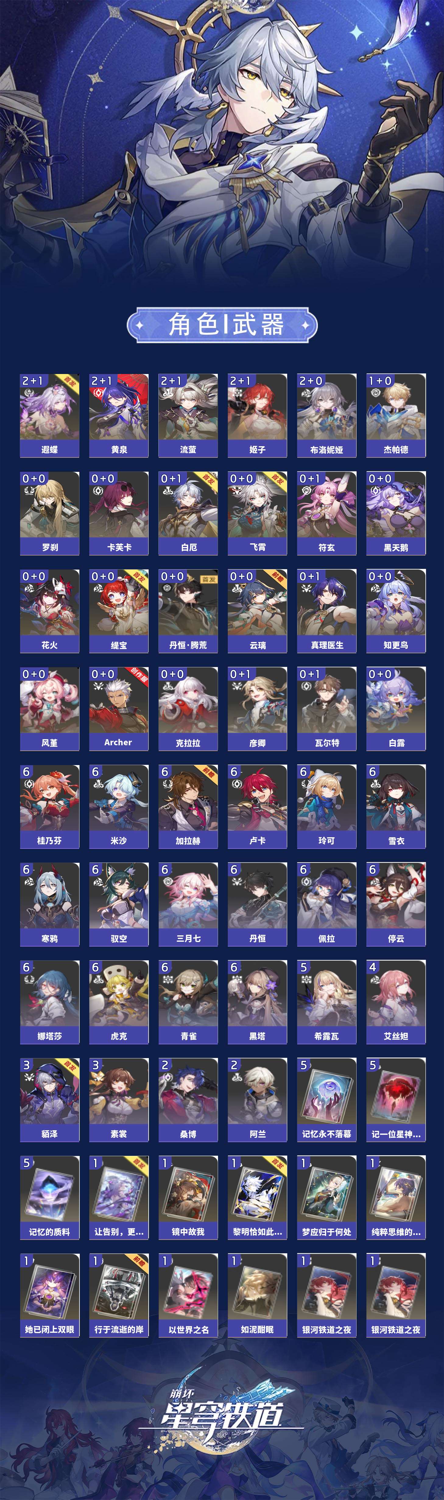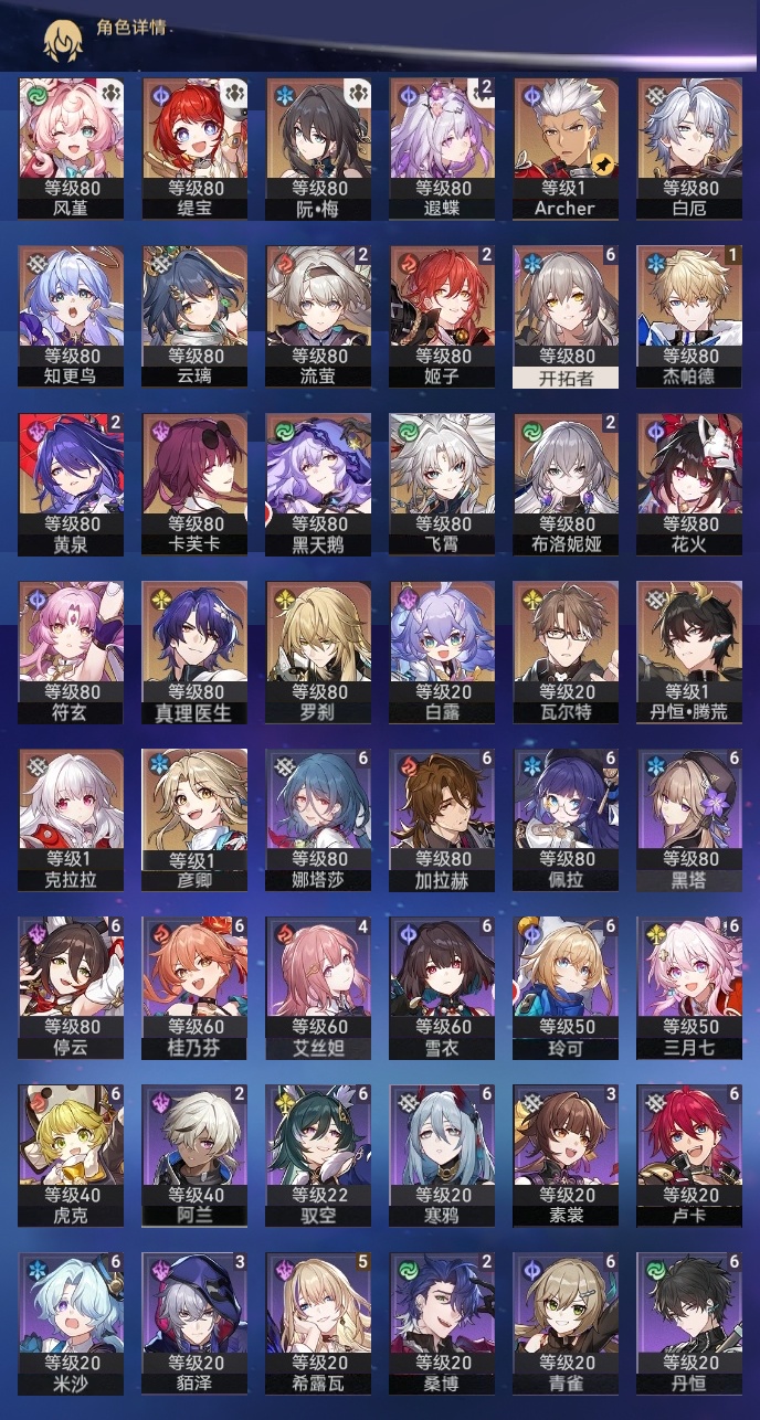 【崩坏·星穹铁道】【lyxq9757】冒险等级:70,女主,五星数量:38,五星角色:布洛妮娅 2命姬子 2命遐蝶 2命黄泉 2命流萤 2命杰帕德 1命云璃飞霄白露彦卿瓦尔特克拉拉罗刹缇宝卡芙卡符玄真理医生黑天鹅花火风堇知更鸟白厄archer丹恒·腾荒__五星光锥:记忆的质料 5精记一位星神的陨落 5精记忆永不落幕 5精银河铁道之夜银河铁道之夜以世界之名如泥酣眠她已闭上双眼让告别,更美一些镜中故我纯粹思维的洗礼行于流逝的岸黎明恰如此燃烧梦应归于何处__四星角色:娜塔莎 6命虎克 6命黑塔 6命丹恒 6命停云 6命三月七 6命青雀 6命佩拉 6命驭空 6命卢卡 6命玲可 6命桂乃芬 6命寒鸦 6命雪衣 6命米沙 6命加拉赫 6命希露瓦 5命艾丝妲 4命貊泽 3命素裳 3命阿兰 2命桑博 2命记忆队,黄泉队,击破队