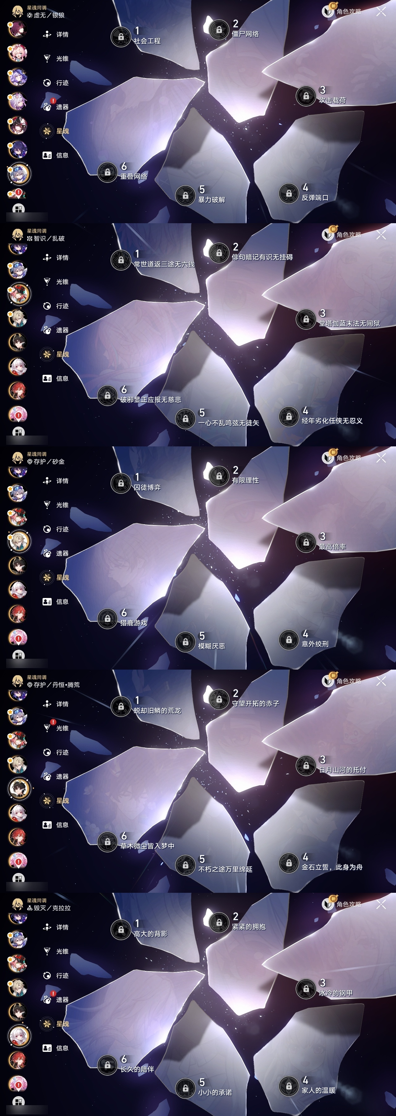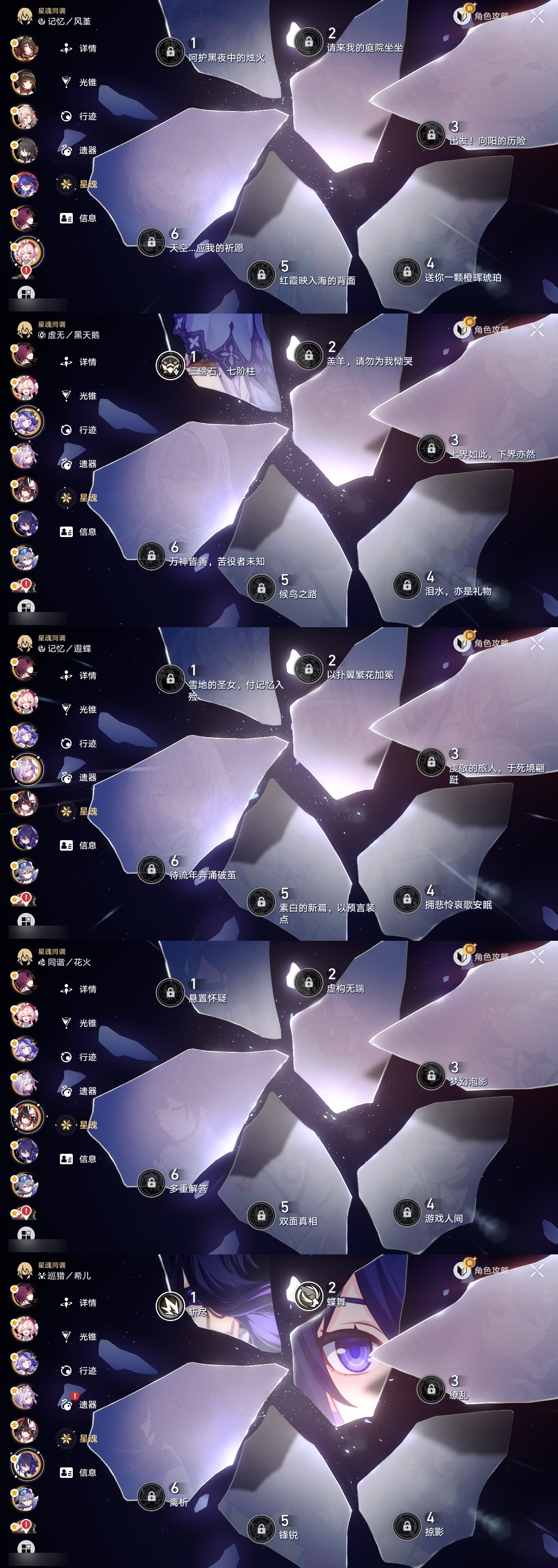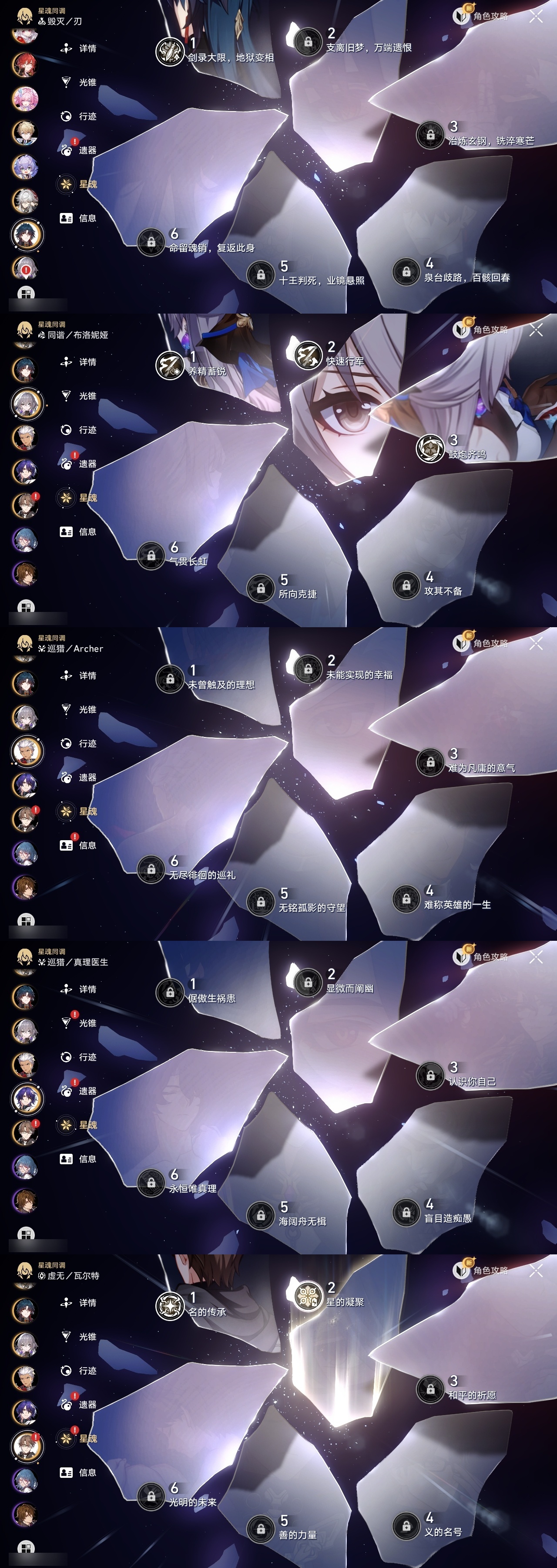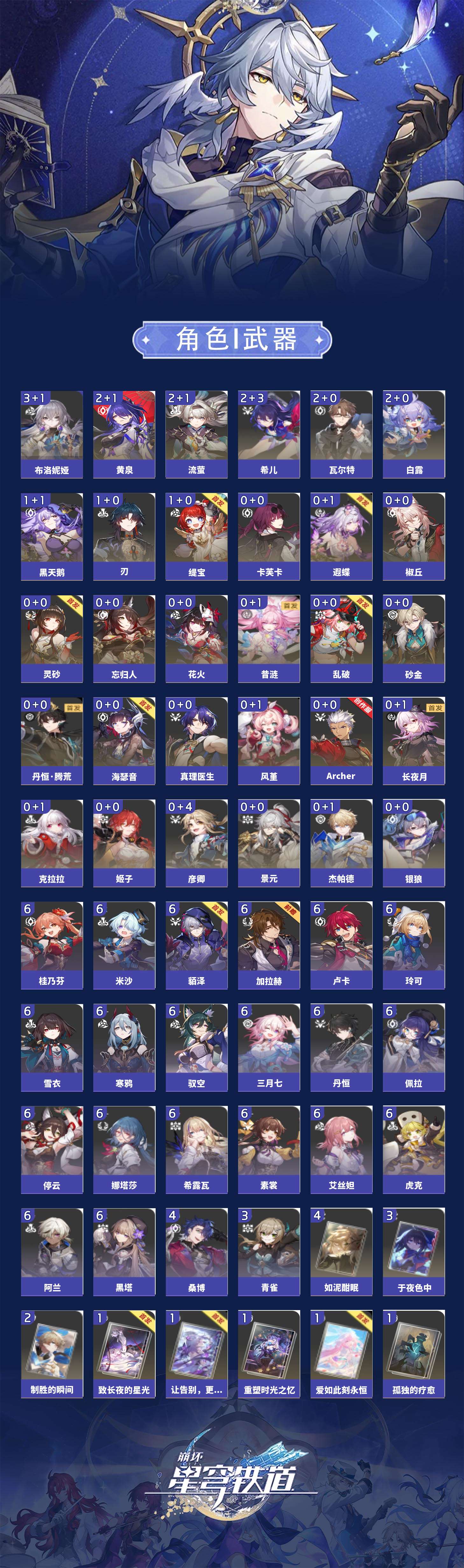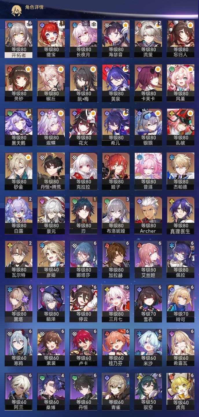 【崩坏·星穹铁道】【lyxq9774】冒险等级:70,女主,五星数量:48,五星角色:布洛妮娅 3命希儿 2命白露 2命瓦尔特 2命黄泉 2命流萤 2命缇宝 1命刃 1命黑天鹅 1命椒丘银狼景元姬子灵砂杰帕德彦卿克拉拉乱破忘归人卡芙卡遐蝶真理医生花火风堇砂金archer海瑟音长夜月丹恒·腾荒昔涟__五星光锥:如泥酣眠 4精于夜色中 3精制胜的瞬间 2精星海巡航记忆的质料制胜的瞬间无可取代的东西但战斗还未结束不息的演算孤独的疗愈让告别,更美一些重塑时光之忆行于流逝的岸愿虹光永驻天空记忆永不落幕致长夜的星光爱如此刻永恒梦应归于何处__四星角色:阿兰 6命娜塔莎 6命虎克 6命貊泽 6命黑塔 6命丹恒 6命艾丝妲 6命希露瓦 6命停云 6命素裳 6命三月七 6命佩拉 6命驭空 6命卢卡 6命玲可 6命桂乃芬 6命寒鸦 6命雪衣 6命米沙 6命加拉赫 6命桑博 4命青雀 3命21黄泉队,21击破队,全01记忆战舰