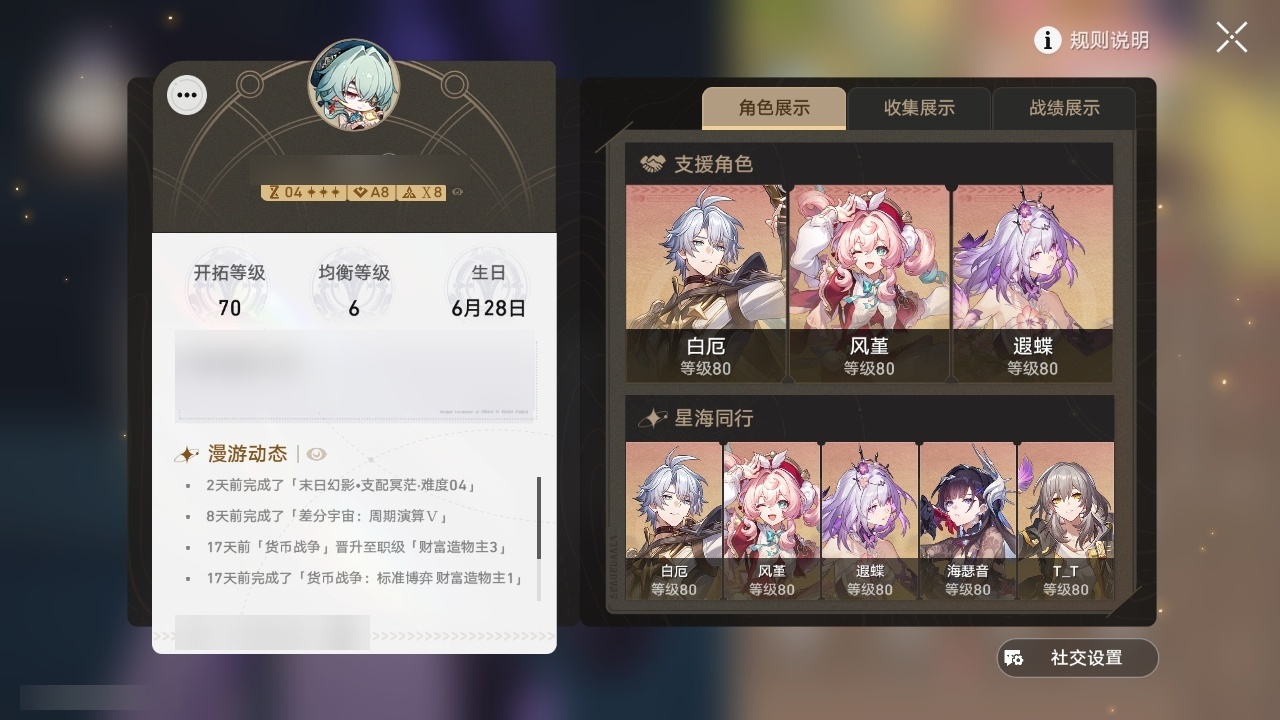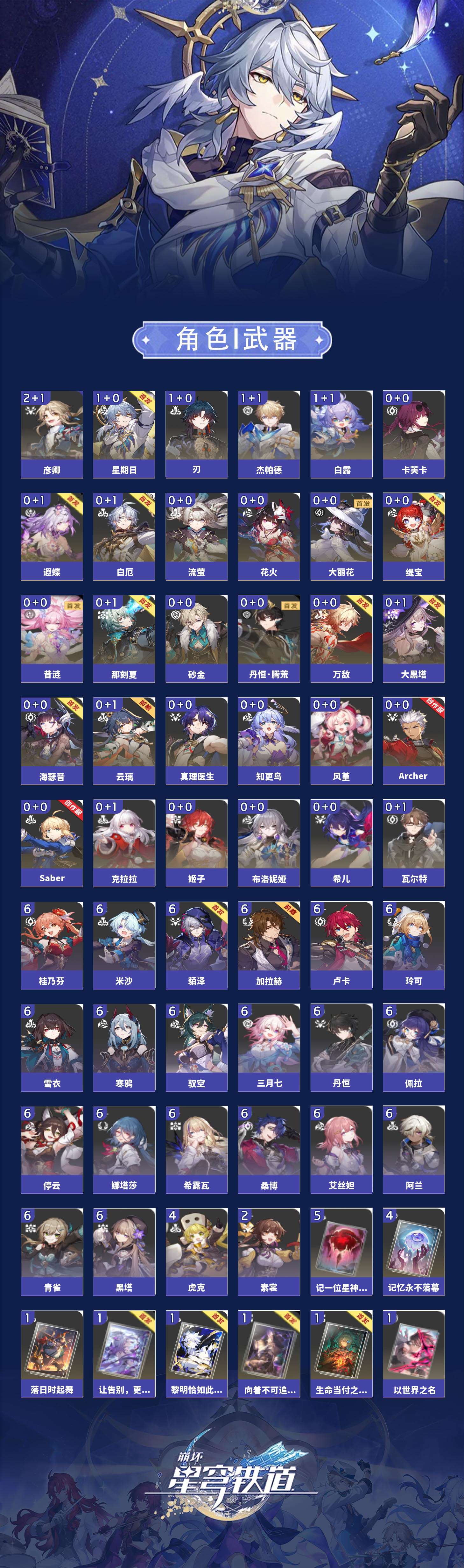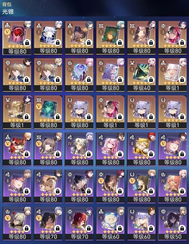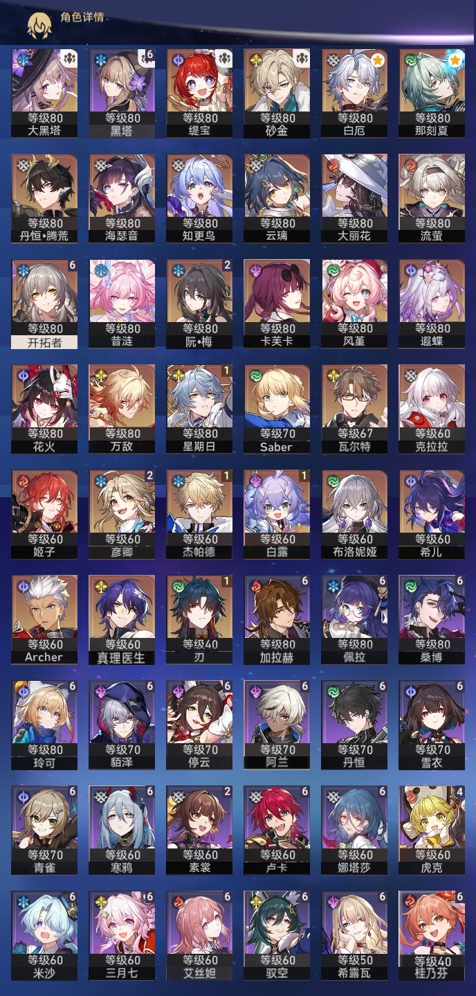 【崩坏·星穹铁道】【lyxq9803】冒险等级:70,女主,五星数量:48,五星角色:彦卿 2命白露 1命杰帕德 1命星期日 1命刃 1命云璃希儿布洛妮娅姬子瓦尔特克拉拉大黑塔缇宝万敌卡芙卡遐蝶真理医生花火那刻夏风堇砂金知更鸟白厄saberarcher海瑟音丹恒·腾荒昔涟大丽花流萤__五星光锥:记一位星神的陨落 5精不息的演算 5精记忆永不落幕 4精落日时起舞星海巡航制胜的瞬间制胜的瞬间以世界之名以世界之名无可取代的东西时节不居时节不居时节不居如泥酣眠向着不可追问处让告别,更美一些生命当付之一炬黎明恰如此燃烧__四星角色:阿兰 6命娜塔莎 6命貊泽 6命黑塔 6命丹恒 6命艾丝妲 6命希露瓦 6命停云 6命桑博 6命三月七 6命青雀 6命佩拉 6命驭空 6命卢卡 6命玲可 6命桂乃芬 6命寒鸦 6命雪衣 6命米沙 6命加拉赫 6命虎克 4命素裳 2命记忆战舰,大黑塔队,击破队