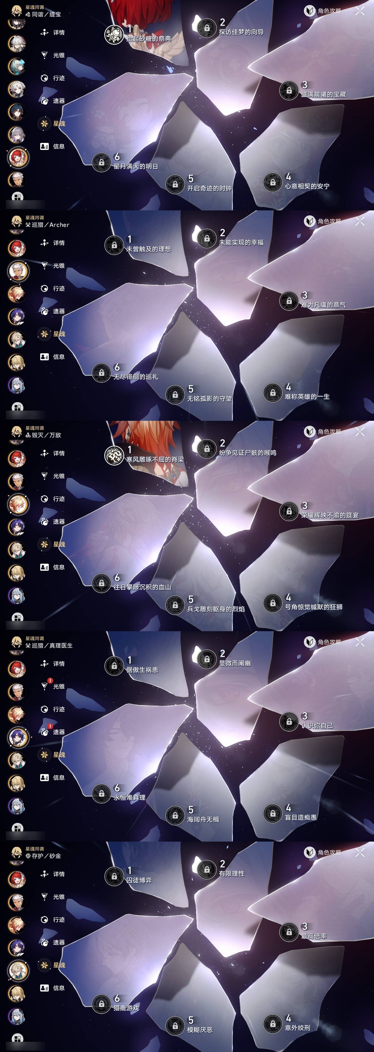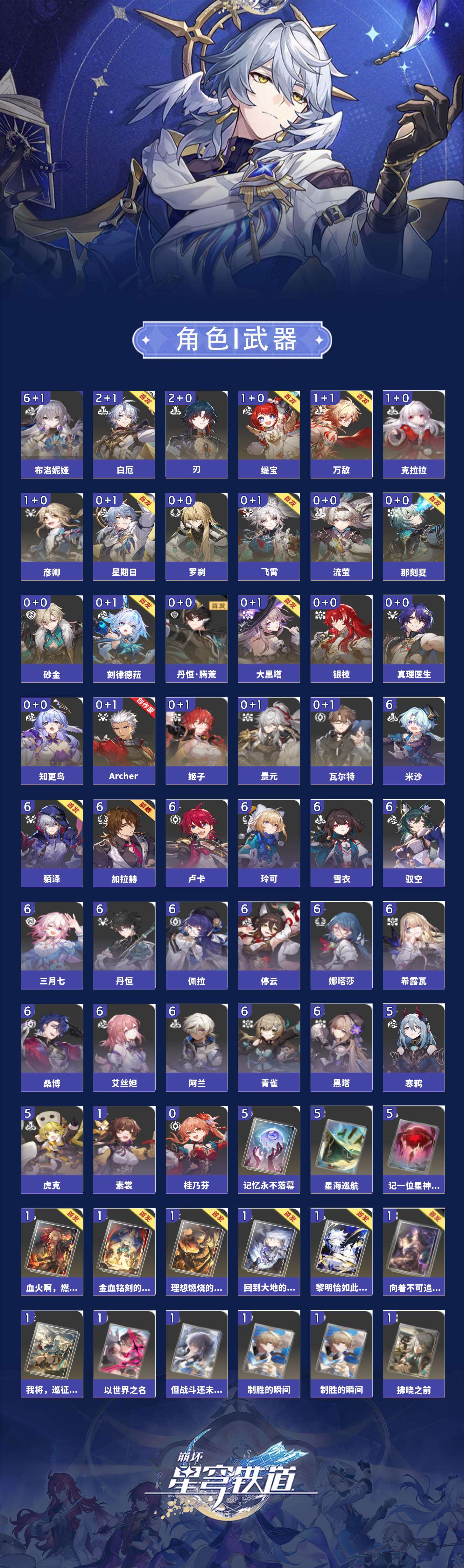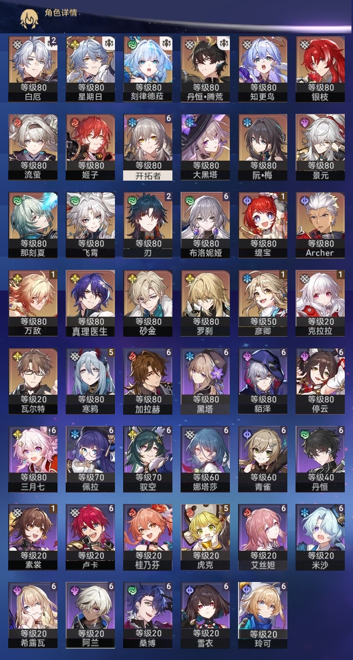 【崩坏·星穹铁道】【lyxq9814】冒险等级:70,女主,五星数量:40,五星角色:布洛妮娅 6命刃 2命白厄 2命彦卿 1命克拉拉 1命缇宝 1命万敌 1命飞霄景元姬子瓦尔特星期日大黑塔罗刹银枝真理医生那刻夏砂金知更鸟archer刻律德菈丹恒·腾荒流萤__五星光锥:星海巡航 5精记一位星神的陨落 5精记忆永不落幕 5精制胜的瞬间制胜的瞬间银河铁道之夜以世界之名时节不居但战斗还未结束拂晓之前我将,巡征追猎回到大地的飞行向着不可追问处血火啊,燃烧前路黎明恰如此燃烧理想燃烧的地狱金血铭刻的时代__四星角色:阿兰 6命娜塔莎 6命貊泽 6命黑塔 6命丹恒 6命艾丝妲 6命希露瓦 6命停云 6命桑博 6命三月七 6命青雀 6命佩拉 6命驭空 6命卢卡 6命玲可 6命雪衣 6命米沙 6命加拉赫 6命虎克 5命寒鸦 5命素裳 1命桂乃芬二命白厄队伍