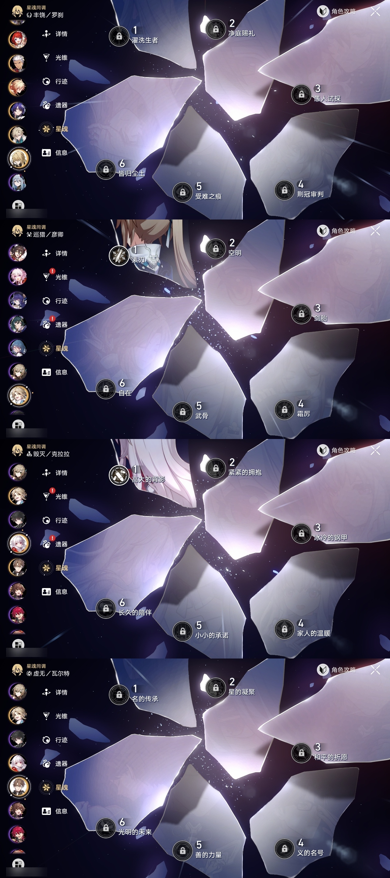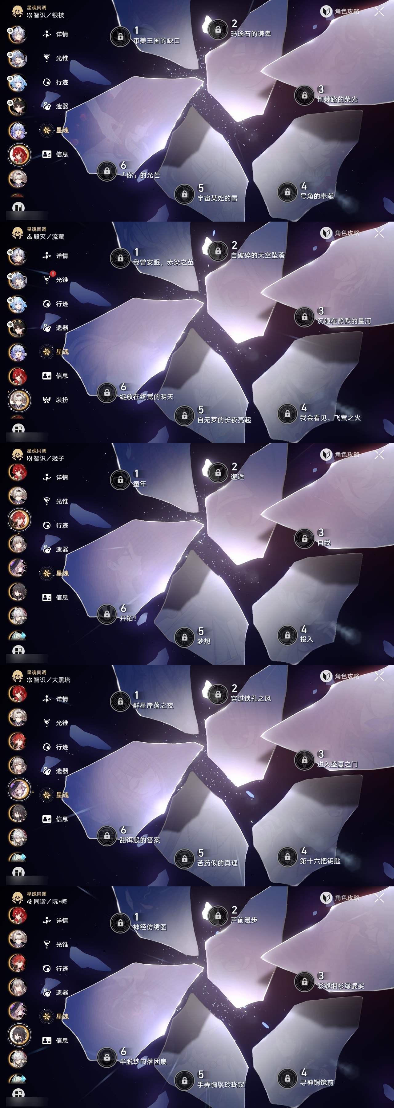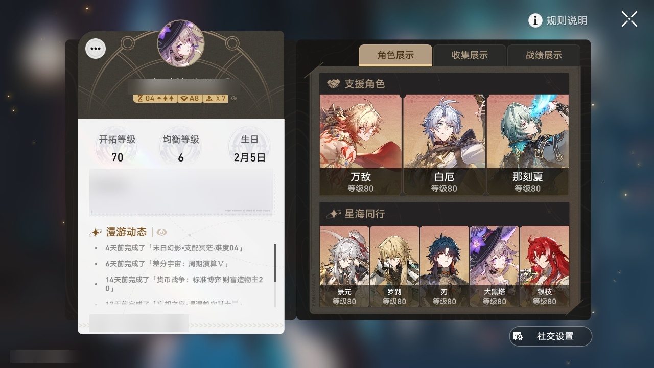 【崩坏·星穹铁道】【lyxq9814】冒险等级:70,女主,五星数量:40,五星角色:布洛妮娅 6命刃 2命白厄 2命彦卿 1命克拉拉 1命缇宝 1命万敌 1命飞霄景元姬子瓦尔特星期日大黑塔罗刹银枝真理医生那刻夏砂金知更鸟archer刻律德菈丹恒·腾荒流萤__五星光锥:星海巡航 5精记一位星神的陨落 5精记忆永不落幕 5精制胜的瞬间制胜的瞬间银河铁道之夜以世界之名时节不居但战斗还未结束拂晓之前我将,巡征追猎回到大地的飞行向着不可追问处血火啊,燃烧前路黎明恰如此燃烧理想燃烧的地狱金血铭刻的时代__四星角色:阿兰 6命娜塔莎 6命貊泽 6命黑塔 6命丹恒 6命艾丝妲 6命希露瓦 6命停云 6命桑博 6命三月七 6命青雀 6命佩拉 6命驭空 6命卢卡 6命玲可 6命雪衣 6命米沙 6命加拉赫 6命虎克 5命寒鸦 5命素裳 1命桂乃芬二命白厄队伍