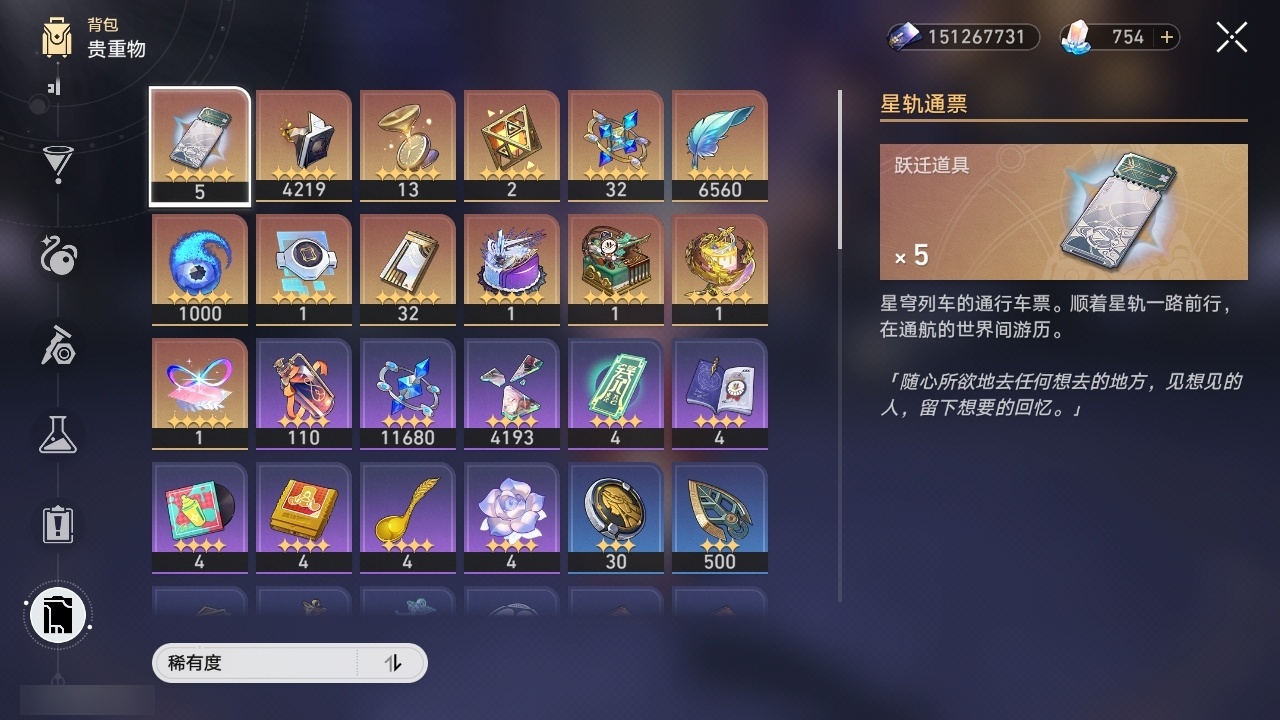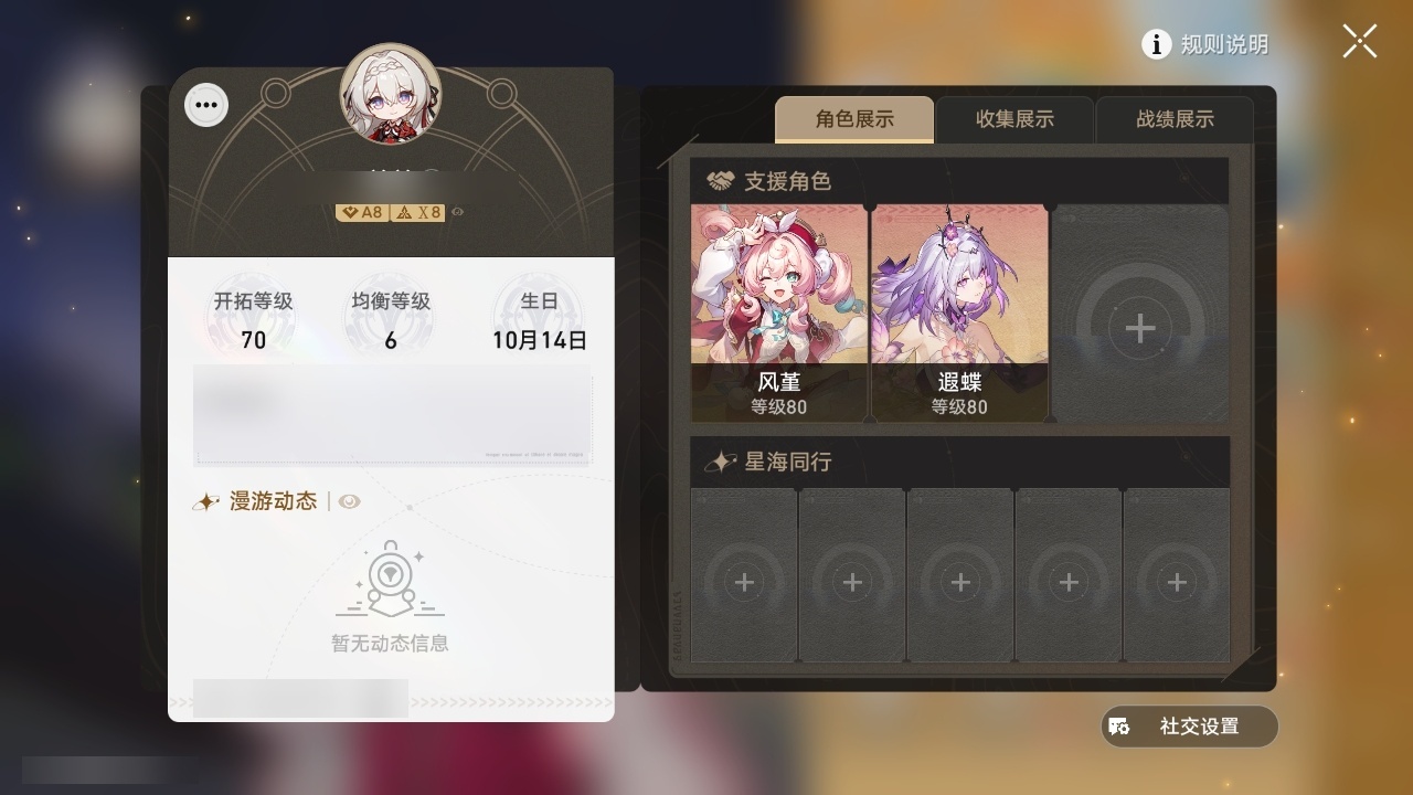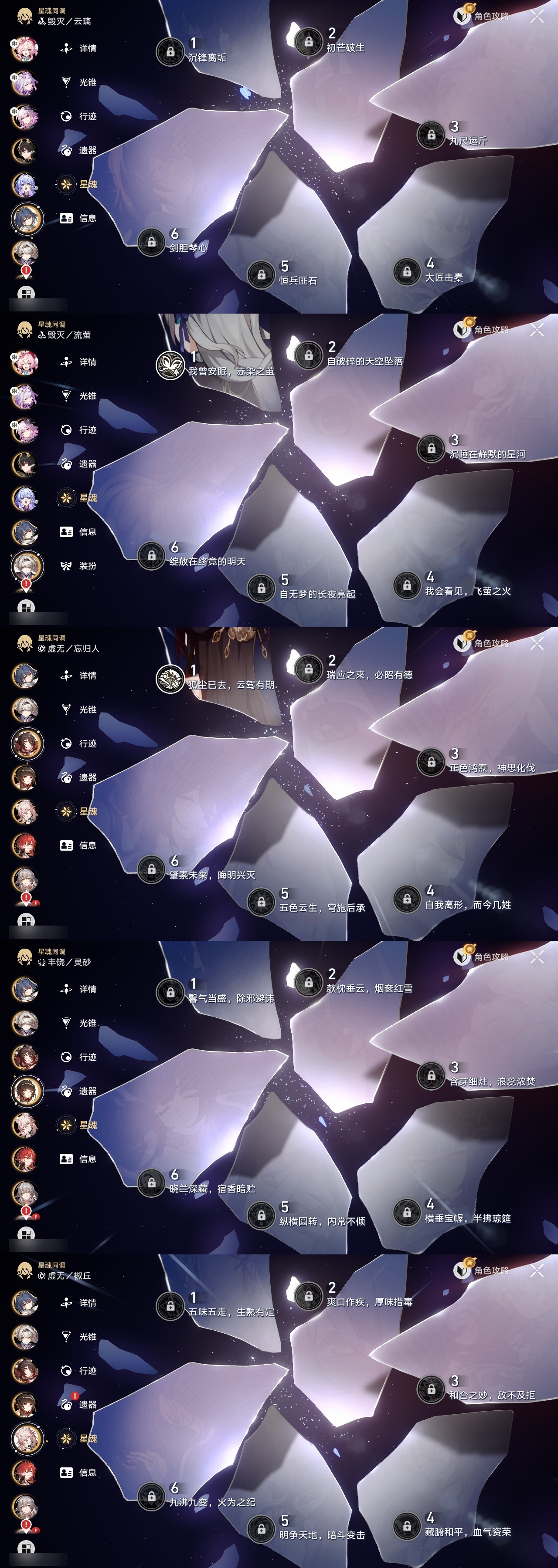 【崩坏·星穹铁道】【lyxq9806】冒险等级:70,女主,五星数量:51,五星角色:姬子 3命瓦尔特 3命布洛妮娅 2命遐蝶 2命黄泉 2命希儿 1命杰帕德 1命克拉拉 1命忘归人 1命符玄 1命流萤 1命云璃椒丘银狼白露灵砂星期日缇宝卡芙卡托帕账账藿藿真理医生花火风堇知更鸟saberarcher长夜月丹恒·腾荒昔涟__五星光锥:记忆的质料 5精记一位星神的陨落 5精记忆永不落幕 5精孤独的疗愈 4精星海巡航 2精制胜的瞬间银河铁道之夜时节不居如泥酣眠于夜色中长路终有归途将光阴织成黄金只需等待让告别,更美一些镜中故我游戏尘寰行于流逝的岸愿虹光永驻天空夜色流光溢彩没有回报的加冕勿忘她的火焰__四星角色:娜塔莎 6命虎克 6命黑塔 6命丹恒 6命希露瓦 6命停云 6命素裳 6命桑博 6命三月七 6命青雀 6命佩拉 6命驭空 6命卢卡 6命玲可 6命寒鸦 6命雪衣 6命米沙 6命加拉赫 6命桂乃芬 5命阿兰 4命貊泽 3命艾丝妲 3命二命遐蝶记忆战舰队 二命黄泉队伍