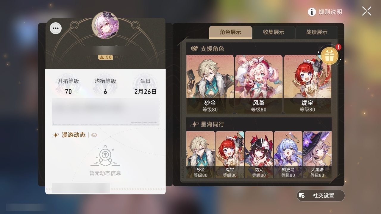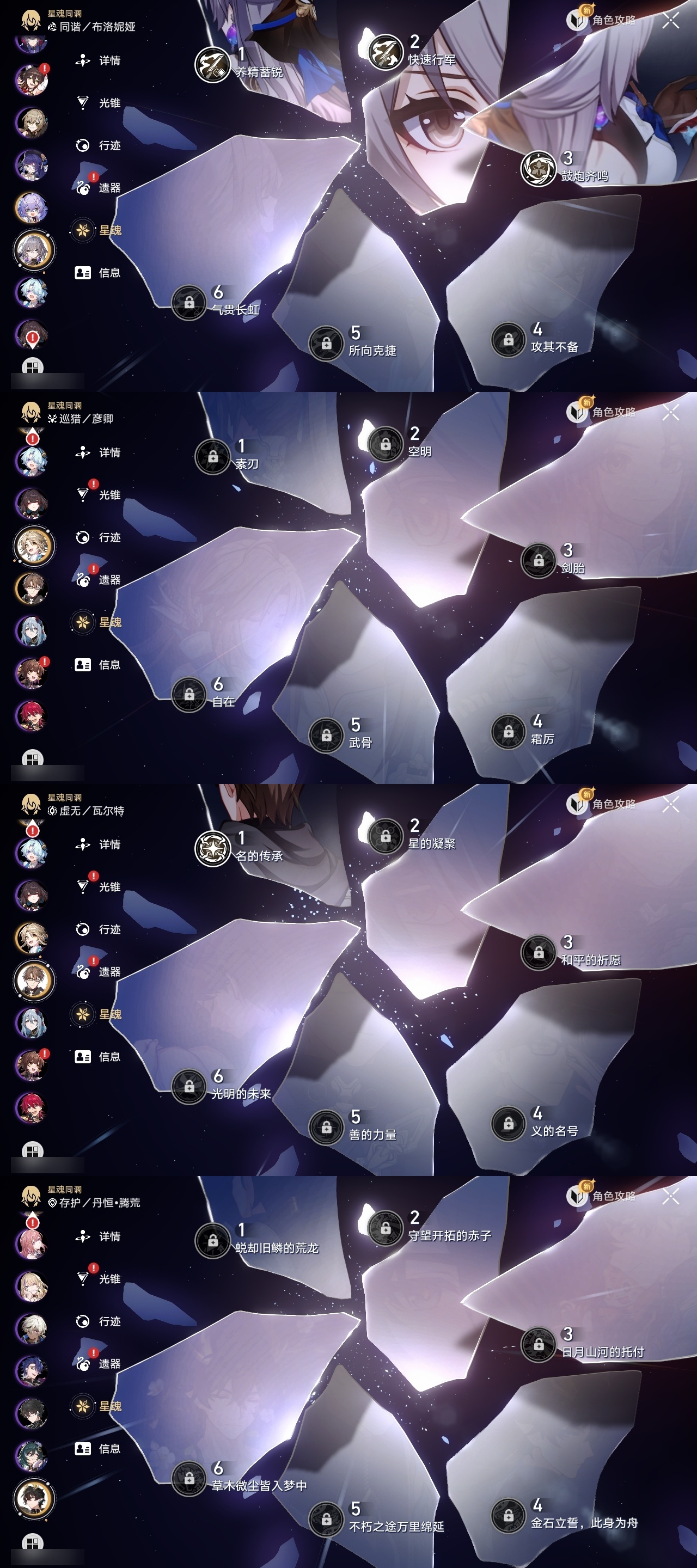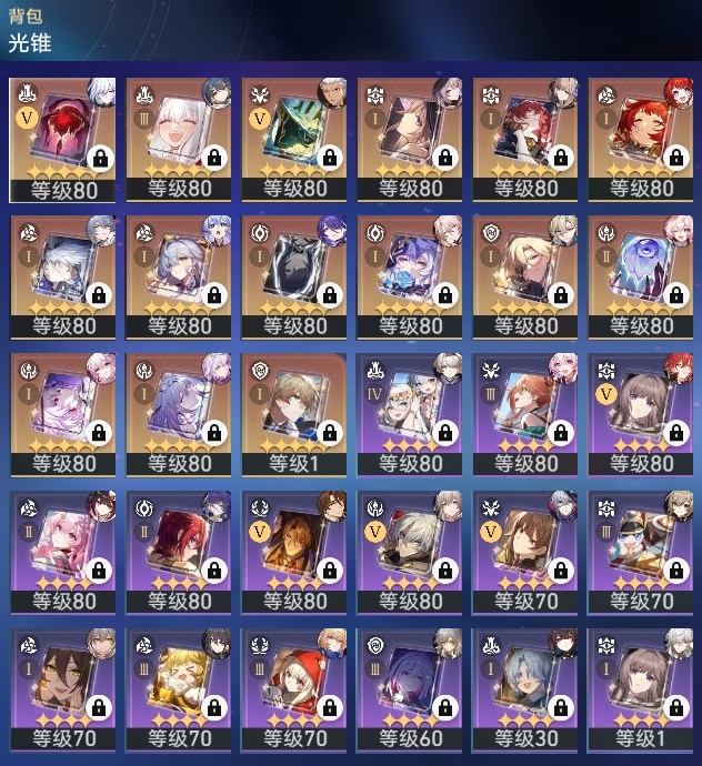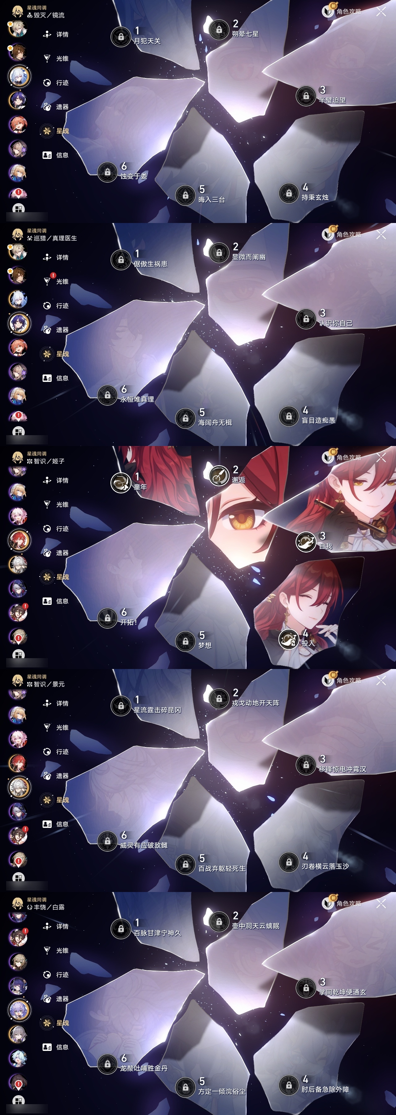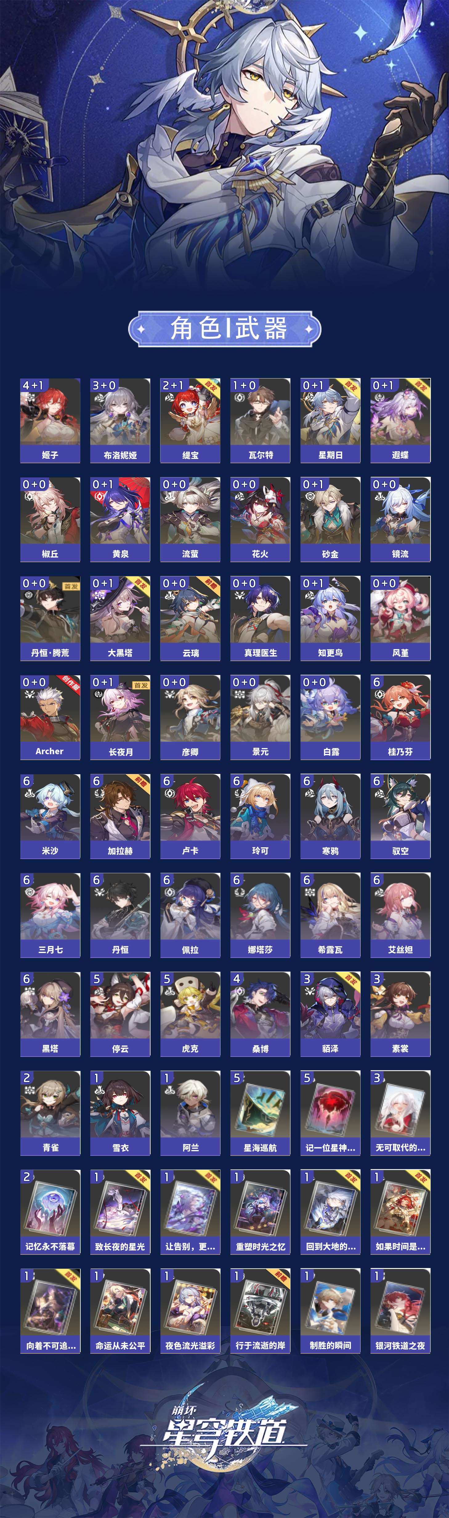 【崩坏·星穹铁道】【lyxq9824】冒险等级:70,女主,五星数量:38,五星角色:姬子 4命布洛妮娅 3命缇宝 2命瓦尔特 1命云璃椒丘景元白露彦卿星期日大黑塔遐蝶镜流真理医生花火黄泉风堇砂金知更鸟archer长夜月丹恒·腾荒流萤__五星光锥:星海巡航 5精记一位星神的陨落 5精无可取代的东西 3精记忆永不落幕 2精制胜的瞬间银河铁道之夜回到大地的飞行向着不可追问处如果时间是一朵花让告别,更美一些重塑时光之忆行于流逝的岸命运从未公平夜色流光溢彩致长夜的星光__四星角色:娜塔莎 6命黑塔 6命丹恒 6命艾丝妲 6命希露瓦 6命三月七 6命佩拉 6命驭空 6命卢卡 6命玲可 6命桂乃芬 6命寒鸦 6命米沙 6命加拉赫 6命虎克 5命停云 5命桑博 4命貊泽 3命素裳 3命青雀 2命阿兰 1命雪衣 1命