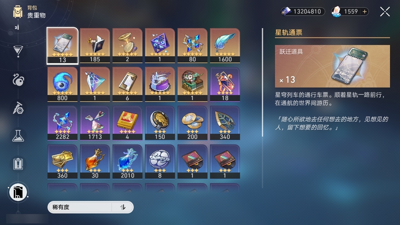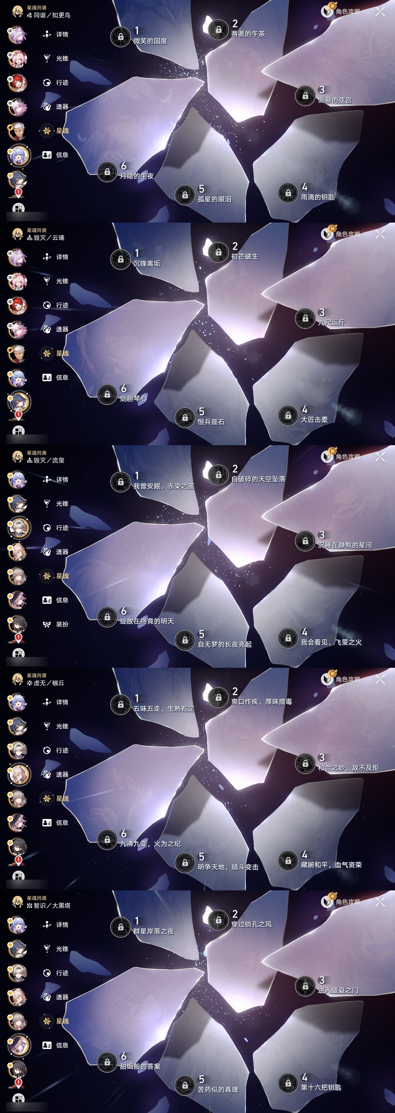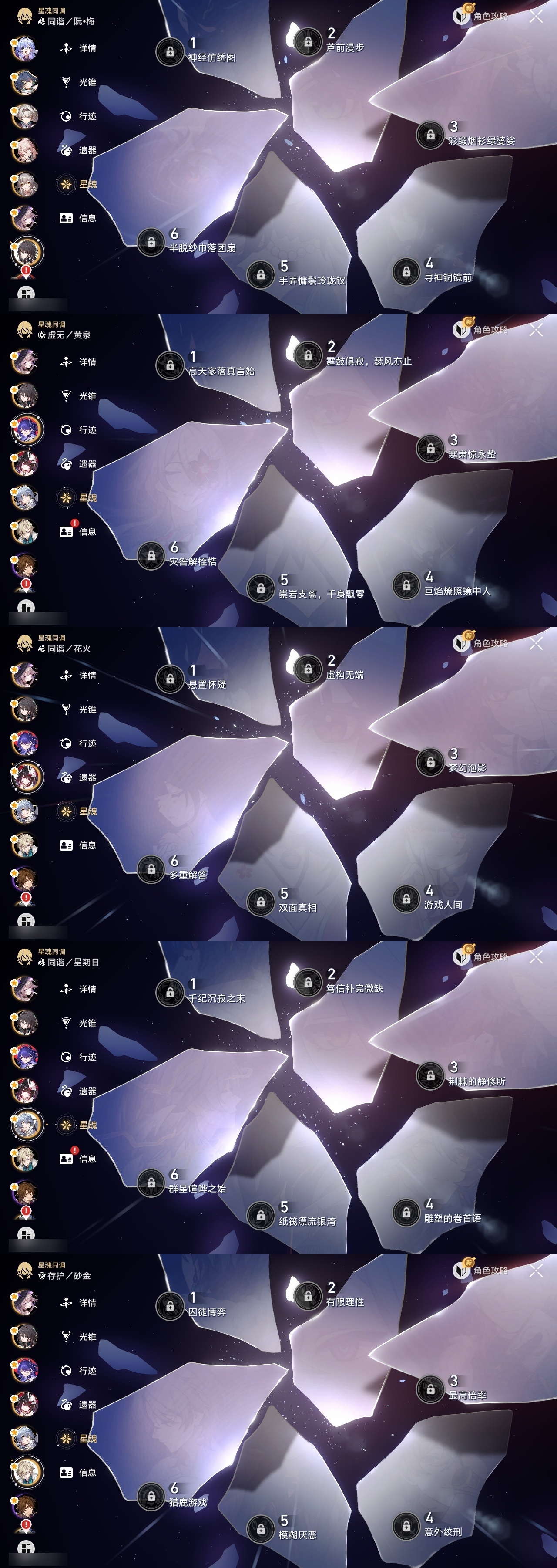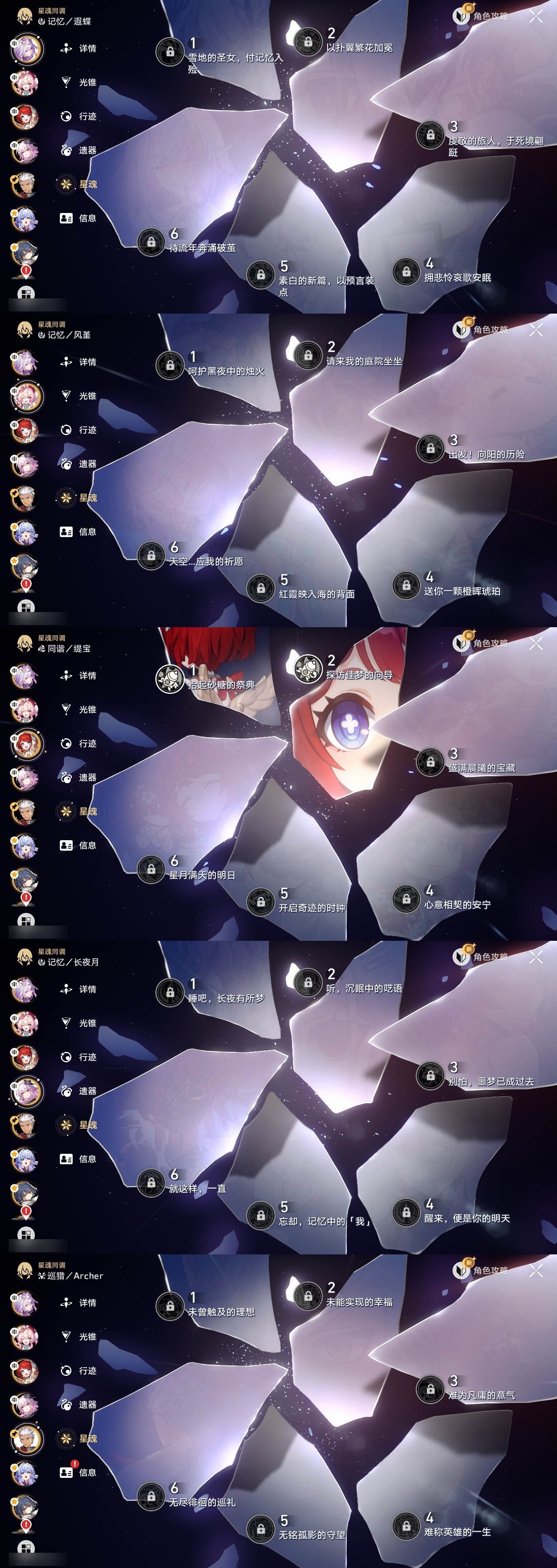 【崩坏·星穹铁道】【lyxq9824】冒险等级:70,女主,五星数量:38,五星角色:姬子 4命布洛妮娅 3命缇宝 2命瓦尔特 1命云璃椒丘景元白露彦卿星期日大黑塔遐蝶镜流真理医生花火黄泉风堇砂金知更鸟archer长夜月丹恒·腾荒流萤__五星光锥:星海巡航 5精记一位星神的陨落 5精无可取代的东西 3精记忆永不落幕 2精制胜的瞬间银河铁道之夜回到大地的飞行向着不可追问处如果时间是一朵花让告别,更美一些重塑时光之忆行于流逝的岸命运从未公平夜色流光溢彩致长夜的星光__四星角色:娜塔莎 6命黑塔 6命丹恒 6命艾丝妲 6命希露瓦 6命三月七 6命佩拉 6命驭空 6命卢卡 6命玲可 6命桂乃芬 6命寒鸦 6命米沙 6命加拉赫 6命虎克 5命停云 5命桑博 4命貊泽 3命素裳 3命青雀 2命阿兰 1命雪衣 1命