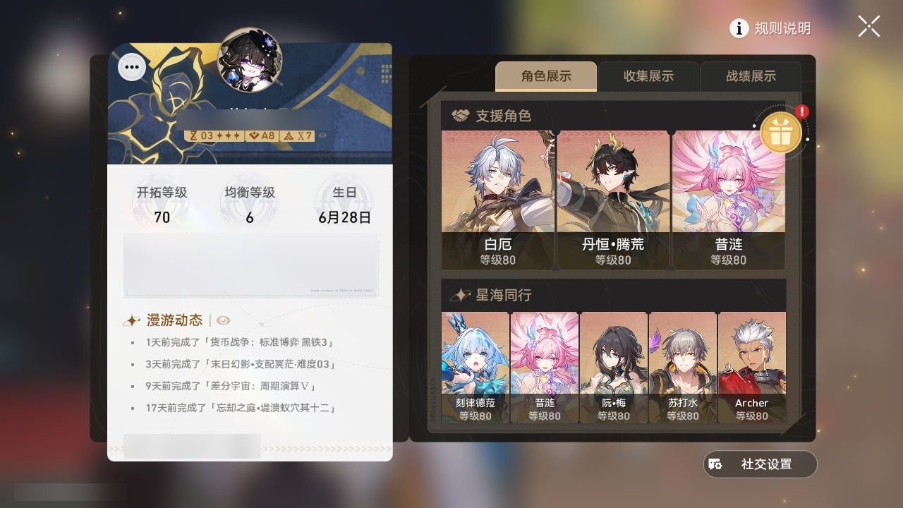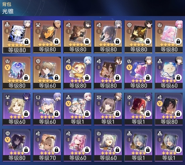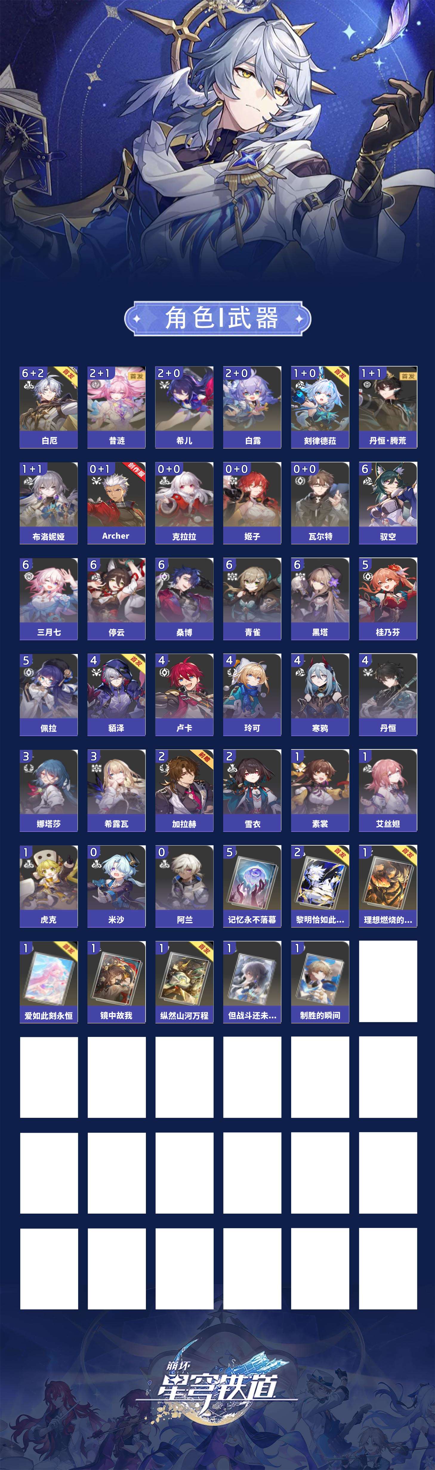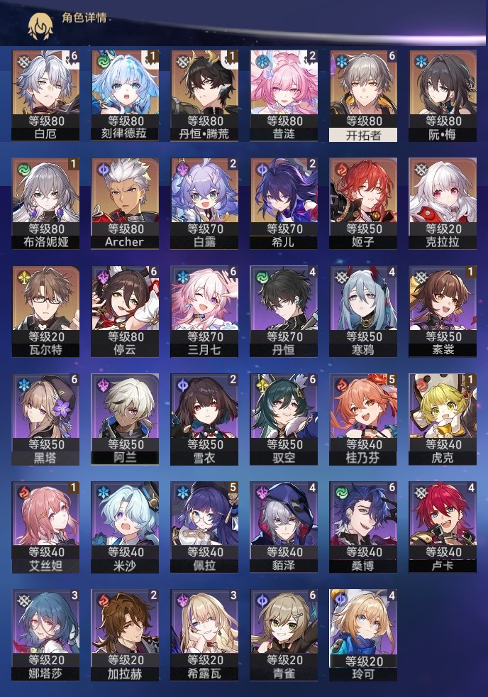 【崩坏·星穹铁道】【lyxq9792】冒险等级:70,男主,五星数量:19,五星角色:白厄 6命希儿 2命白露 2命昔涟 2命布洛妮娅 1命刻律德菈 1命丹恒·腾荒 1命姬子瓦尔特克拉拉archer__五星光锥:记忆永不落幕 5精黎明恰如此燃烧 2精制胜的瞬间但战斗还未结束镜中故我理想燃烧的地狱纵然山河万程爱如此刻永恒__四星角色:黑塔 6命停云 6命桑博 6命三月七 6命青雀 6命驭空 6命佩拉 5命桂乃芬 5命貊泽 4命丹恒 4命卢卡 4命玲可 4命寒鸦 4命娜塔莎 3命希露瓦 3命雪衣 2命加拉赫 2命虎克 1命艾丝妲 1命素裳 1命阿兰米沙满命白厄队