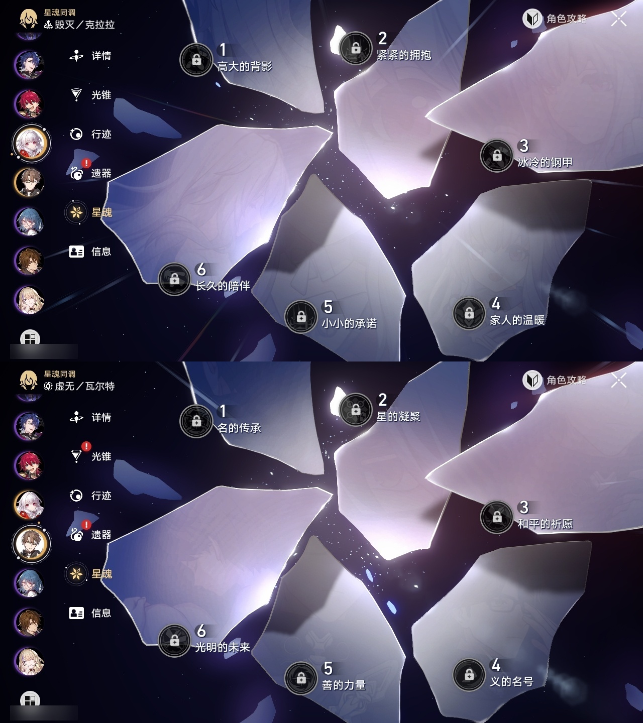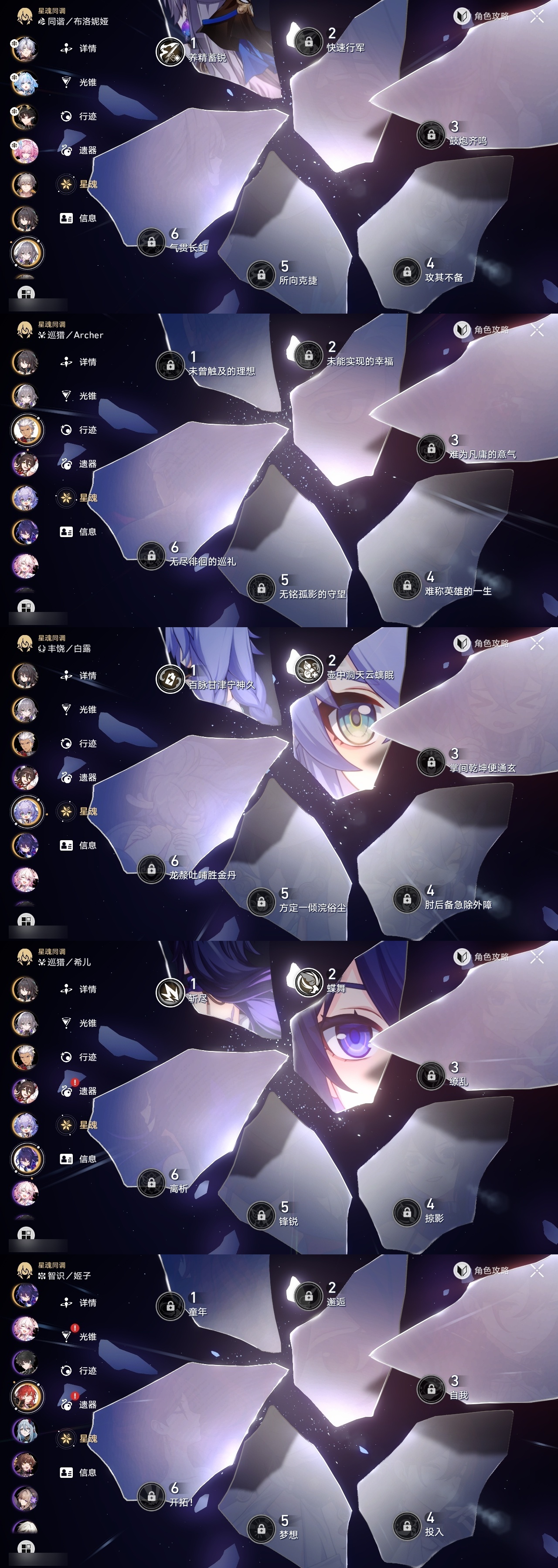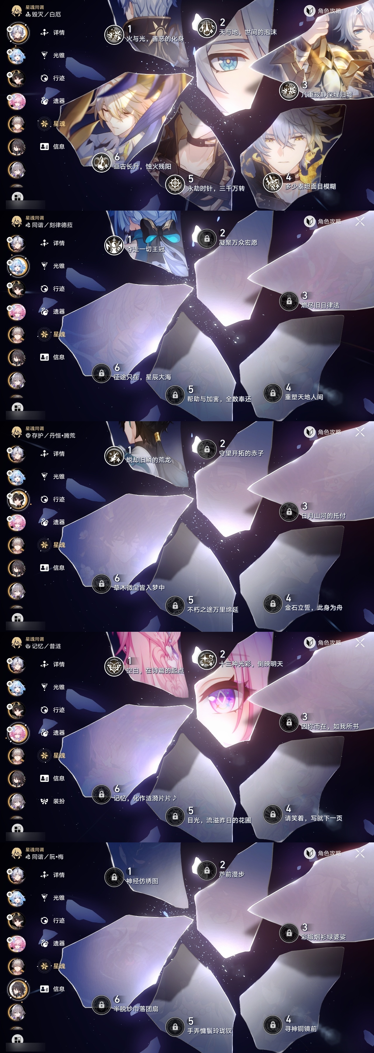 【崩坏·星穹铁道】【lyxq9792】冒险等级:70,男主,五星数量:19,五星角色:白厄 6命希儿 2命白露 2命昔涟 2命布洛妮娅 1命刻律德菈 1命丹恒·腾荒 1命姬子瓦尔特克拉拉archer__五星光锥:记忆永不落幕 5精黎明恰如此燃烧 2精制胜的瞬间但战斗还未结束镜中故我理想燃烧的地狱纵然山河万程爱如此刻永恒__四星角色:黑塔 6命停云 6命桑博 6命三月七 6命青雀 6命驭空 6命佩拉 5命桂乃芬 5命貊泽 4命丹恒 4命卢卡 4命玲可 4命寒鸦 4命娜塔莎 3命希露瓦 3命雪衣 2命加拉赫 2命虎克 1命艾丝妲 1命素裳 1命阿兰米沙满命白厄队