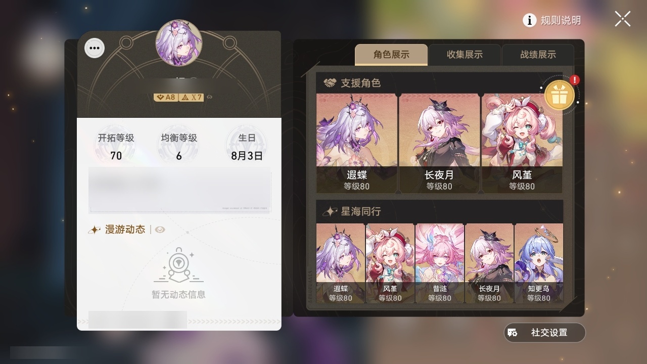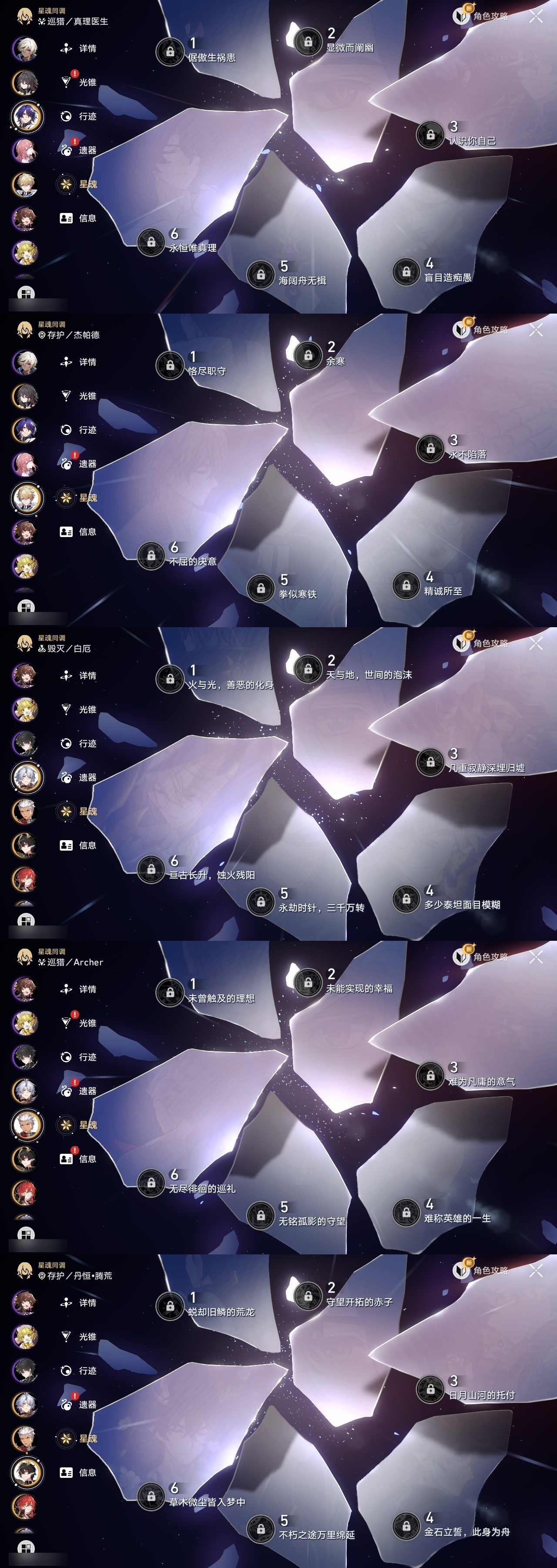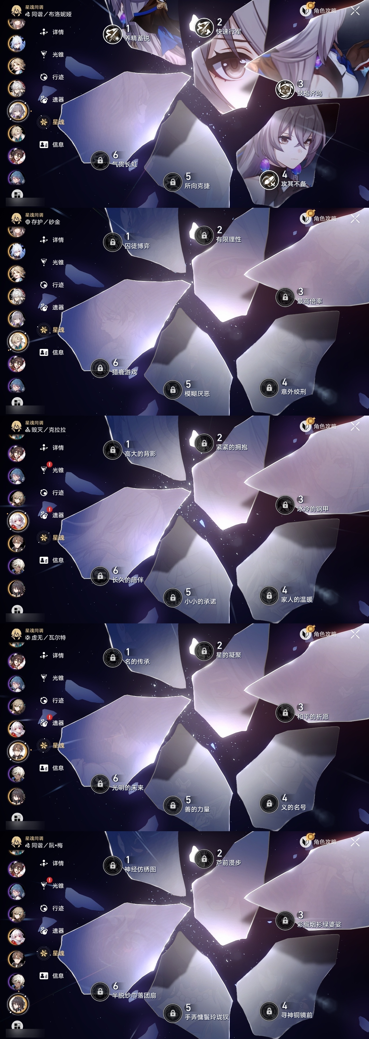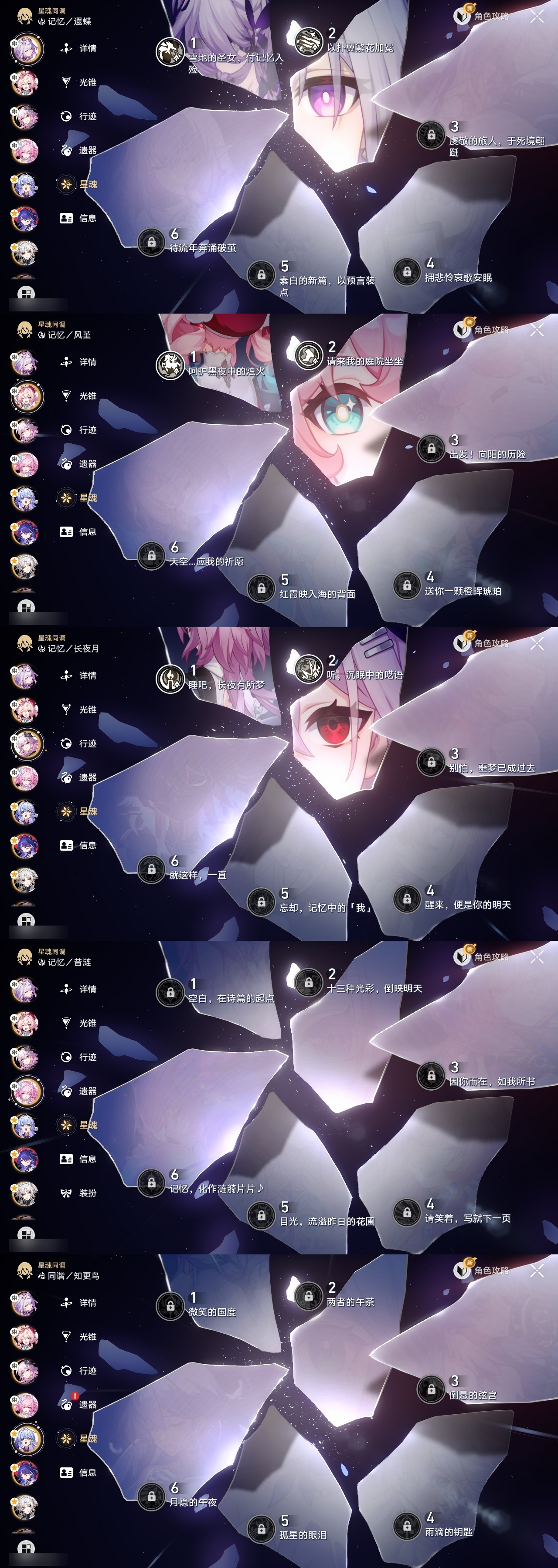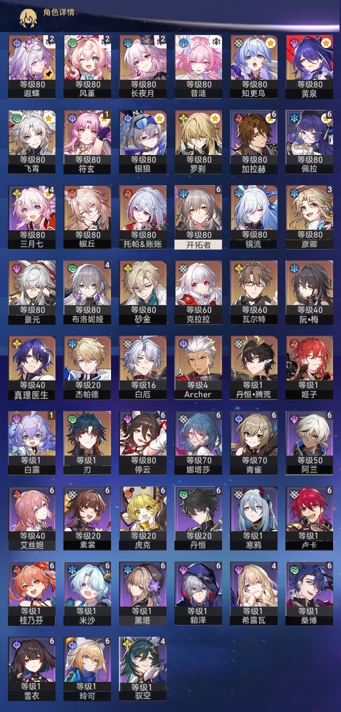 【崩坏·星穹铁道】【lyxq9753】冒险等级:70,女主,五星数量:42,五星角色:布洛妮娅 4命彦卿 3命遐蝶 2命风堇 2命长夜月 2命白露 1命符玄 1命椒丘飞霄银狼景元姬子杰帕德瓦尔特克拉拉罗刹刃镜流托帕账账真理医生黄泉砂金知更鸟白厄archer丹恒·腾荒昔涟__五星光锥:星海巡航 5精记忆的质料 5精记忆永不落幕 5精记一位星神的陨落制胜的瞬间制胜的瞬间无可取代的东西时节不居但战斗还未结束但战斗还未结束拂晓之前让告别,更美一些行于流逝的岸愿虹光永驻天空致长夜的星光__四星角色:阿兰 6命娜塔莎 6命虎克 6命貊泽 6命黑塔 6命丹恒 6命艾丝妲 6命停云 6命素裳 6命桑博 6命青雀 6命佩拉 6命卢卡 6命玲可 6命桂乃芬 6命雪衣 6命米沙 6命加拉赫 6命希露瓦 4命三月七 4命驭空 4命寒鸦2命遐碟记忆战舰