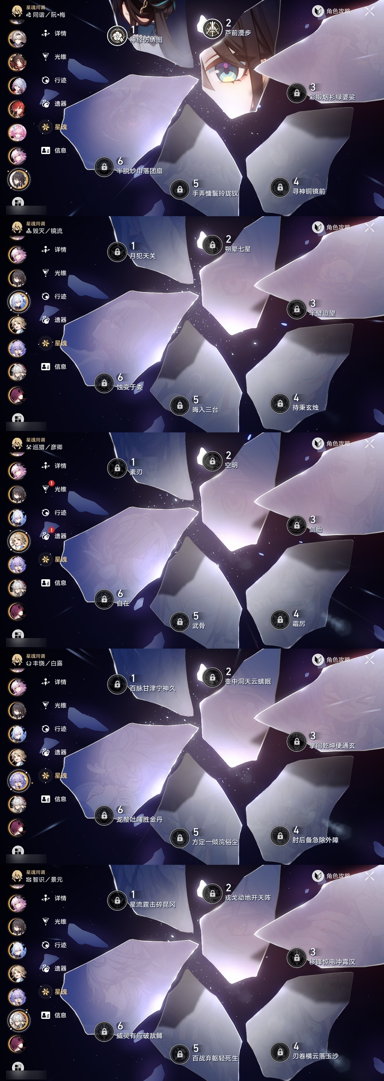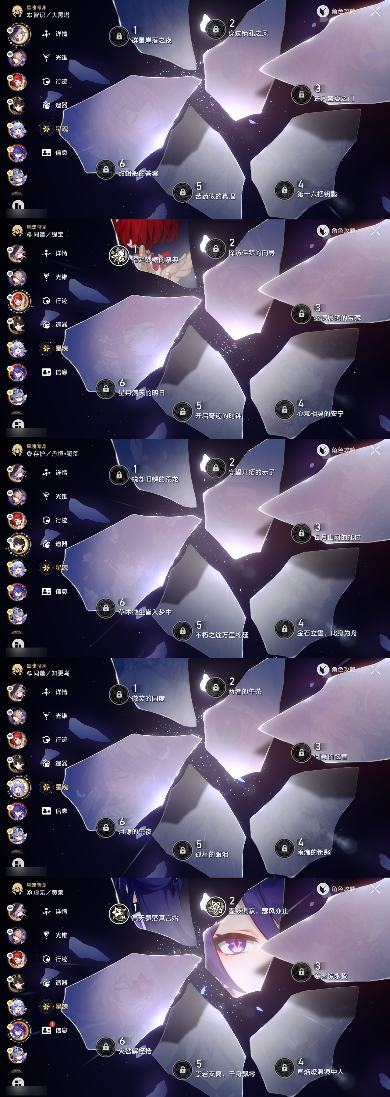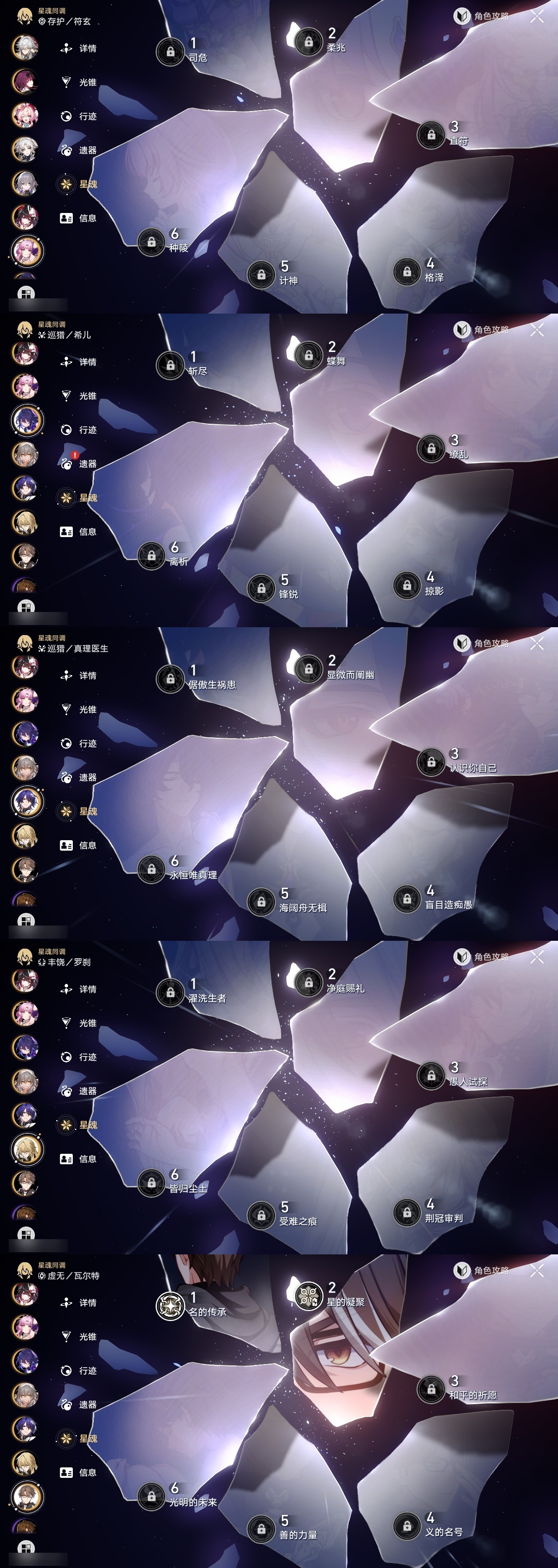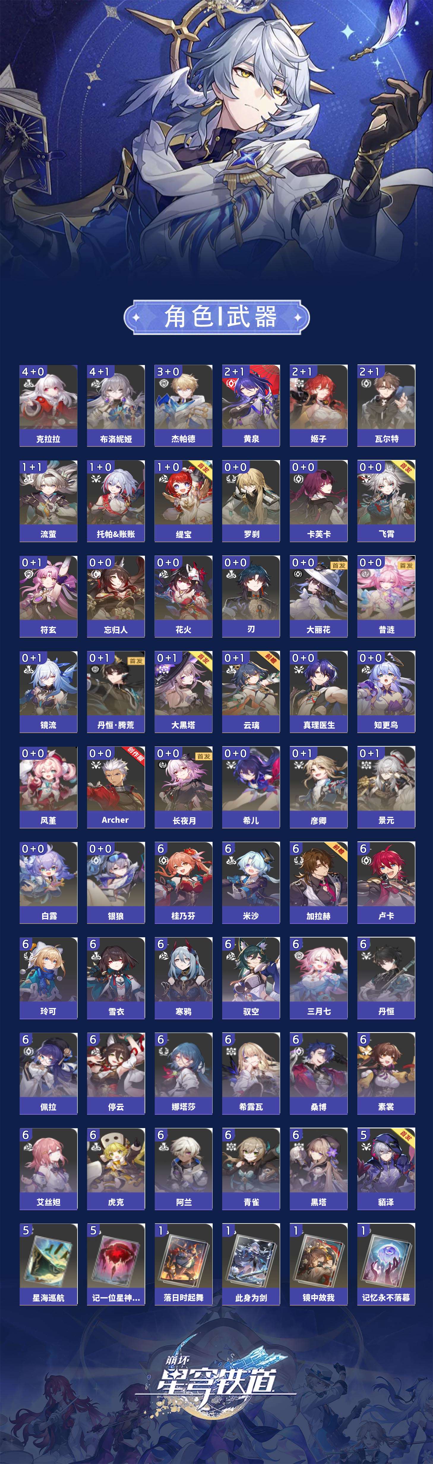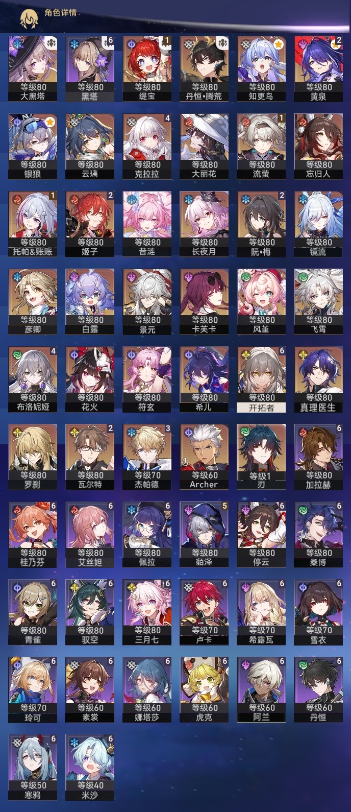 【崩坏·星穹铁道】【lyxq9854】冒险等级:70,女主,五星数量:51,五星角色:布洛妮娅 4命克拉拉 4命杰帕德 3命姬子 2命瓦尔特 2命黄泉 2命缇宝 1命托帕账账 1命流萤 1命云璃飞霄银狼景元希儿白露彦卿大黑塔忘归人罗刹刃卡芙卡符玄镜流真理医生花火风堇知更鸟archer长夜月丹恒·腾荒昔涟大丽花__五星光锥:星海巡航 5精记一位星神的陨落 5精落日时起舞银河铁道之夜以世界之名如泥酣眠如泥酣眠但战斗还未结束但战斗还未结束拂晓之前向着不可追问处她已闭上双眼此身为剑镜中故我行于流逝的岸记忆永不落幕纵然山河万程纵然山河万程梦应归于何处__四星角色:阿兰 6命娜塔莎 6命虎克 6命黑塔 6命丹恒 6命艾丝妲 6命希露瓦 6命停云 6命素裳 6命桑博 6命三月七 6命青雀 6命佩拉 6命驭空 6命卢卡 6命玲可 6命桂乃芬 6命寒鸦 6命雪衣 6命米沙 6命加拉赫 6命貊泽 5命