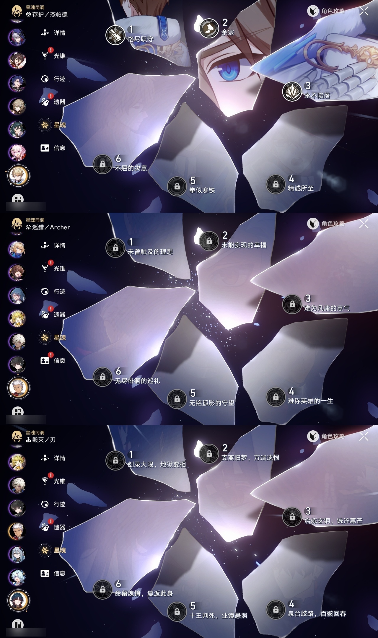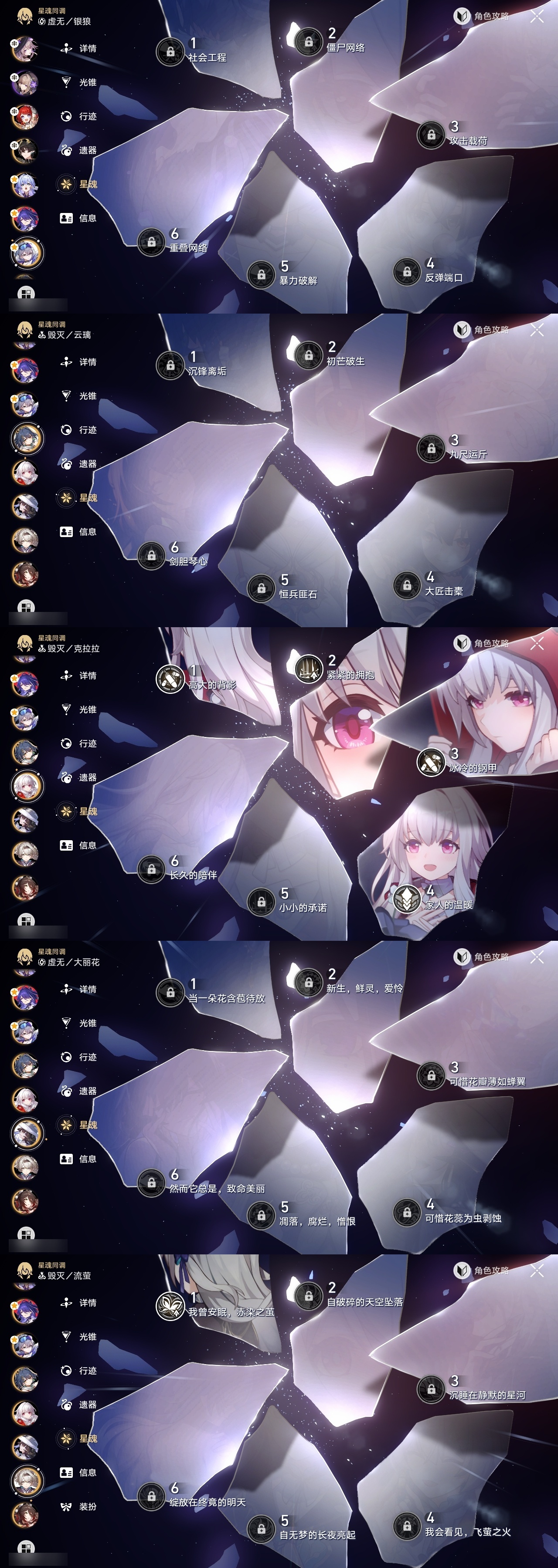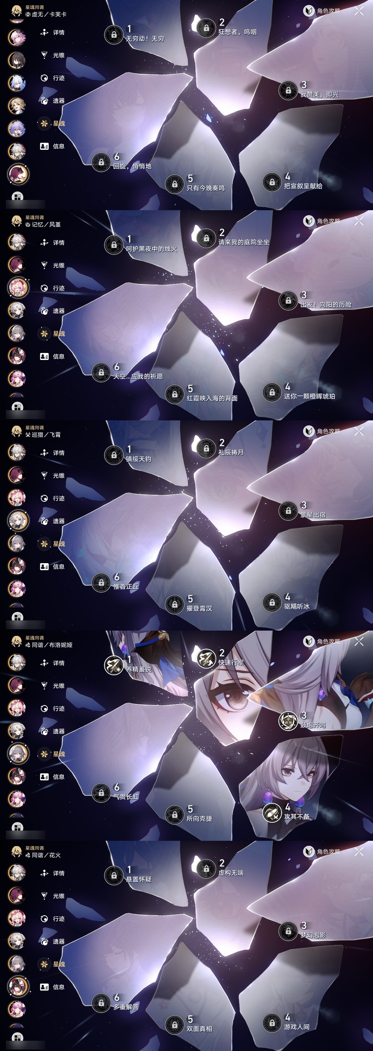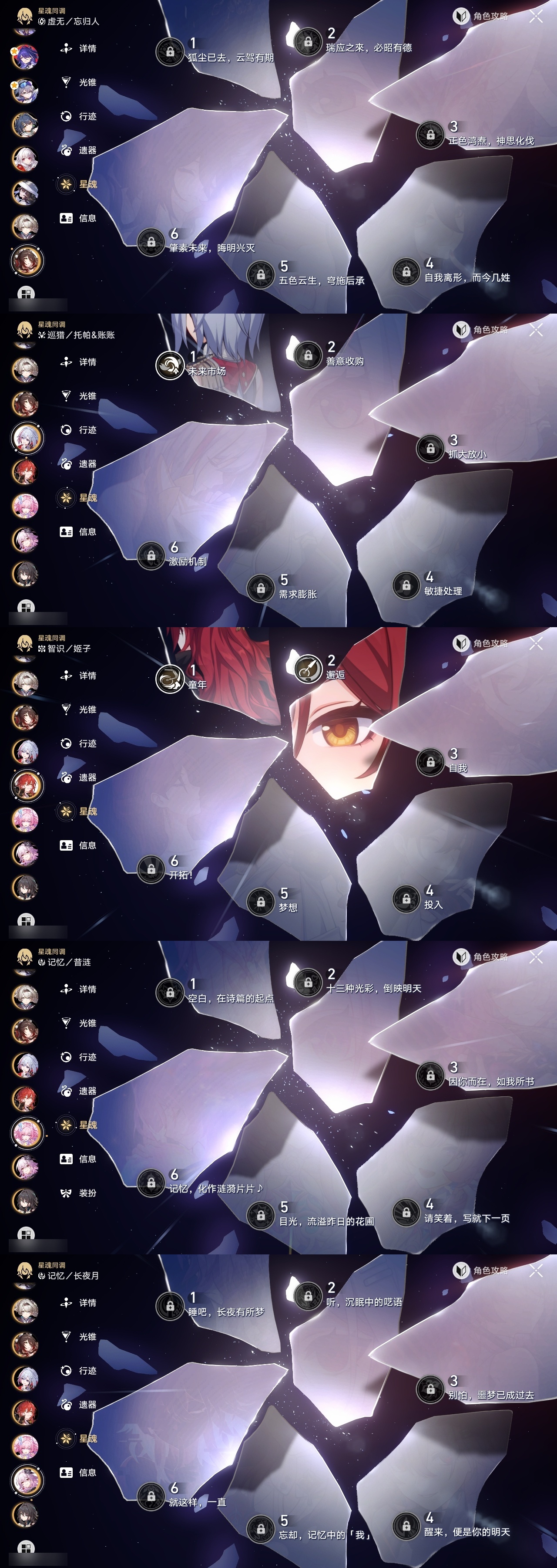 【崩坏·星穹铁道】【lyxq9854】冒险等级:70,女主,五星数量:51,五星角色:布洛妮娅 4命克拉拉 4命杰帕德 3命姬子 2命瓦尔特 2命黄泉 2命缇宝 1命托帕账账 1命流萤 1命云璃飞霄银狼景元希儿白露彦卿大黑塔忘归人罗刹刃卡芙卡符玄镜流真理医生花火风堇知更鸟archer长夜月丹恒·腾荒昔涟大丽花__五星光锥:星海巡航 5精记一位星神的陨落 5精落日时起舞银河铁道之夜以世界之名如泥酣眠如泥酣眠但战斗还未结束但战斗还未结束拂晓之前向着不可追问处她已闭上双眼此身为剑镜中故我行于流逝的岸记忆永不落幕纵然山河万程纵然山河万程梦应归于何处__四星角色:阿兰 6命娜塔莎 6命虎克 6命黑塔 6命丹恒 6命艾丝妲 6命希露瓦 6命停云 6命素裳 6命桑博 6命三月七 6命青雀 6命佩拉 6命驭空 6命卢卡 6命玲可 6命桂乃芬 6命寒鸦 6命雪衣 6命米沙 6命加拉赫 6命貊泽 5命