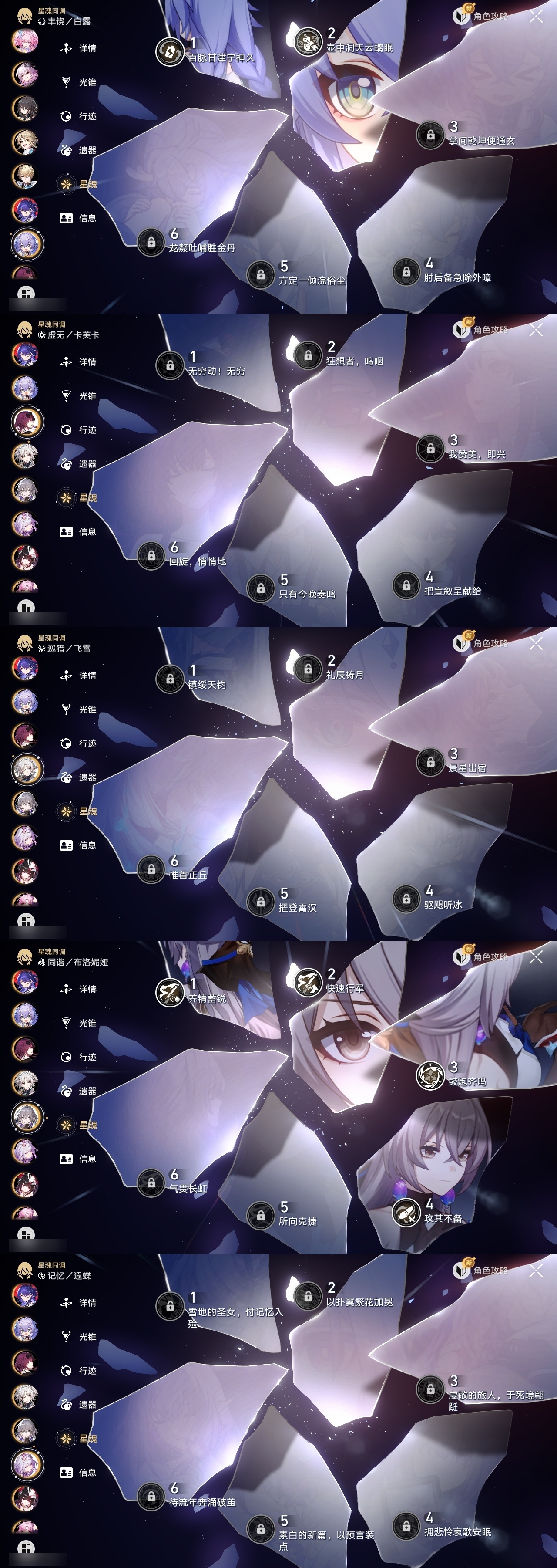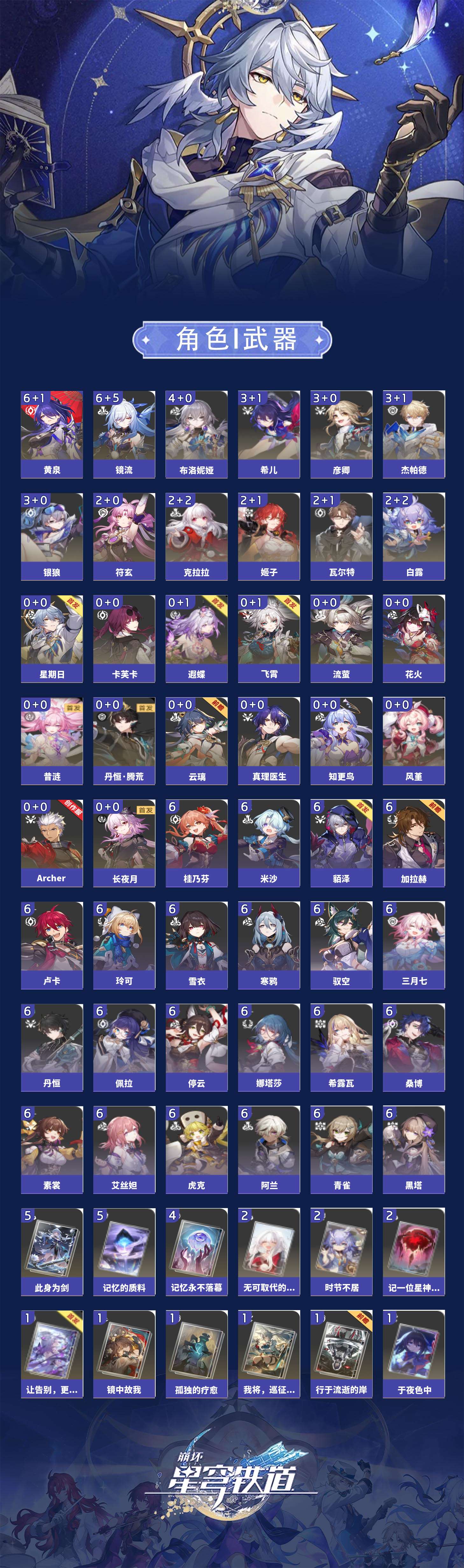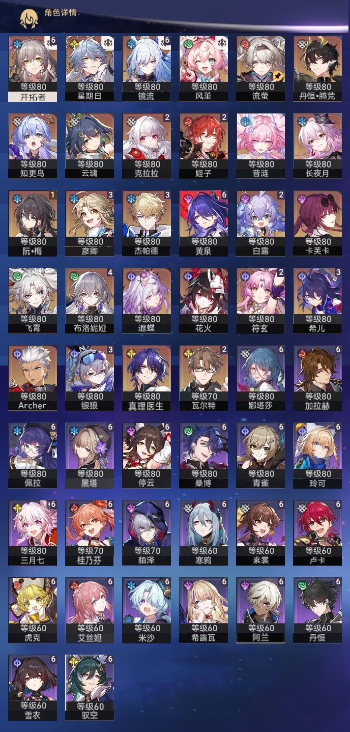 【崩坏·星穹铁道】【lyxq9853】冒险等级:70,女主,五星数量:45,五星角色:镜流 6命黄泉 6命布洛妮娅 4命银狼 3命希儿 3命杰帕德 3命彦卿 3命白露 2命姬子 2命瓦尔特 2命克拉拉 2命符玄 2命云璃飞霄星期日卡芙卡遐蝶真理医生花火风堇知更鸟archer长夜月丹恒·腾荒昔涟流萤__五星光锥:记忆的质料 5精此身为剑 5精记忆永不落幕 4精记一位星神的陨落 2精无可取代的东西 2精时节不居 2精星海巡航制胜的瞬间银河铁道之夜银河铁道之夜以世界之名以世界之名于夜色中我将,巡征追猎不息的演算孤独的疗愈让告别,更美一些镜中故我行于流逝的岸__四星角色:阿兰 6命娜塔莎 6命虎克 6命貊泽 6命黑塔 6命丹恒 6命艾丝妲 6命希露瓦 6命停云 6命素裳 6命桑博 6命三月七 6命青雀 6命佩拉 6命驭空 6命卢卡 6命玲可 6命桂乃芬 6命寒鸦 6命雪衣 6命米沙 6命加拉赫 6命61黄泉 65镜流