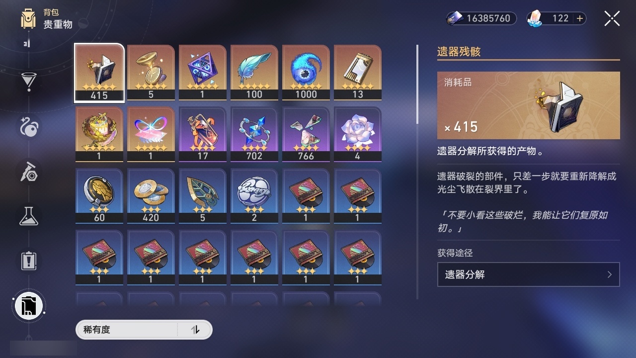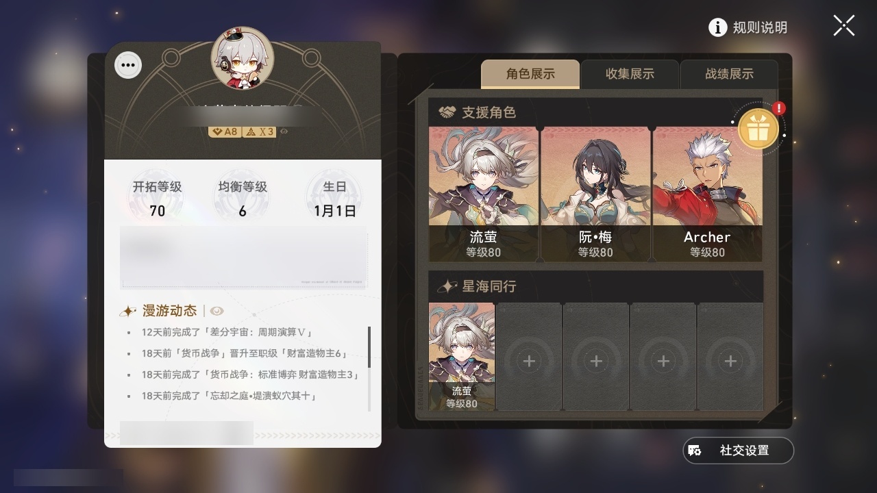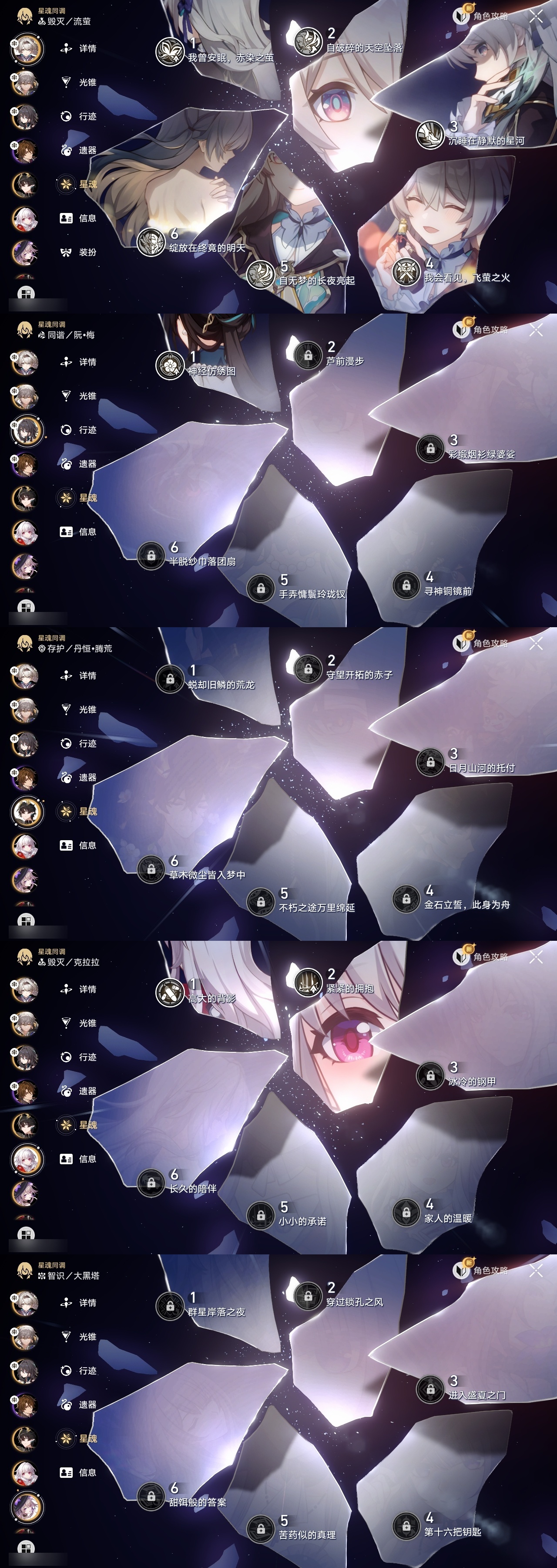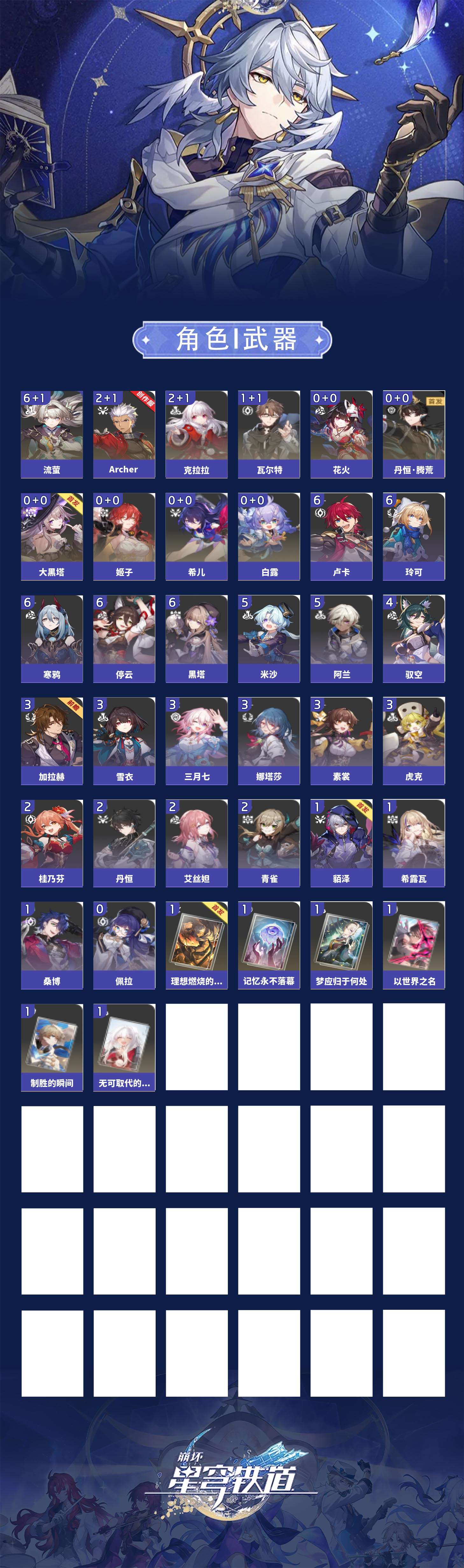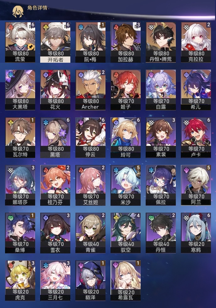 【崩坏·星穹铁道】【lyxq9845】冒险等级:70,男主,五星数量:17,五星角色:流萤 6命克拉拉 2命archer 2命瓦尔特 1命希儿白露姬子大黑塔花火丹恒·腾荒__五星光锥:不息的演算 5精制胜的瞬间以世界之名无可取代的东西记忆永不落幕理想燃烧的地狱梦应归于何处__四星角色:黑塔 6命停云 6命卢卡 6命玲可 6命寒鸦 6命阿兰 5命米沙 5命驭空 4命娜塔莎 3命虎克 3命素裳 3命三月七 3命雪衣 3命加拉赫 3命丹恒 2命艾丝妲 2命青雀 2命桂乃芬 2命貊泽 1命希露瓦 1命桑博 1命佩拉满命流萤