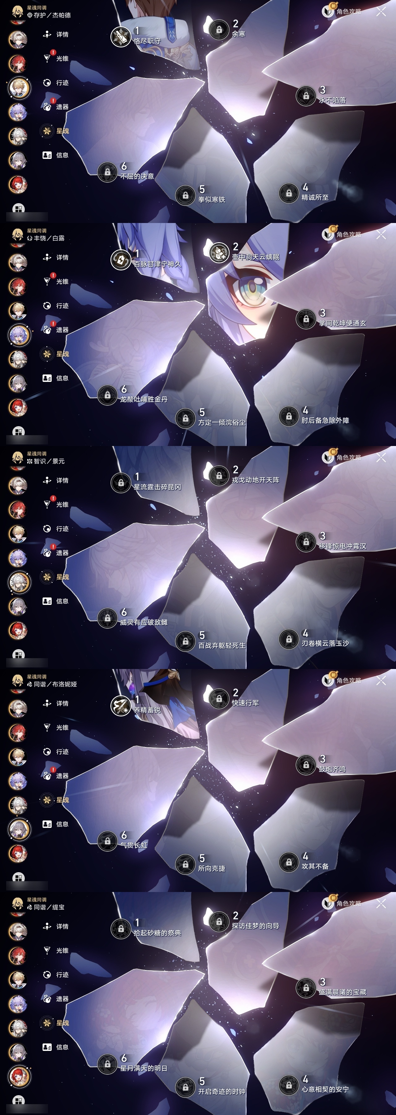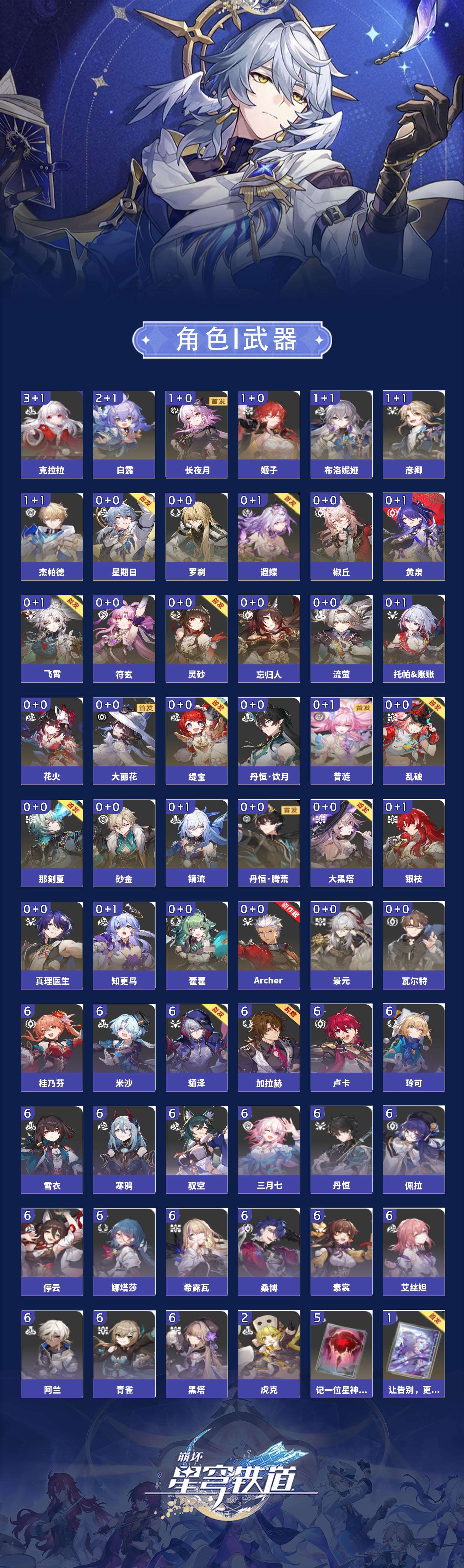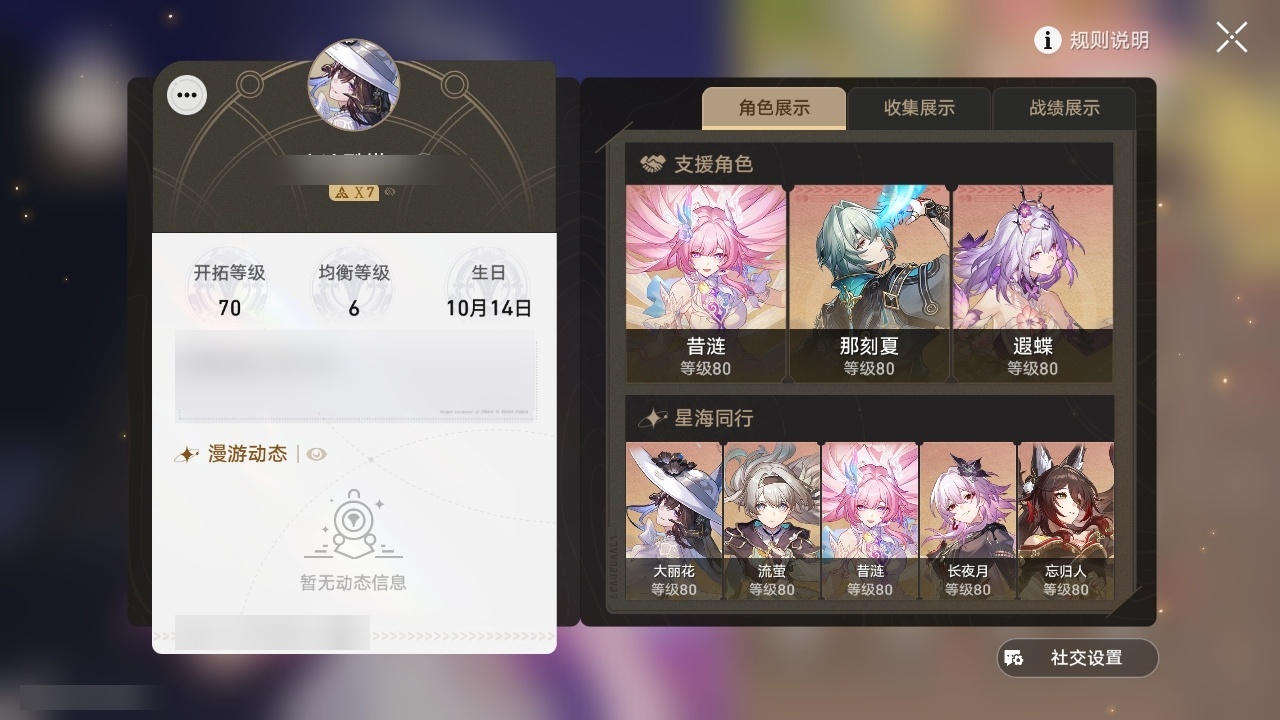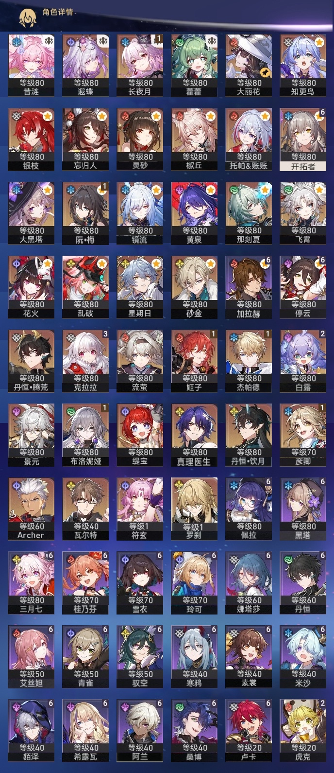 【崩坏·星穹铁道】【lyxq9834】冒险等级:70,女主,五星数量:50,五星角色:克拉拉 3命白露 2命布洛妮娅 1命姬子 1命杰帕德 1命彦卿 1命长夜月 1命椒丘飞霄景元灵砂瓦尔特乱破星期日大黑塔忘归人罗刹缇宝丹恒·饮月遐蝶符玄镜流托帕账账藿藿银枝真理医生花火那刻夏黄泉砂金知更鸟archer丹恒·腾荒昔涟大丽花流萤__五星光锥:记一位星神的陨落 5精制胜的瞬间无可取代的东西时节不居如泥酣眠但战斗还未结束我将,巡征追猎让告别,更美一些此身为剑烦恼着,幸福着片刻,留在眼底行于流逝的岸夜色流光溢彩爱如此刻永恒__四星角色:阿兰 6命娜塔莎 6命貊泽 6命黑塔 6命丹恒 6命艾丝妲 6命希露瓦 6命停云 6命素裳 6命桑博 6命三月七 6命青雀 6命佩拉 6命驭空 6命卢卡 6命玲可 6命桂乃芬 6命寒鸦 6命雪衣 6命米沙 6命加拉赫 6命虎克 2命记忆队,击破队,角色多