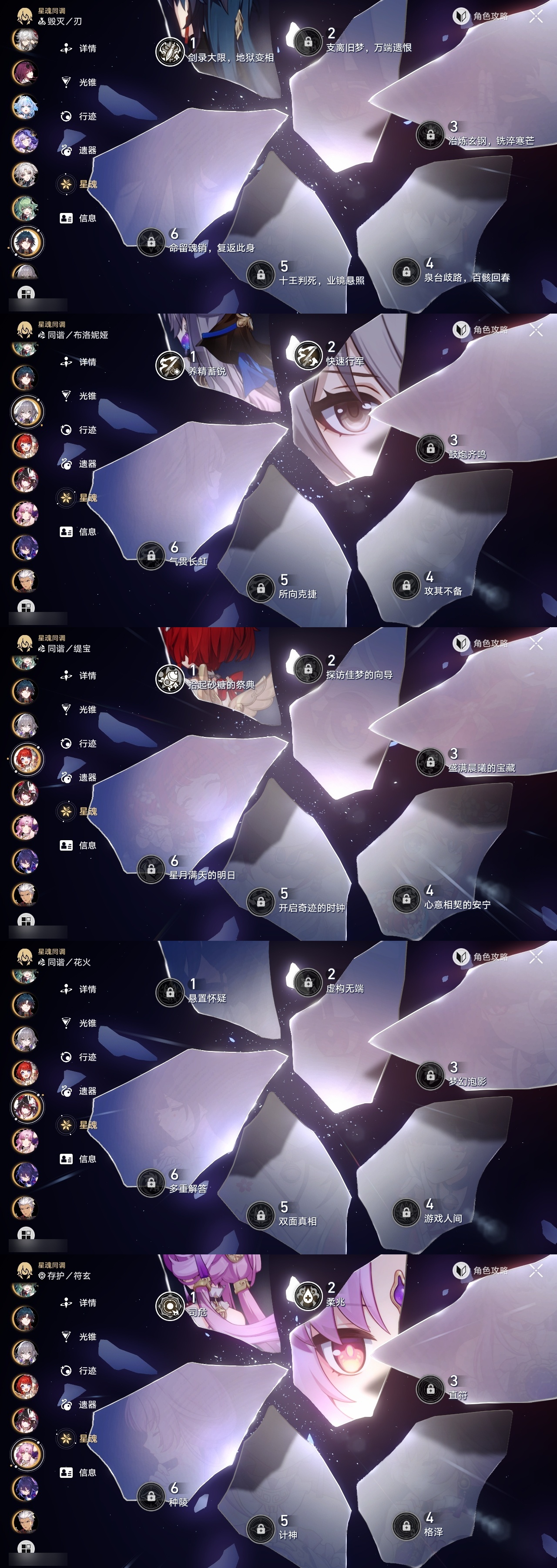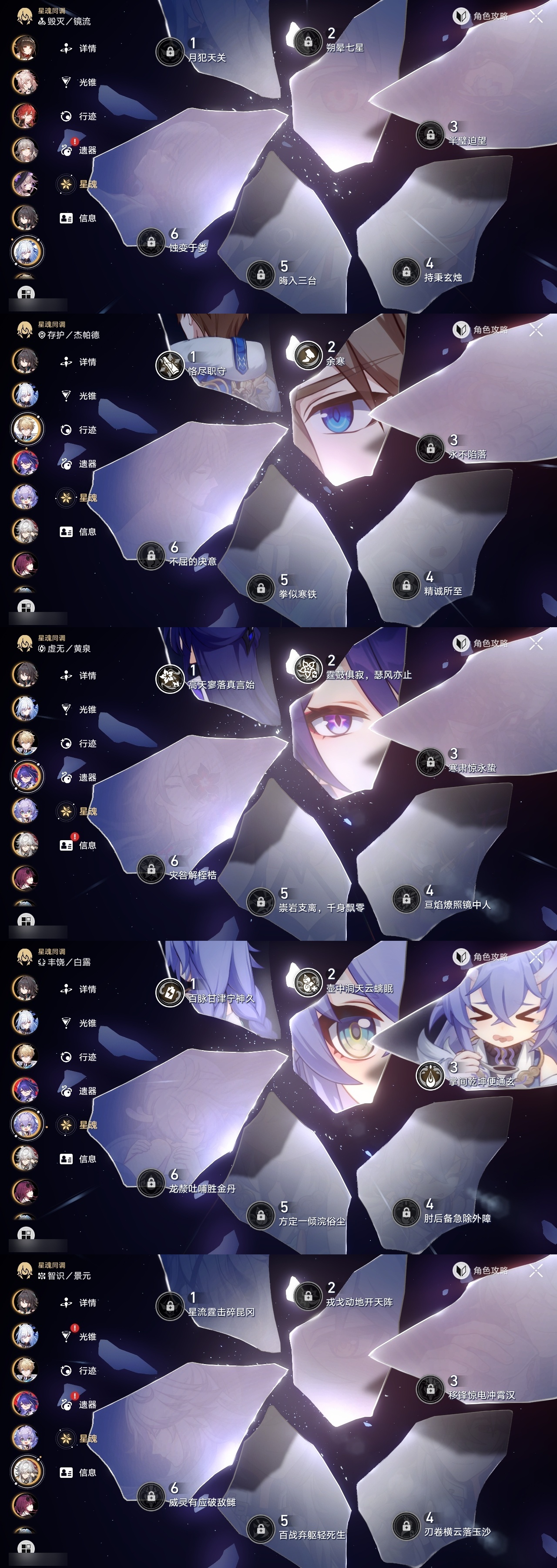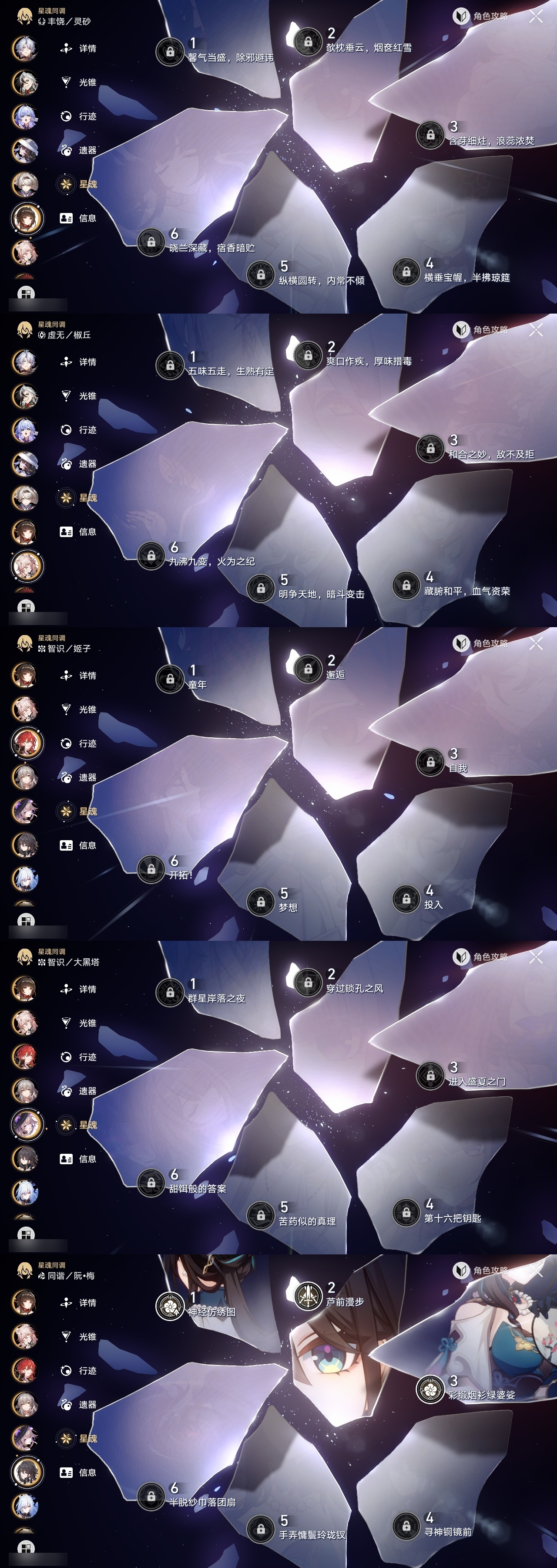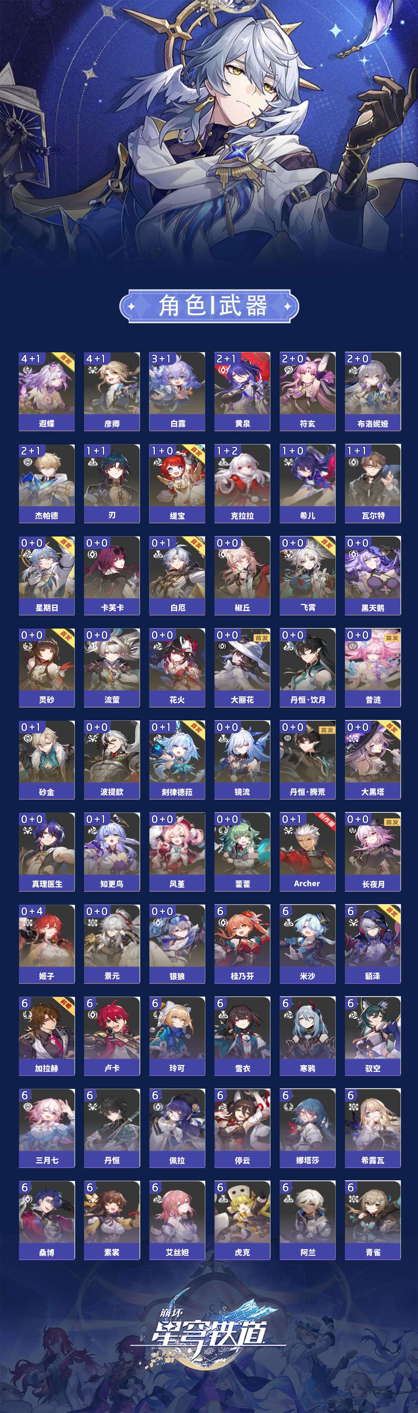 【崩坏·星穹铁道】【lyxq9762】冒险等级:70,女主,五星数量:60,五星角色:彦卿 4命遐蝶 4命白露 3命布洛妮娅 2命杰帕德 2命符玄 2命黄泉 2命希儿 1命瓦尔特 1命克拉拉 1命缇宝 1命刃 1命椒丘飞霄银狼景元姬子灵砂星期日大黑塔卡芙卡丹恒·饮月镜流藿藿真理医生黑天鹅花火风堇砂金知更鸟白厄archer刻律德菈长夜月丹恒·腾荒昔涟大丽花波提欧流萤__五星光锥:星海巡航 5精记一位星神的陨落 5精不息的演算 5精记忆永不落幕 5精银河铁道之夜 4精无可取代的东西 2精制胜的瞬间以世界之名时节不居如泥酣眠到不了的彼岸孤独的疗愈让告别,更美一些烦恼着,幸福着镜中故我行于流逝的岸命运从未公平夜色流光溢彩黎明恰如此燃烧理想燃烧的地狱金血铭刻的时代__四星角色:阿兰 6命娜塔莎 6命虎克 6命貊泽 6命黑塔 6命丹恒 6命艾丝妲 6命希露瓦 6命停云 6命素裳 6命桑博 6命三月七 6命青雀 6命佩拉 6命驭空 6命卢卡 6命玲可 6命桂乃芬 6命寒鸦 6命雪衣 6命米沙 6命加拉赫 6命41遐蝶记忆队辅助全,角色超多