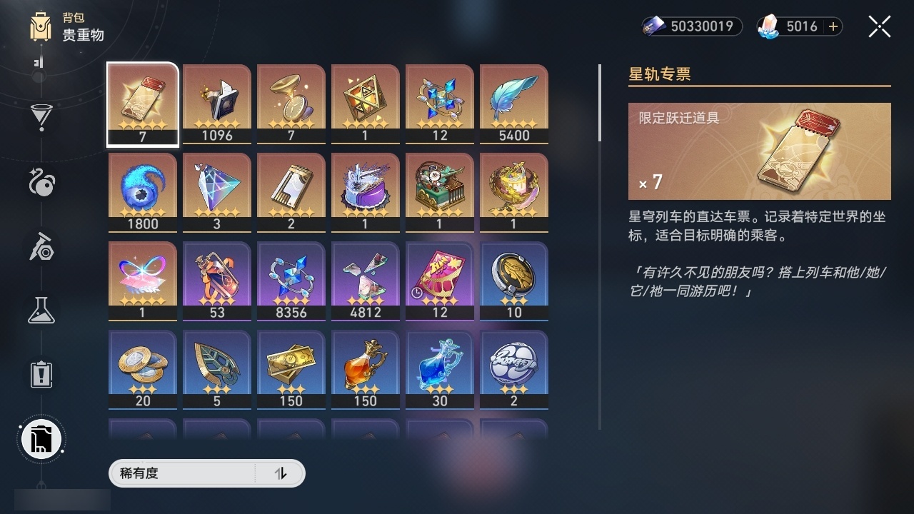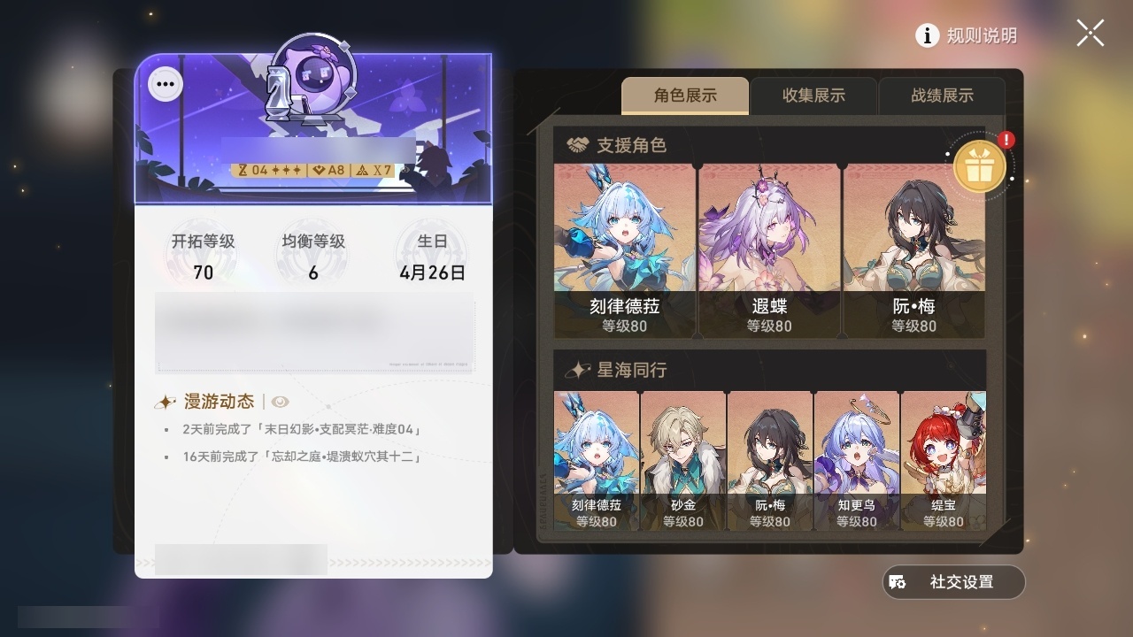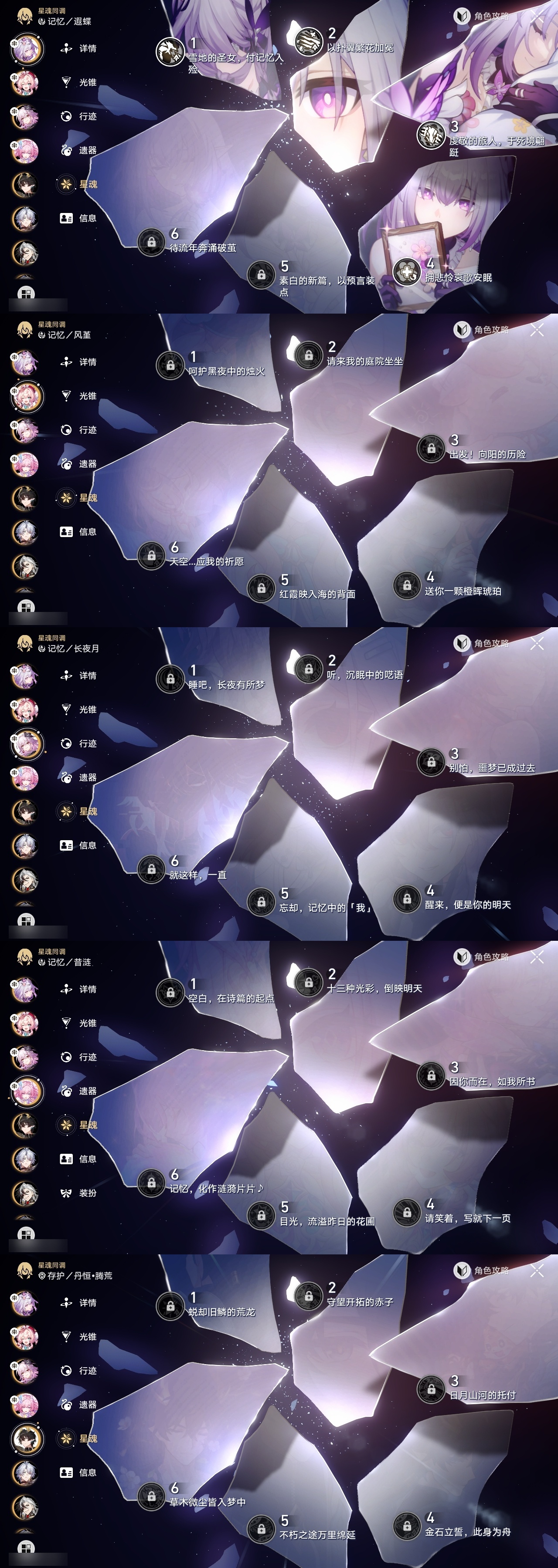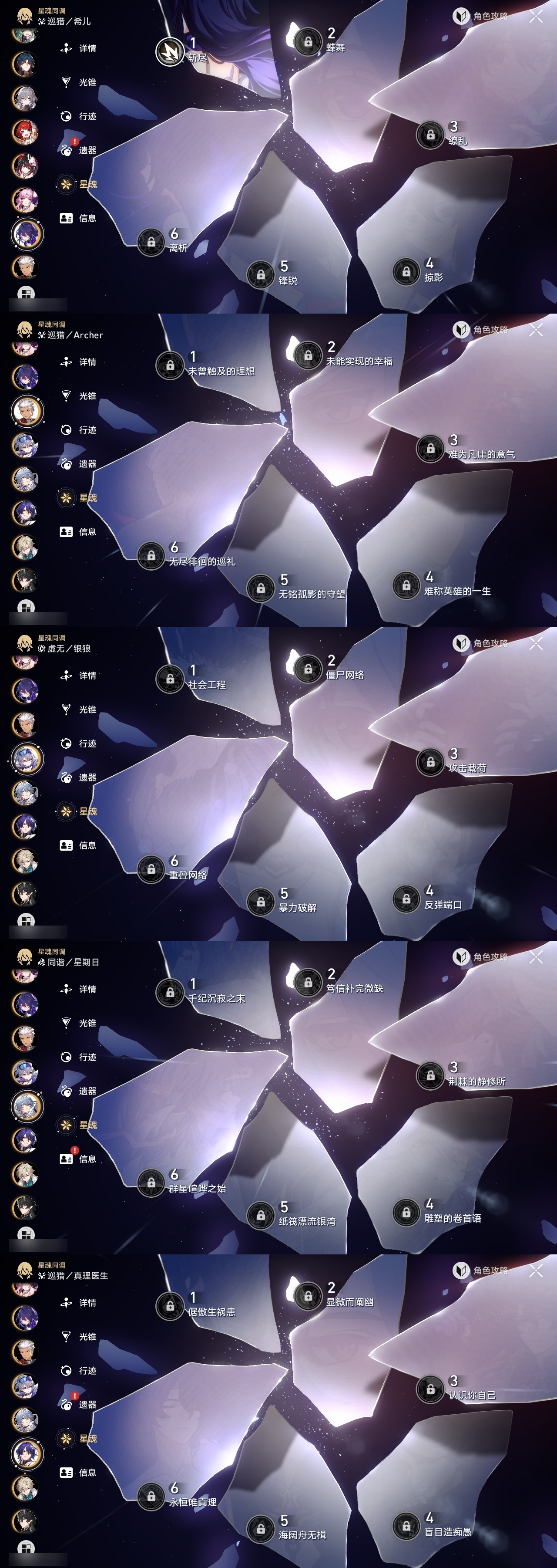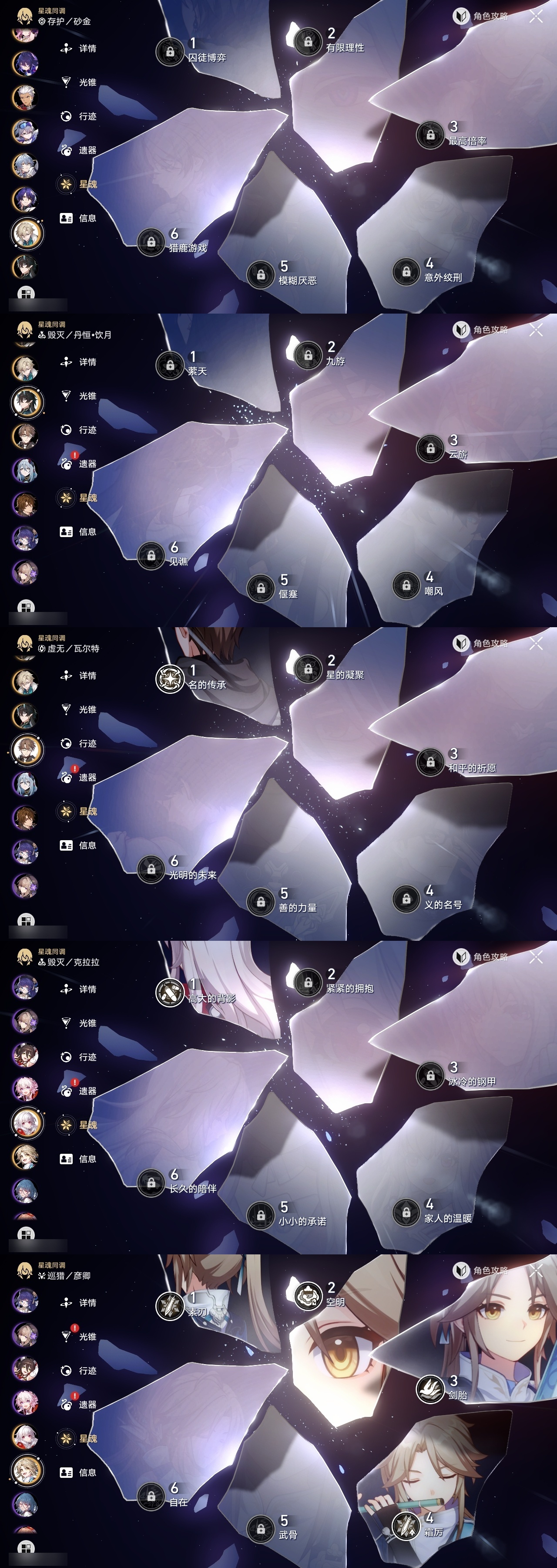 【崩坏·星穹铁道】【lyxq9762】冒险等级:70,女主,五星数量:60,五星角色:彦卿 4命遐蝶 4命白露 3命布洛妮娅 2命杰帕德 2命符玄 2命黄泉 2命希儿 1命瓦尔特 1命克拉拉 1命缇宝 1命刃 1命椒丘飞霄银狼景元姬子灵砂星期日大黑塔卡芙卡丹恒·饮月镜流藿藿真理医生黑天鹅花火风堇砂金知更鸟白厄archer刻律德菈长夜月丹恒·腾荒昔涟大丽花波提欧流萤__五星光锥:星海巡航 5精记一位星神的陨落 5精不息的演算 5精记忆永不落幕 5精银河铁道之夜 4精无可取代的东西 2精制胜的瞬间以世界之名时节不居如泥酣眠到不了的彼岸孤独的疗愈让告别,更美一些烦恼着,幸福着镜中故我行于流逝的岸命运从未公平夜色流光溢彩黎明恰如此燃烧理想燃烧的地狱金血铭刻的时代__四星角色:阿兰 6命娜塔莎 6命虎克 6命貊泽 6命黑塔 6命丹恒 6命艾丝妲 6命希露瓦 6命停云 6命素裳 6命桑博 6命三月七 6命青雀 6命佩拉 6命驭空 6命卢卡 6命玲可 6命桂乃芬 6命寒鸦 6命雪衣 6命米沙 6命加拉赫 6命41遐蝶记忆队辅助全,角色超多