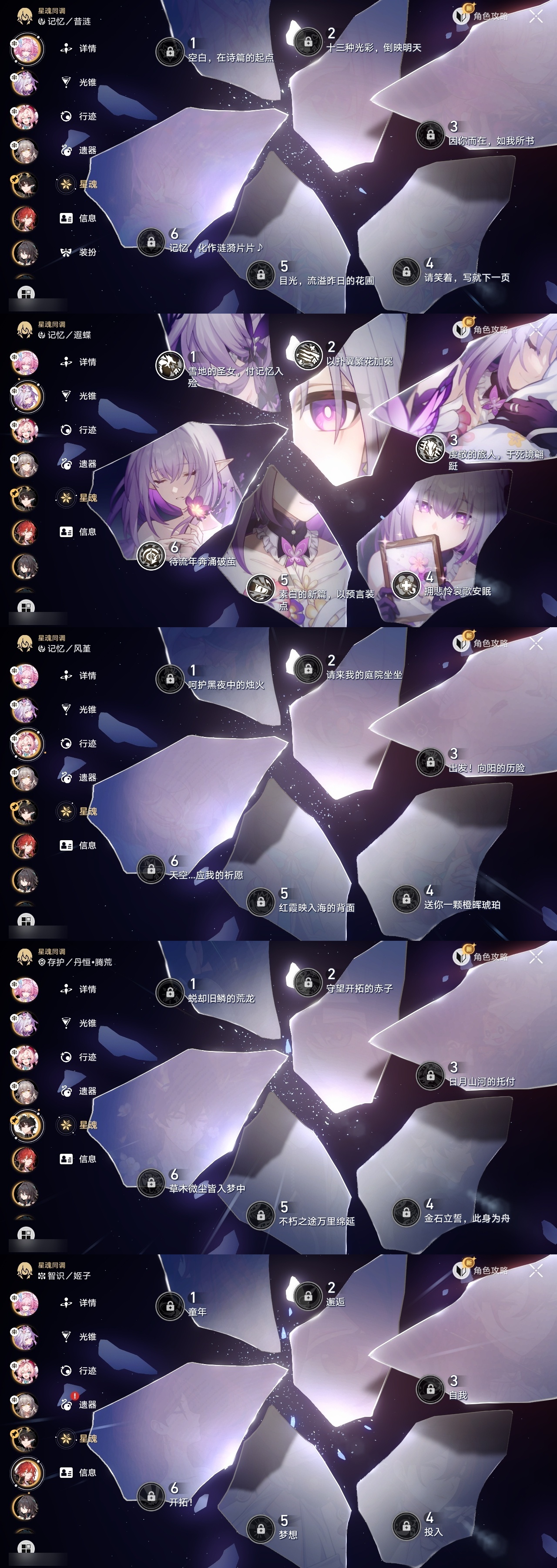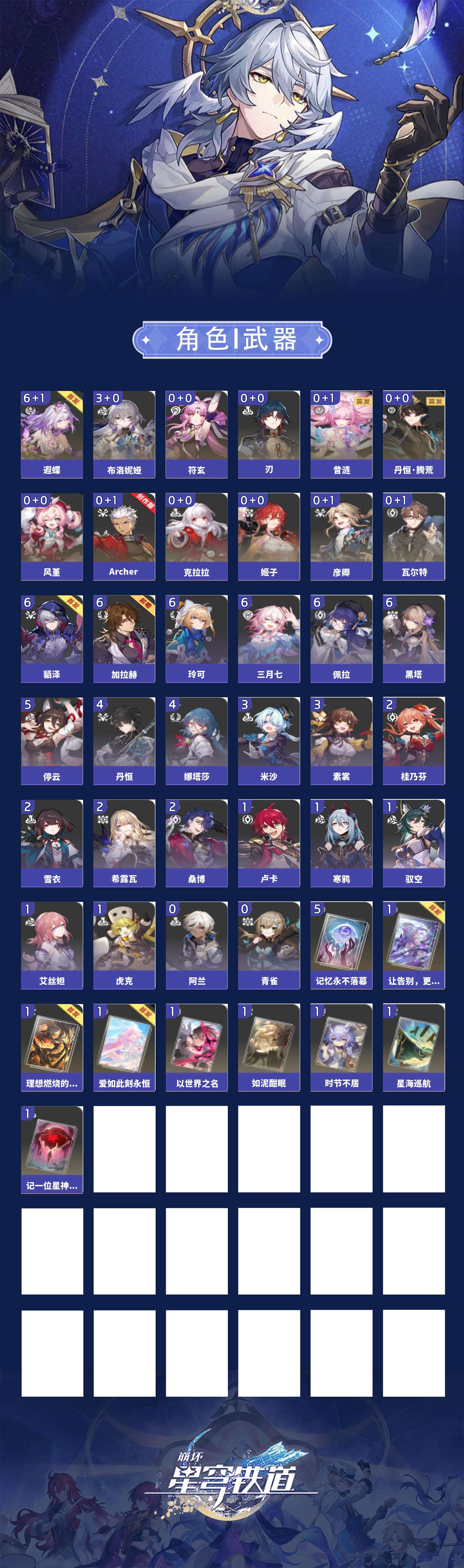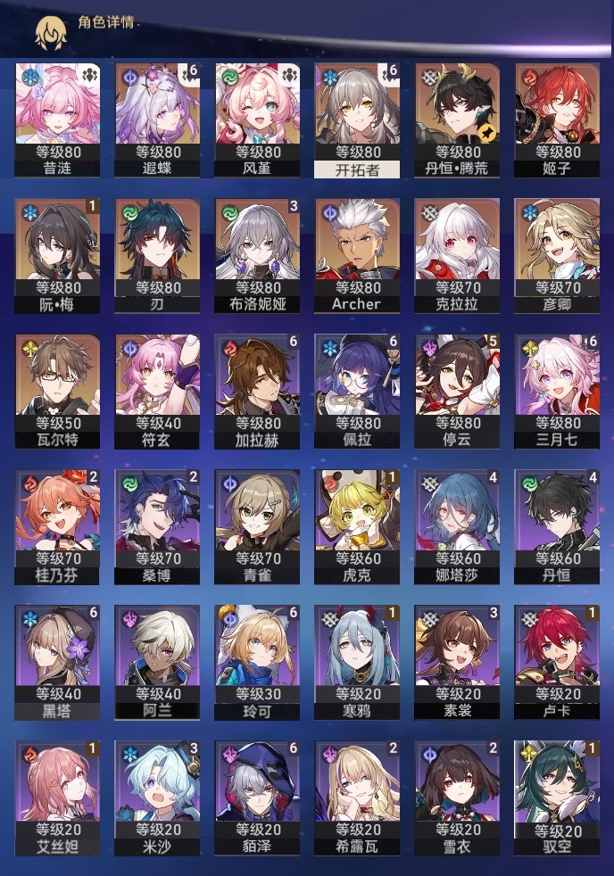 【崩坏·星穹铁道】【lyxq9761】冒险等级:70,女主,五星数量:21,五星角色:遐蝶 6命布洛妮娅 3命姬子彦卿瓦尔特克拉拉刃符玄风堇archer丹恒·腾荒昔涟__五星光锥:记忆永不落幕 5精星海巡航记一位星神的陨落以世界之名时节不居如泥酣眠让告别,更美一些理想燃烧的地狱爱如此刻永恒__四星角色:貊泽 6命黑塔 6命三月七 6命佩拉 6命玲可 6命加拉赫 6命停云 5命娜塔莎 4命丹恒 4命素裳 3命米沙 3命希露瓦 2命桑博 2命桂乃芬 2命雪衣 2命虎克 1命艾丝妲 1命驭空 1命卢卡 1命寒鸦 1命阿兰青雀满命遐蝶带辅助