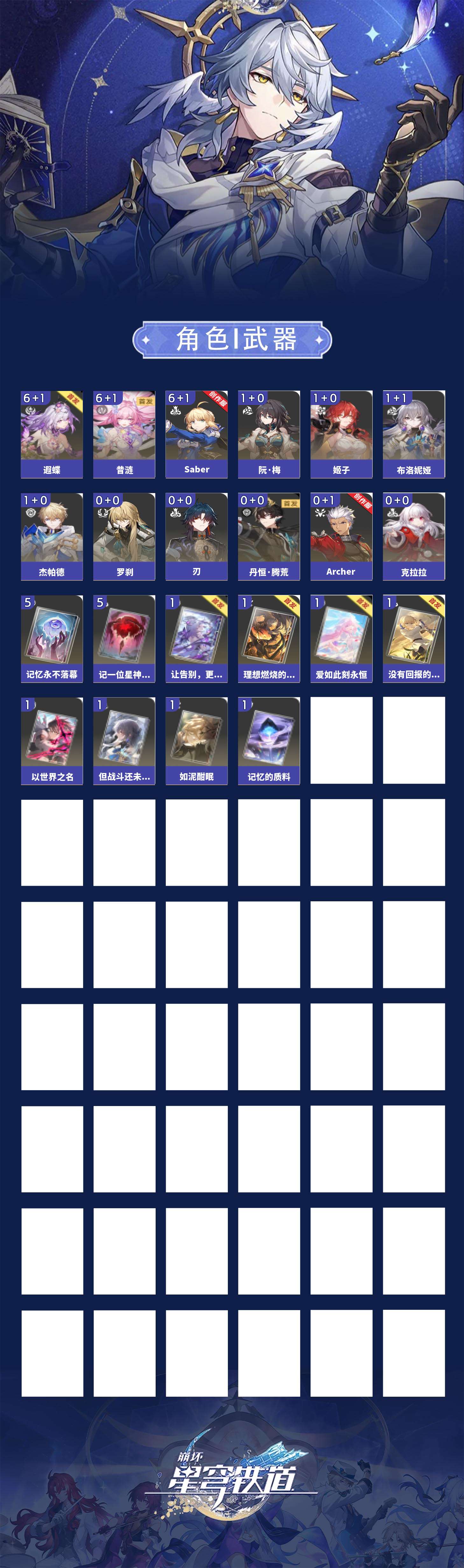 【崩坏·星穹铁道】【lyxq9841】冒险等级:70,女主,五星数量:22,绑定情况:手机号__五星角色:昔涟 6命|遐蝶 6命|saber 6命|姬子 1命|阮·梅 1命|杰帕德 1命|布洛妮娅 1命|罗刹|刃|丹恒·腾荒|克拉拉|archer__五星光锥:记一位星神的陨落 5精|记忆永不落幕 5精|没有回报的加冕|理想燃烧的地狱|如泥酣眠|但战斗还未结束|爱如此刻永恒|让告别,更美一些|以世界之名|记忆的质料,【邮箱未绑定】160抽