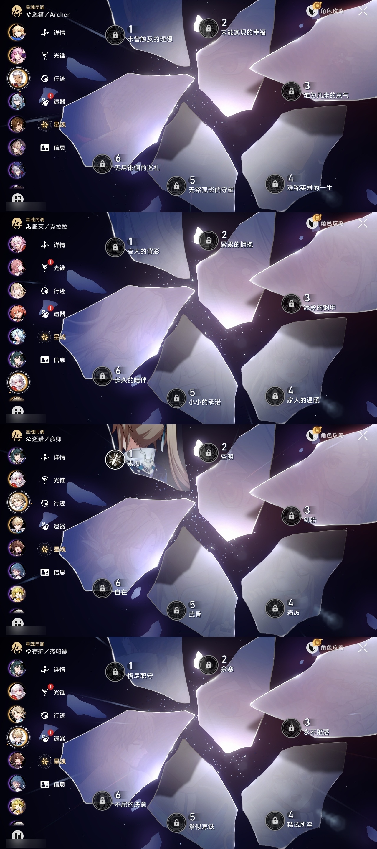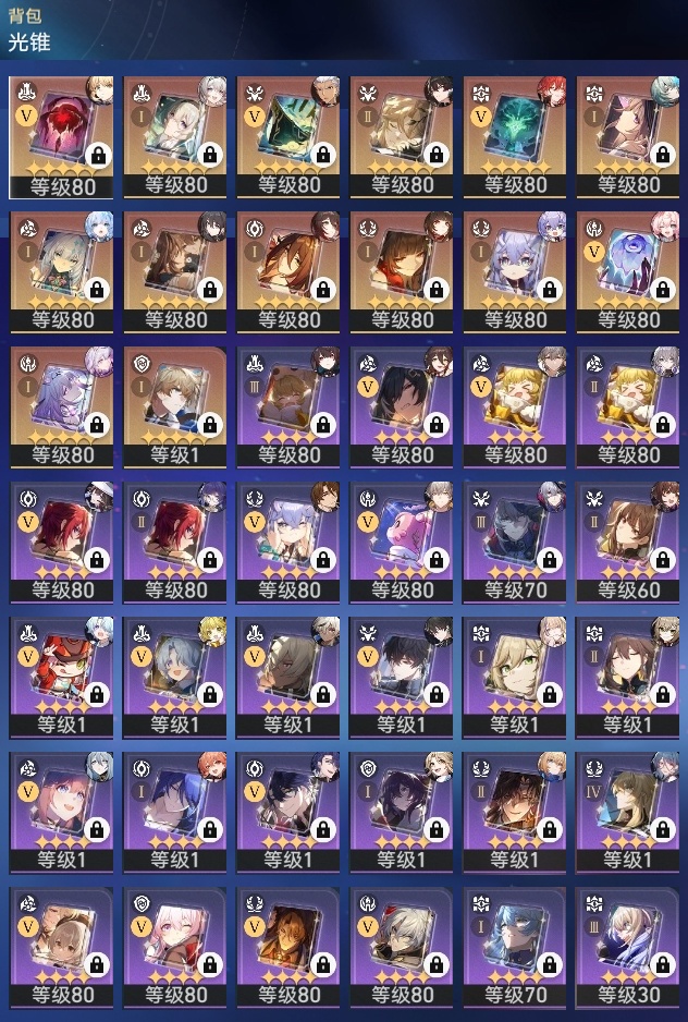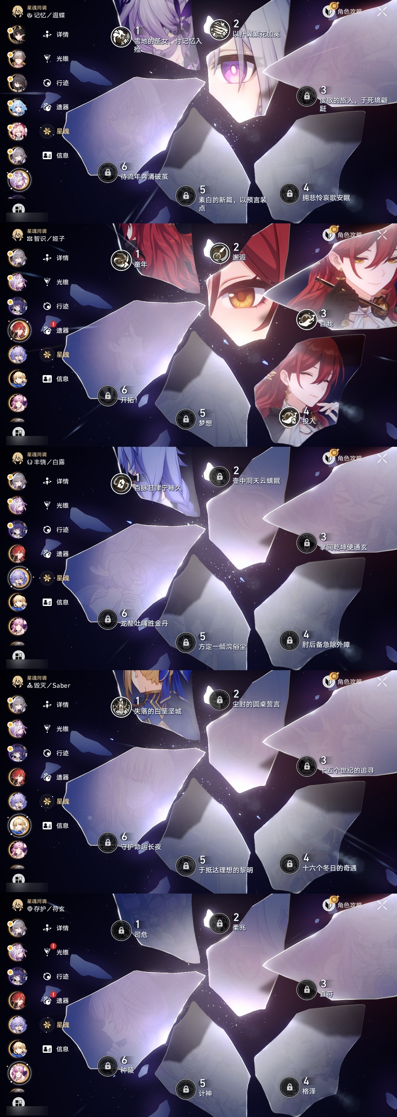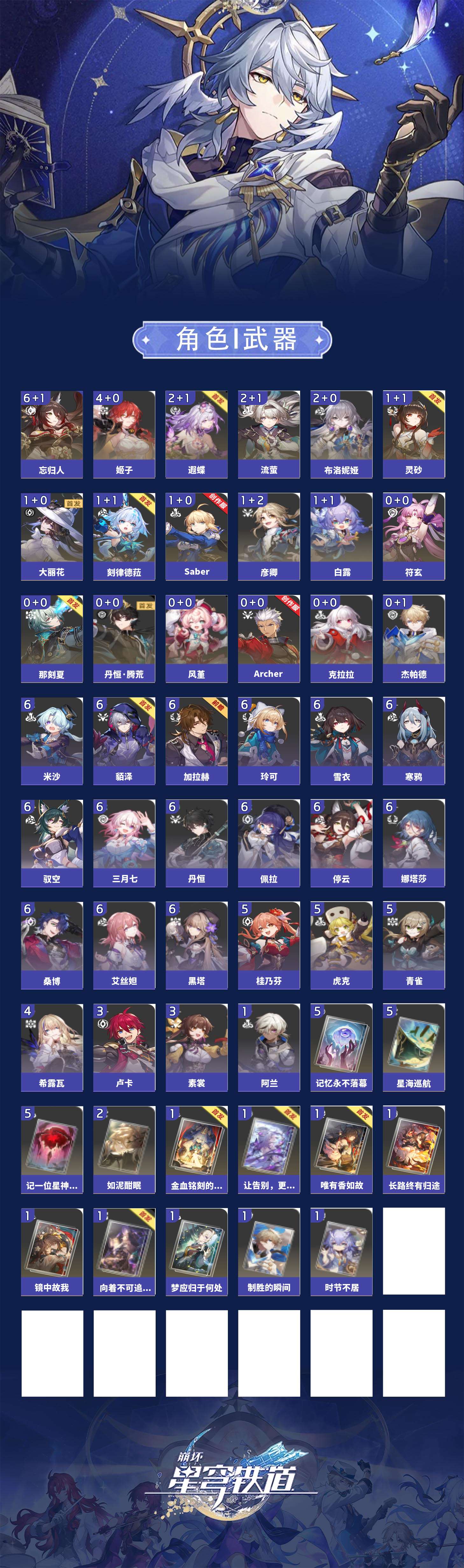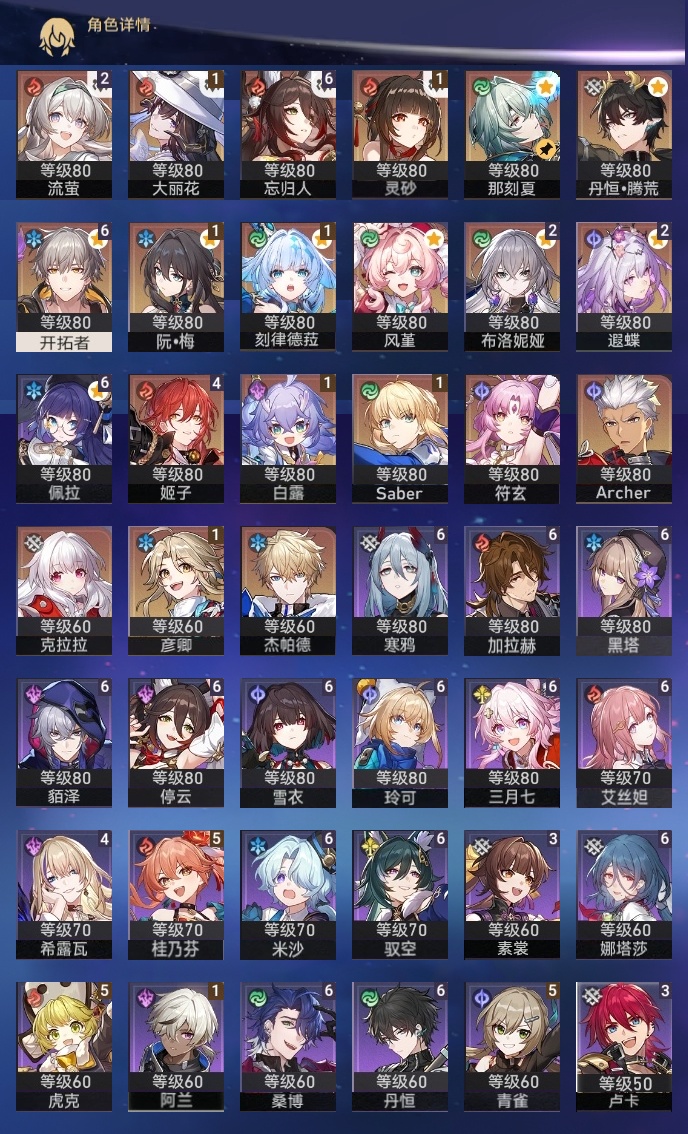【崩坏·星穹铁道】【lyxq9861】冒险等级:70,男主,五星数量:32,五星角色:忘归人 6命姬子 4命布洛妮娅 2命遐蝶 2命流萤 2命白露 1命灵砂 1命彦卿 1命saber 1命刻律德菈 1命大丽花 1命杰帕德克拉拉符玄那刻夏风堇archer丹恒·腾荒__五星光锥:星海巡航 5精记一位星神的陨落 5精不息的演算 5精记忆永不落幕 5精如泥酣眠 2精制胜的瞬间时节不居唯有香如故向着不可追问处长路终有归途让告别,更美一些镜中故我金血铭刻的时代梦应归于何处__四星角色:娜塔莎 6命貊泽 6命黑塔 6命丹恒 6命艾丝妲 6命停云 6命桑博 6命三月七 6命佩拉 6命驭空 6命玲可 6命寒鸦 6命雪衣 6命米沙 6命加拉赫 6命虎克 5命青雀 5命桂乃芬 5命希露瓦 4命素裳 3命卢卡 3命阿兰 1命