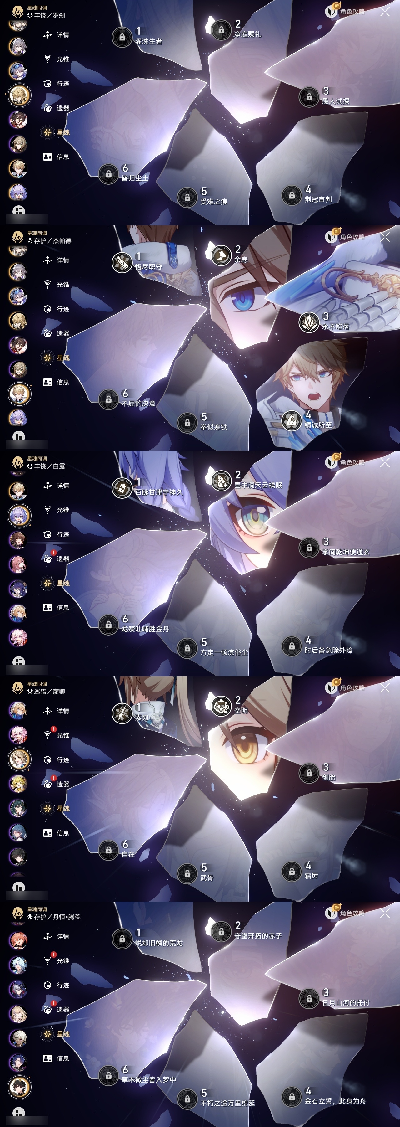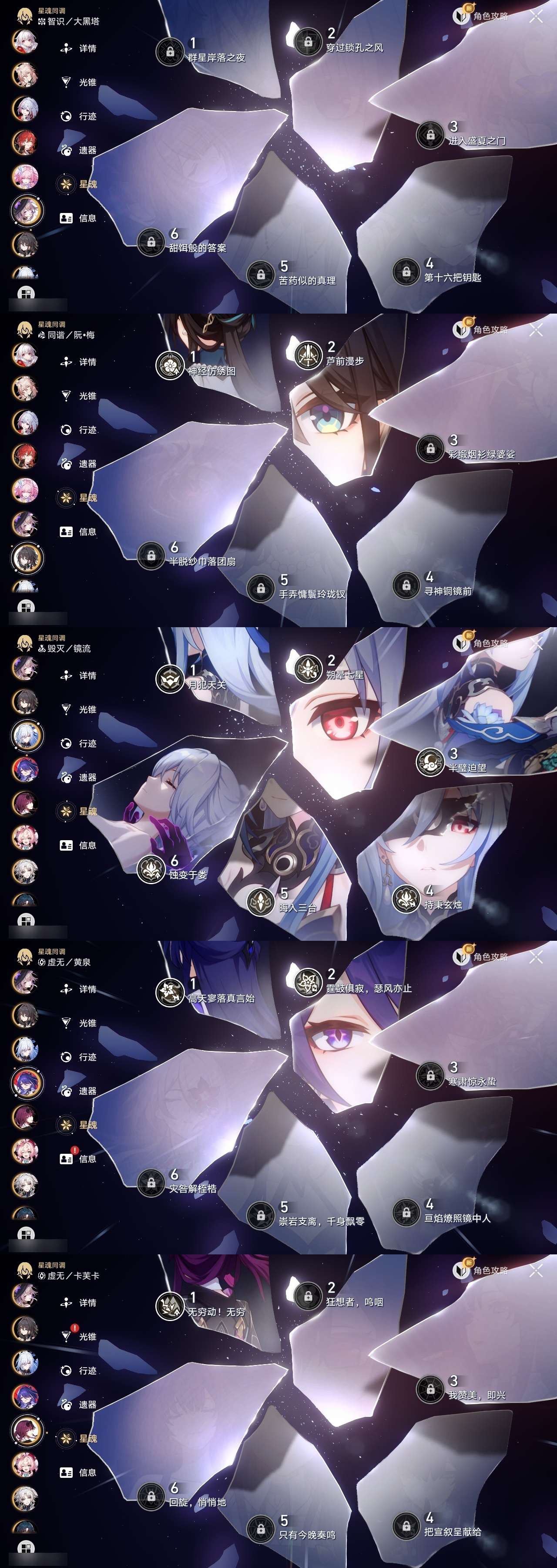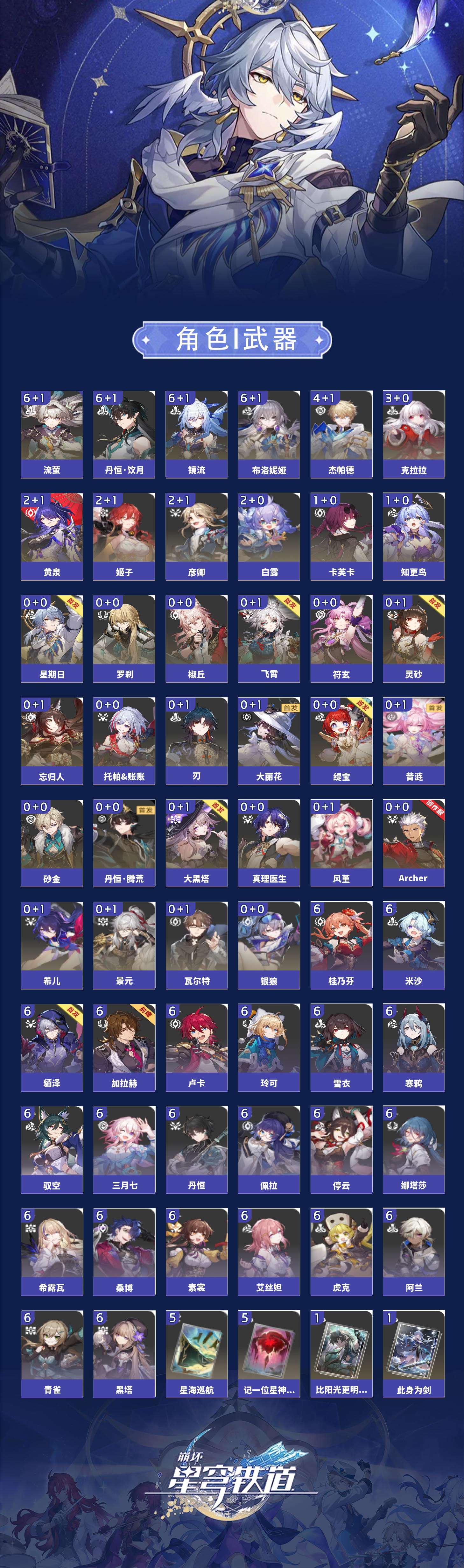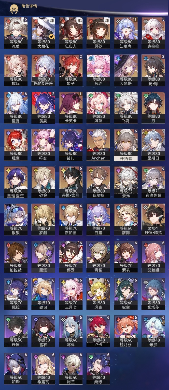 【崩坏·星穹铁道】【lyxq9830】冒险等级:70,女主,五星数量:60,五星角色:布洛妮娅 6命丹恒·饮月 6命镜流 6命流萤 6命杰帕德 4命克拉拉 3命白露 2命姬子 2命彦卿 2命黄泉 2命卡芙卡 1命知更鸟 1命椒丘飞霄银狼景元希儿灵砂瓦尔特星期日大黑塔忘归人罗刹缇宝刃符玄托帕账账真理医生风堇砂金archer丹恒·腾荒昔涟大丽花__五星光锥:星海巡航 5精记一位星神的陨落 5精制胜的瞬间银河铁道之夜以世界之名如泥酣眠如泥酣眠但战斗还未结束但战斗还未结束但战斗还未结束于夜色中拂晓之前我将,巡征追猎唯有香如故不息的演算向着不可追问处长路终有归途到不了的彼岸孤独的疗愈比阳光更明亮的此身为剑行于流逝的岸愿虹光永驻天空爱如此刻永恒勿忘她的火焰梦应归于何处__四星角色:阿兰 6命娜塔莎 6命虎克 6命貊泽 6命黑塔 6命丹恒 6命艾丝妲 6命希露瓦 6命停云 6命素裳 6命桑博 6命三月七 6命青雀 6命佩拉 6命驭空 6命卢卡 6命玲可 6命桂乃芬 6命寒鸦 6命雪衣 6命米沙 6命加拉赫 6命61流萤击破队 61镜流 61饮月丹恒 21黄泉队 01大黑塔队