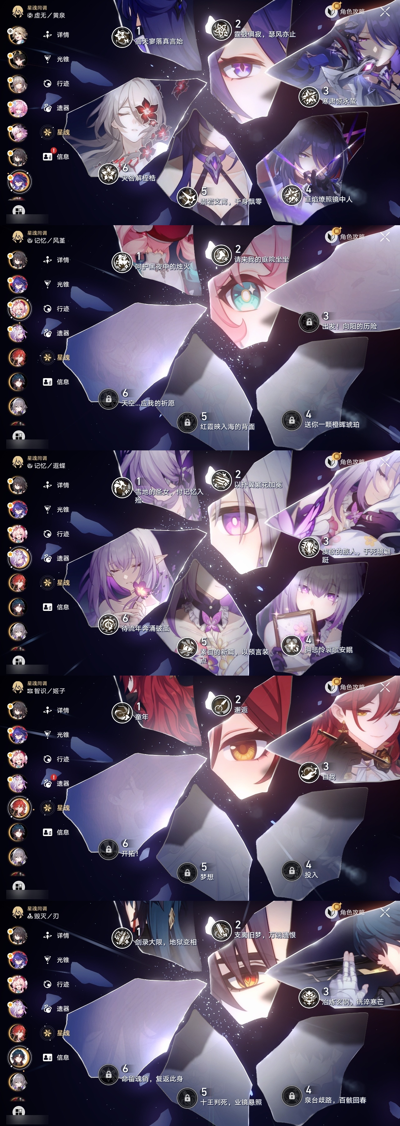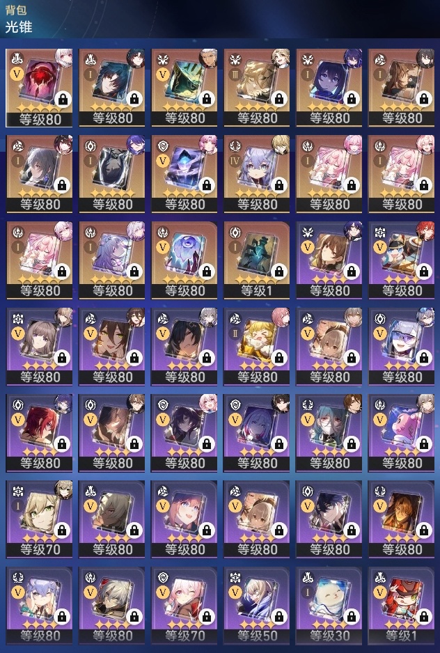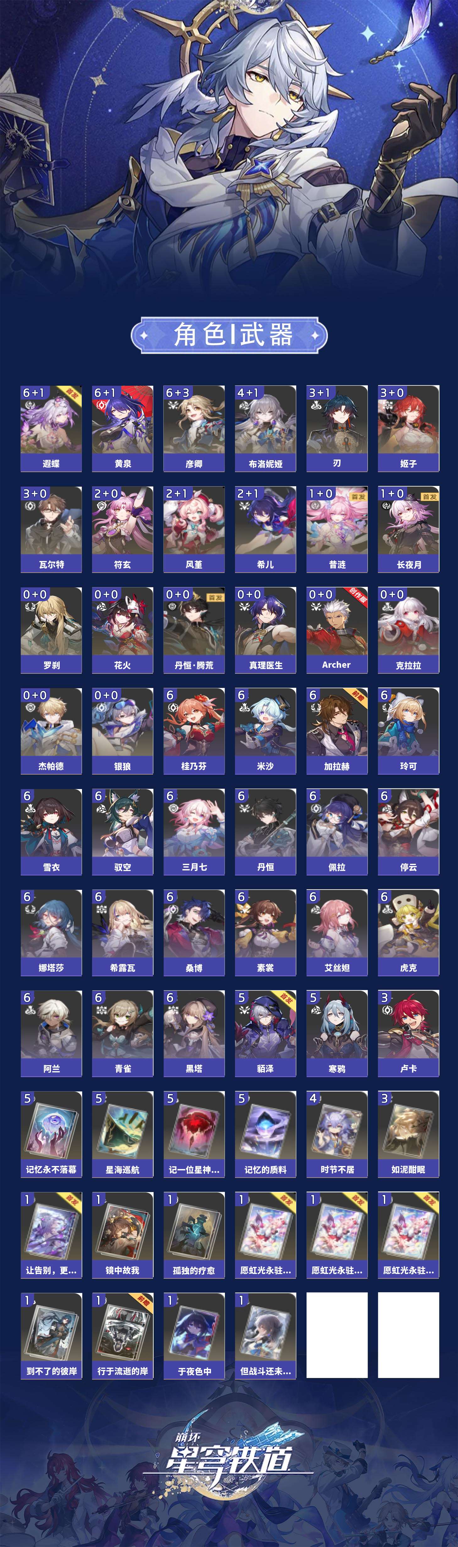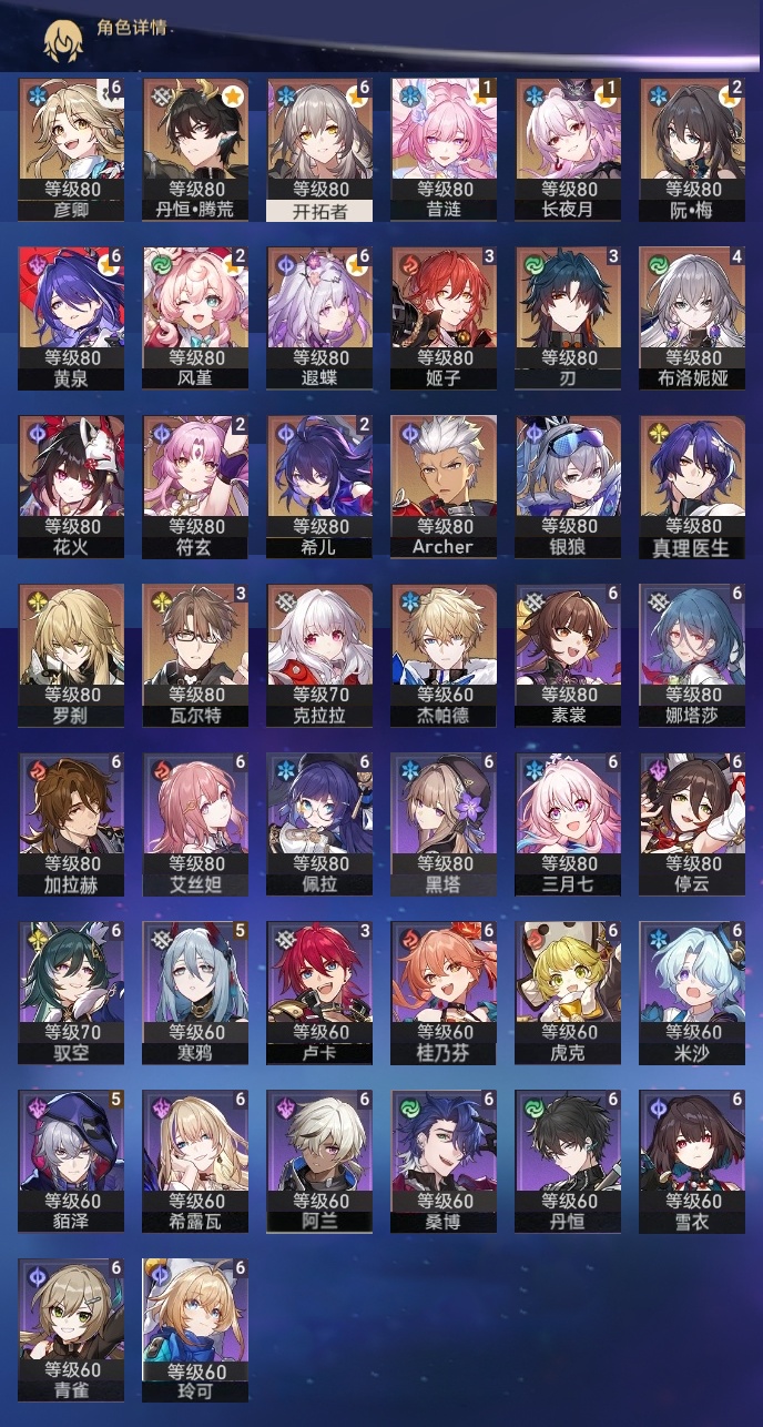 【崩坏·星穹铁道】【lyxq9881】冒险等级:70,女主,五星数量:36,五星角色:彦卿 6命遐蝶 6命黄泉 6命布洛妮娅 4命姬子 3命瓦尔特 3命刃 3命希儿 2命符玄 2命风堇 2命长夜月 1命昔涟 1命银狼杰帕德克拉拉罗刹真理医生花火archer丹恒·腾荒__五星光锥:星海巡航 5精记忆的质料 5精记一位星神的陨落 5精记忆永不落幕 5精时节不居 4精如泥酣眠 3精但战斗还未结束于夜色中到不了的彼岸孤独的疗愈让告别,更美一些镜中故我行于流逝的岸愿虹光永驻天空愿虹光永驻天空愿虹光永驻天空__四星角色:阿兰 6命娜塔莎 6命虎克 6命黑塔 6命丹恒 6命艾丝妲 6命希露瓦 6命停云 6命素裳 6命桑博 6命三月七 6命青雀 6命佩拉 6命驭空 6命玲可 6命桂乃芬 6命雪衣 6命米沙 6命加拉赫 6命貊泽 5命寒鸦 5命卢卡 3命满命瑕蝶记忆战舰和满命黄泉队带153抽