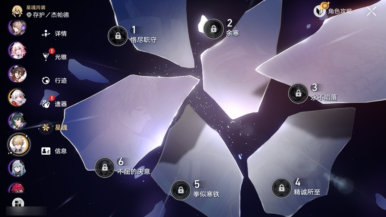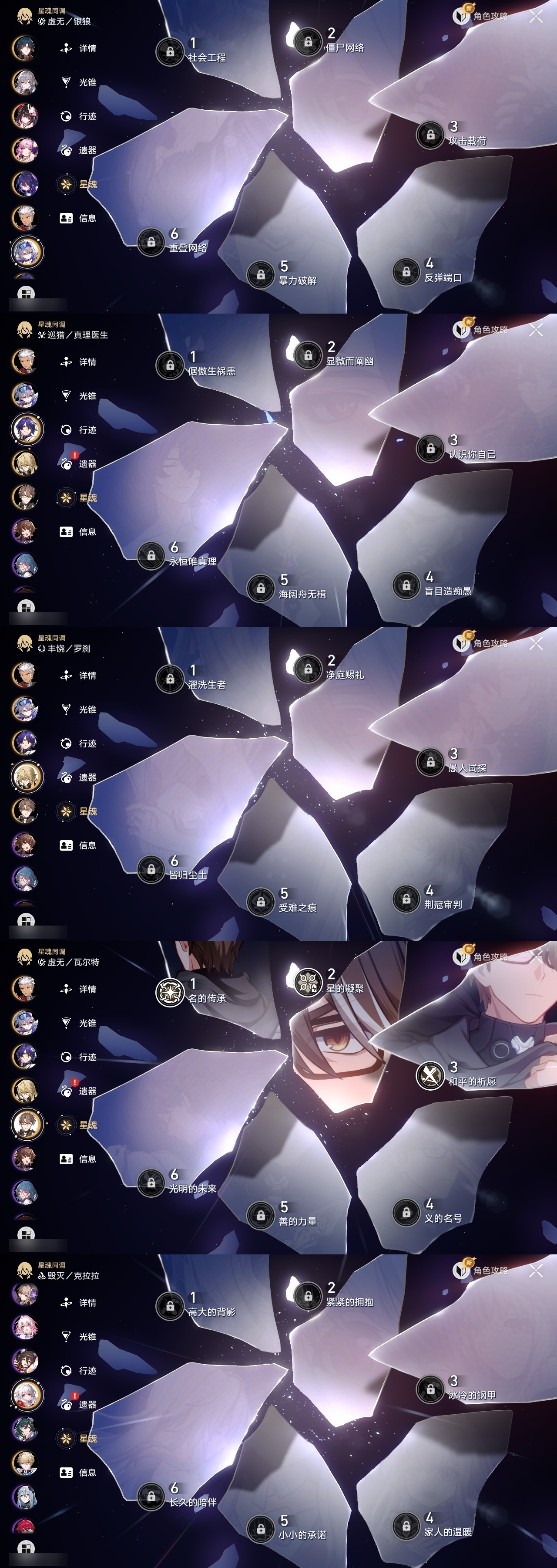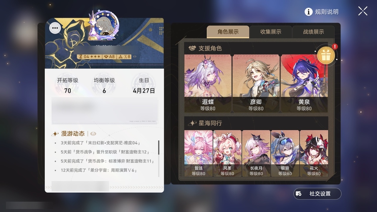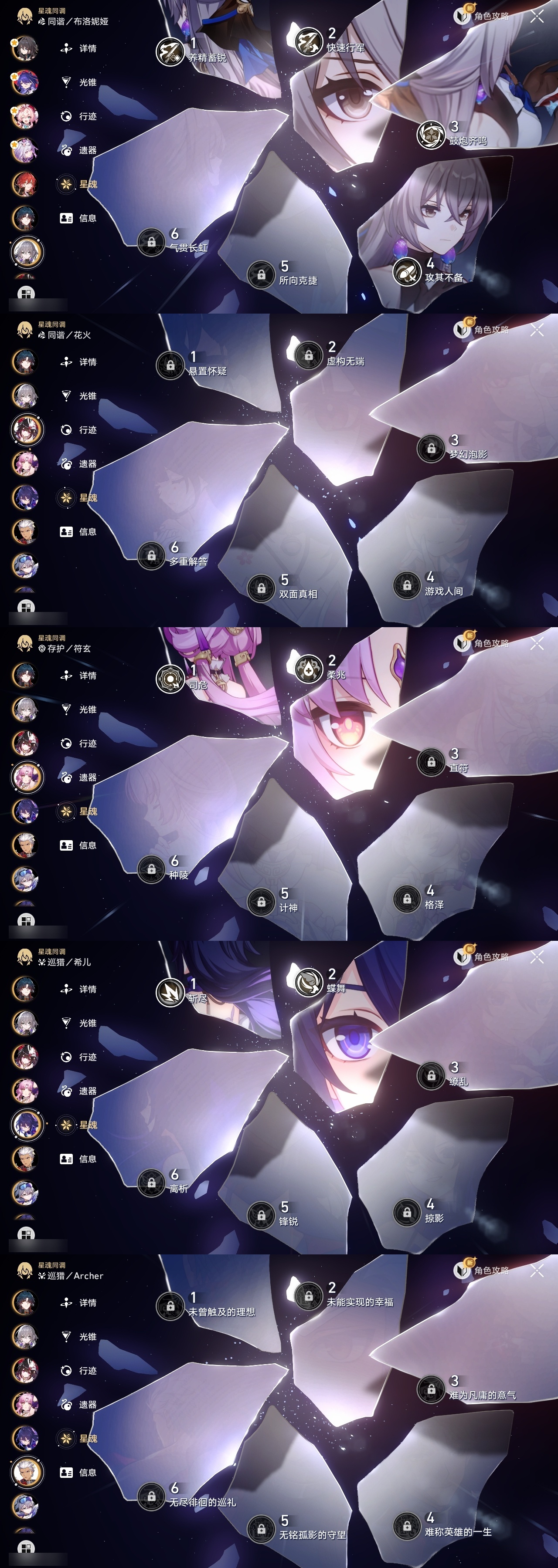 【崩坏·星穹铁道】【lyxq9881】冒险等级:70,女主,五星数量:36,五星角色:彦卿 6命遐蝶 6命黄泉 6命布洛妮娅 4命姬子 3命瓦尔特 3命刃 3命希儿 2命符玄 2命风堇 2命长夜月 1命昔涟 1命银狼杰帕德克拉拉罗刹真理医生花火archer丹恒·腾荒__五星光锥:星海巡航 5精记忆的质料 5精记一位星神的陨落 5精记忆永不落幕 5精时节不居 4精如泥酣眠 3精但战斗还未结束于夜色中到不了的彼岸孤独的疗愈让告别,更美一些镜中故我行于流逝的岸愿虹光永驻天空愿虹光永驻天空愿虹光永驻天空__四星角色:阿兰 6命娜塔莎 6命虎克 6命黑塔 6命丹恒 6命艾丝妲 6命希露瓦 6命停云 6命素裳 6命桑博 6命三月七 6命青雀 6命佩拉 6命驭空 6命玲可 6命桂乃芬 6命雪衣 6命米沙 6命加拉赫 6命貊泽 5命寒鸦 5命卢卡 3命满命瑕蝶记忆战舰和满命黄泉队带153抽