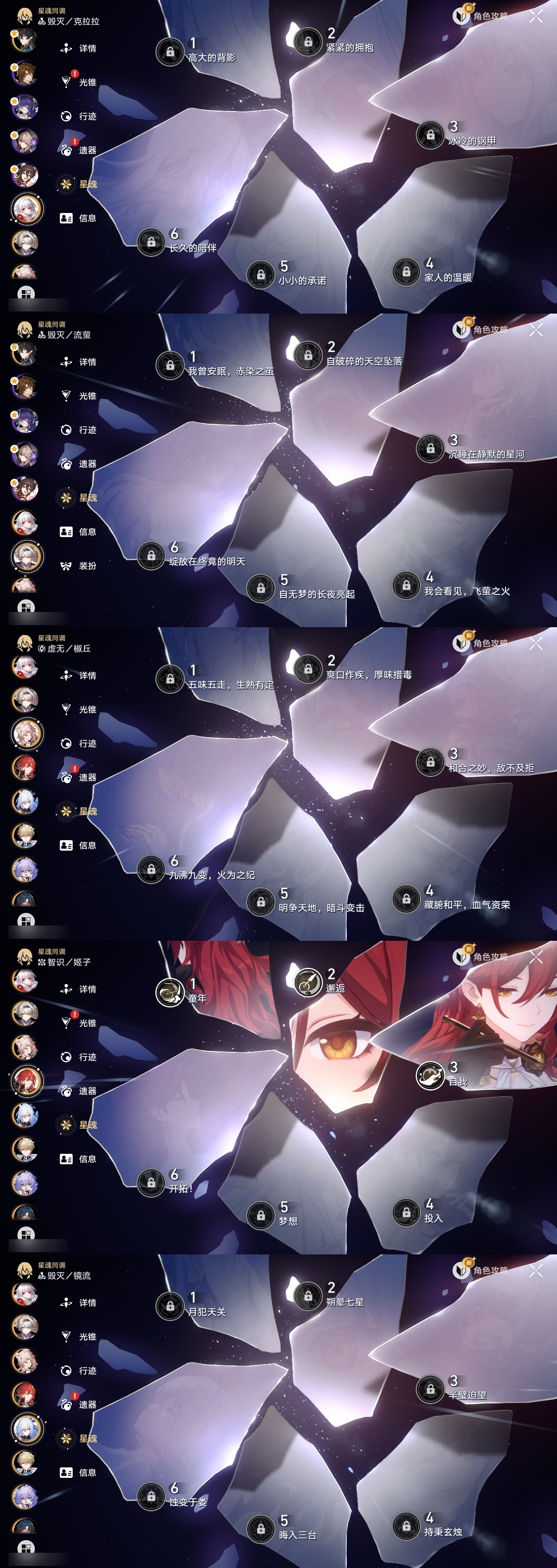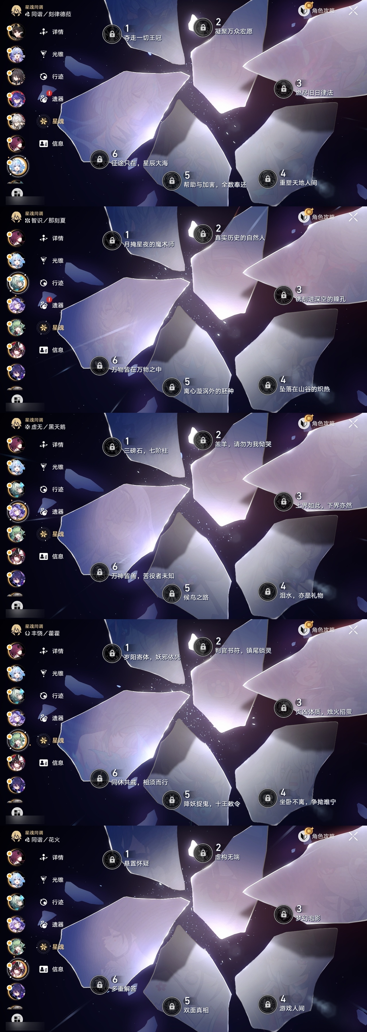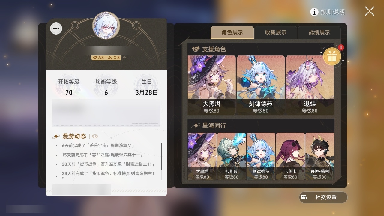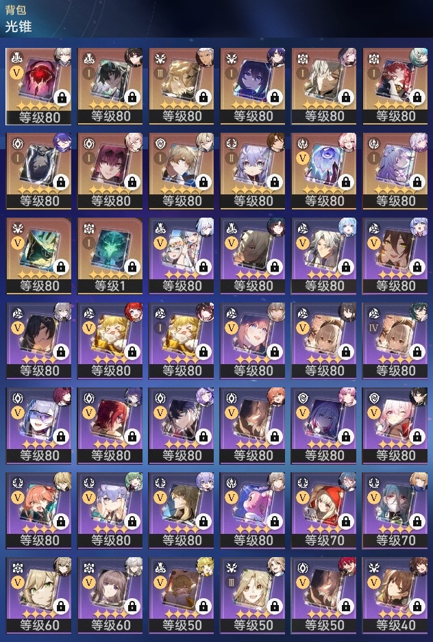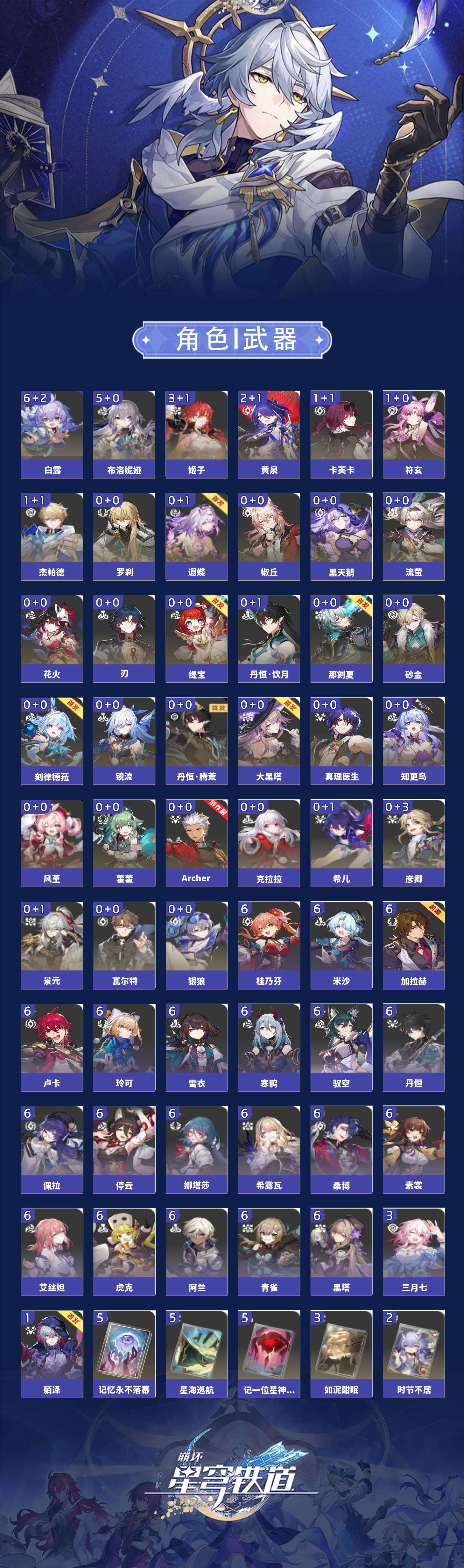 【崩坏·星穹铁道】【lyxq9876】冒险等级:70,女主,五星数量:47,五星角色:白露 6命布洛妮娅 5命姬子 3命黄泉 2命杰帕德 1命卡芙卡 1命符玄 1命椒丘银狼景元希儿彦卿瓦尔特克拉拉大黑塔罗刹缇宝刃丹恒·饮月遐蝶镜流藿藿真理医生黑天鹅花火那刻夏风堇砂金知更鸟archer刻律德菈丹恒·腾荒流萤__五星光锥:星海巡航 5精记一位星神的陨落 5精记忆永不落幕 5精如泥酣眠 3精时节不居 2精制胜的瞬间银河铁道之夜于夜色中拂晓之前不息的演算只需等待比阳光更明亮的让告别,更美一些行于流逝的岸__四星角色:阿兰 6命娜塔莎 6命虎克 6命黑塔 6命丹恒 6命艾丝妲 6命希露瓦 6命停云 6命素裳 6命桑博 6命青雀 6命佩拉 6命驭空 6命卢卡 6命玲可 6命桂乃芬 6命寒鸦 6命雪衣 6命米沙 6命加拉赫 6命三月七 3命貊泽 1命