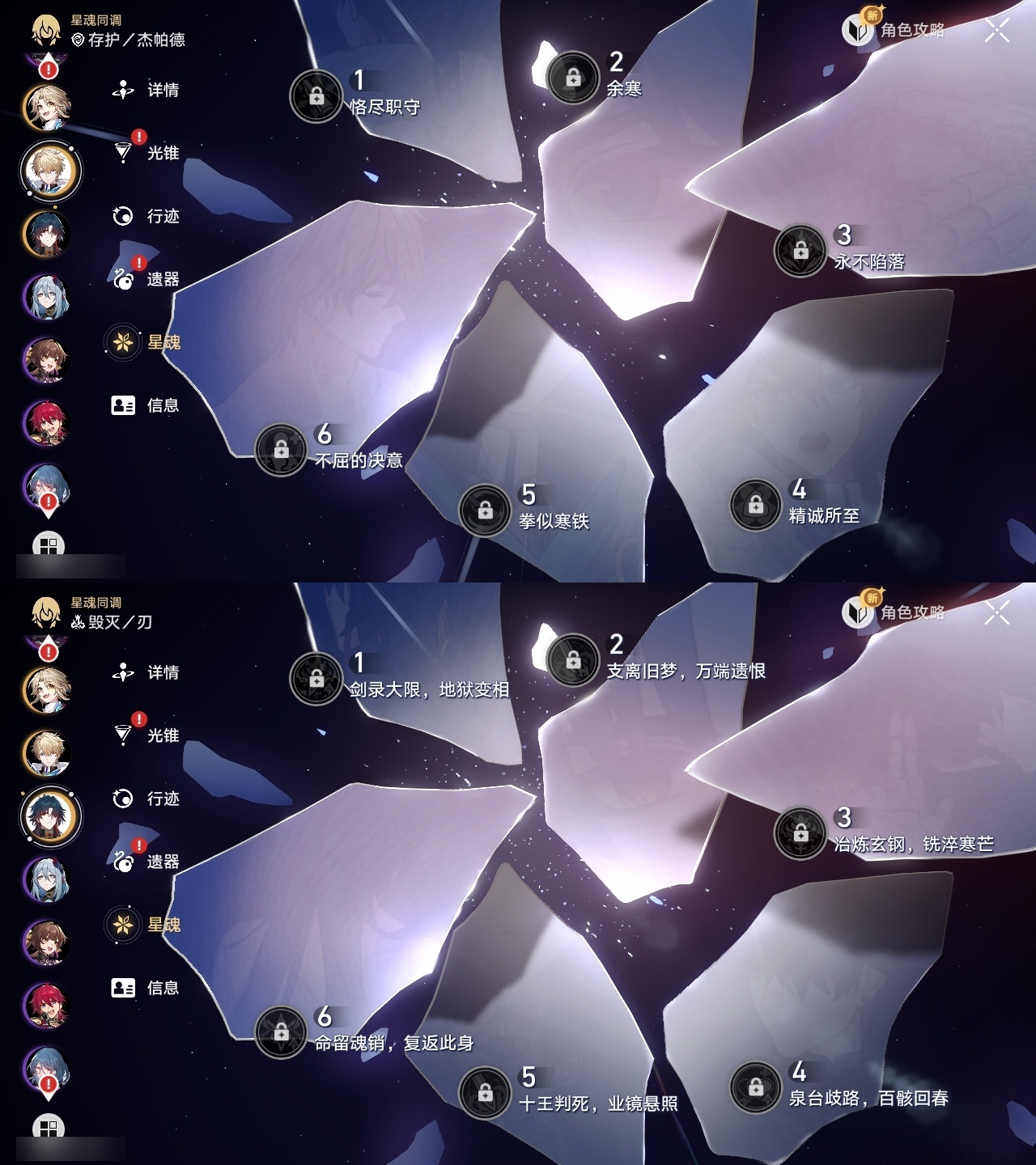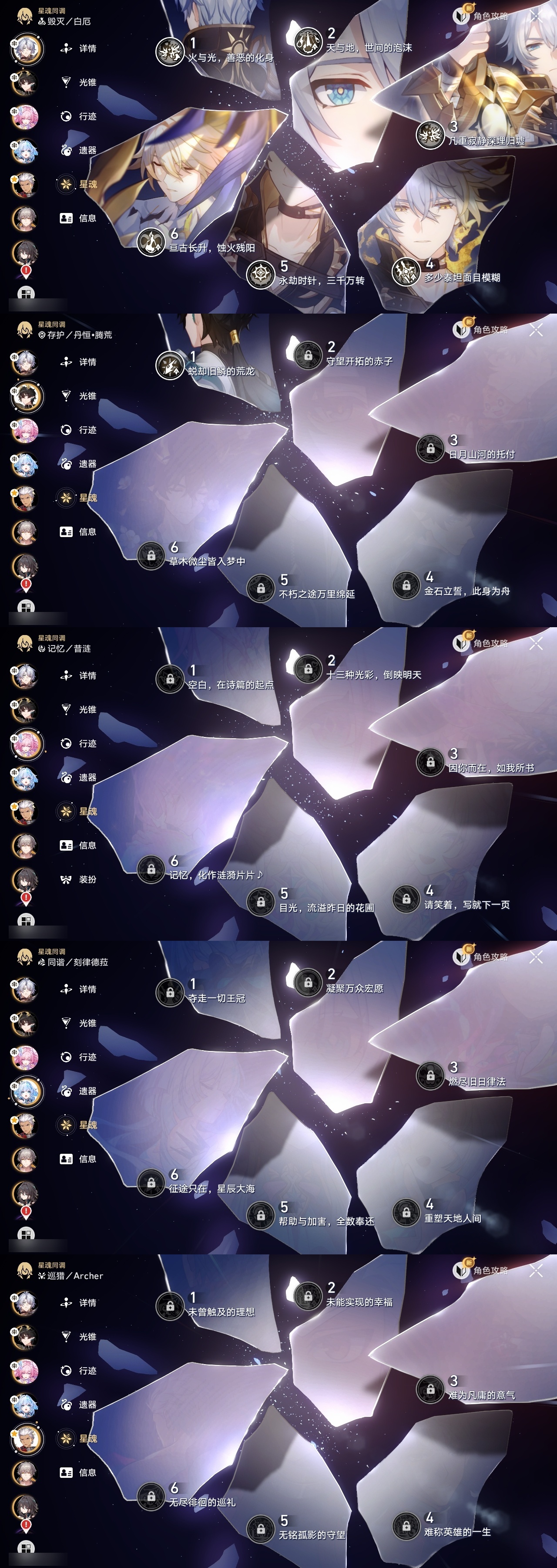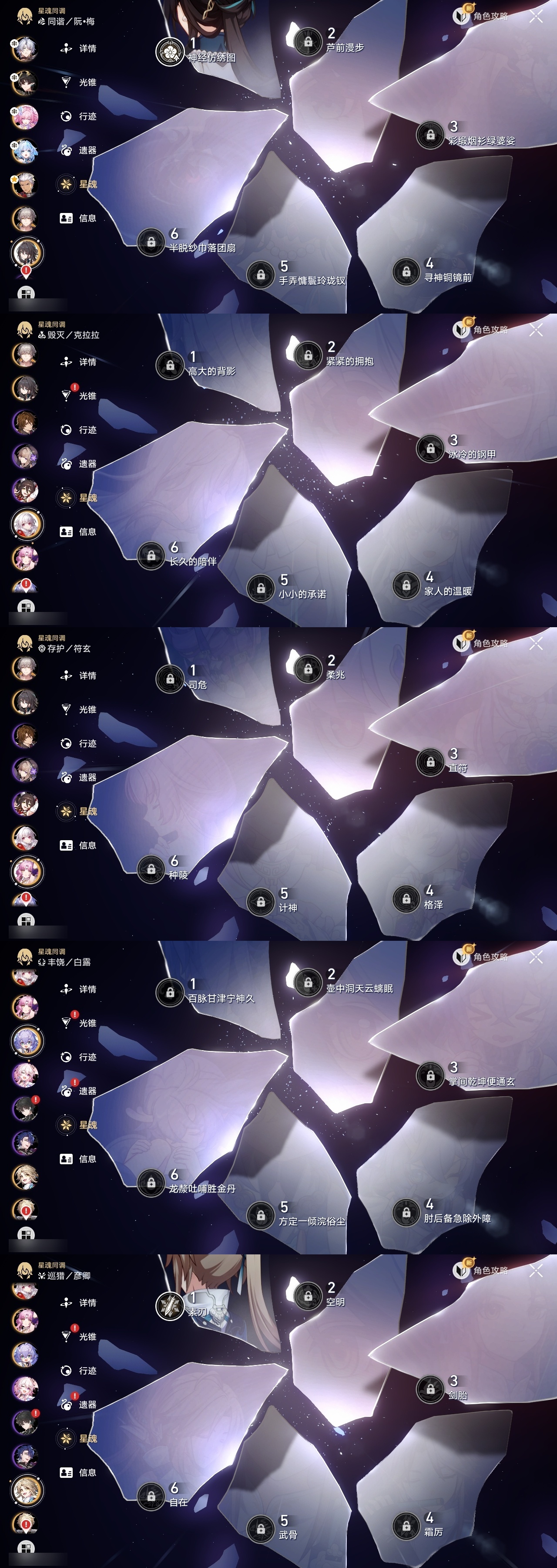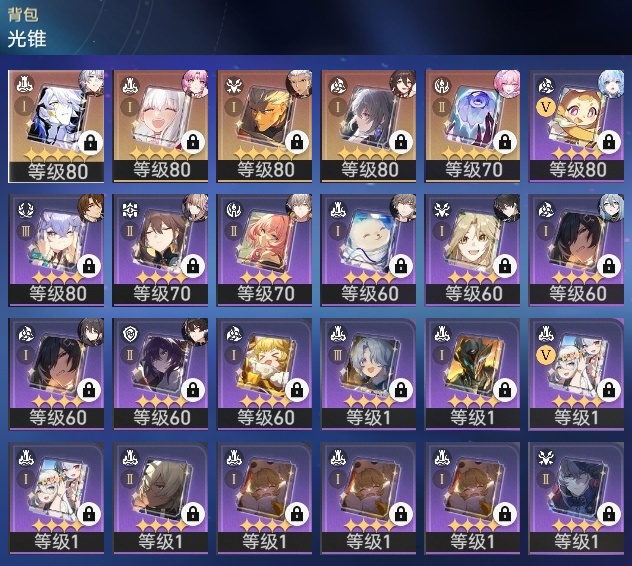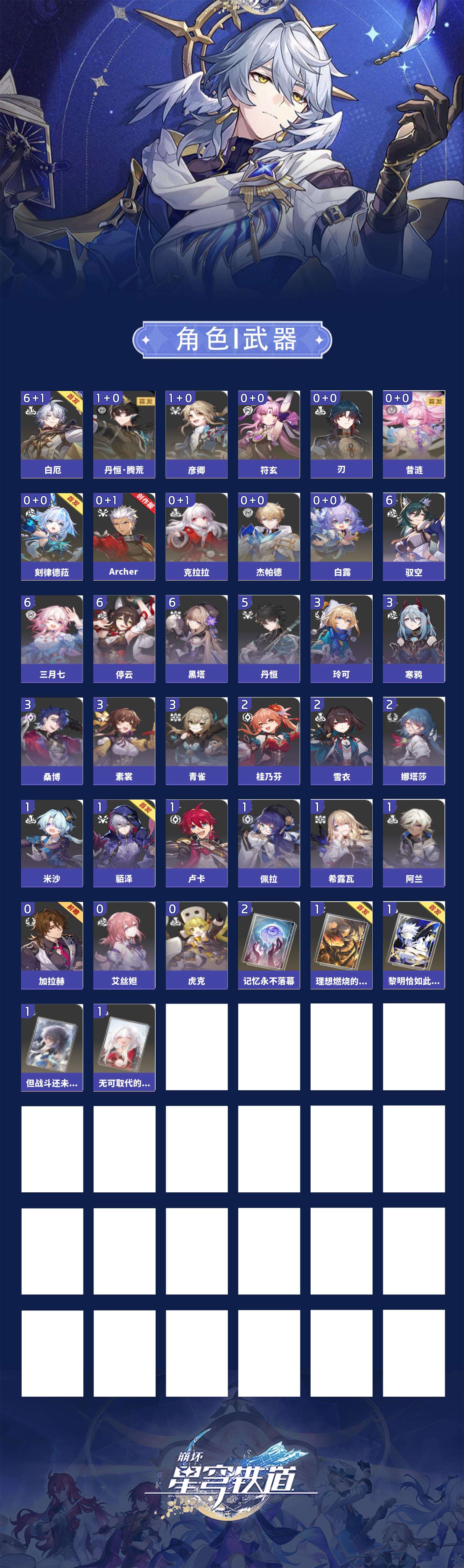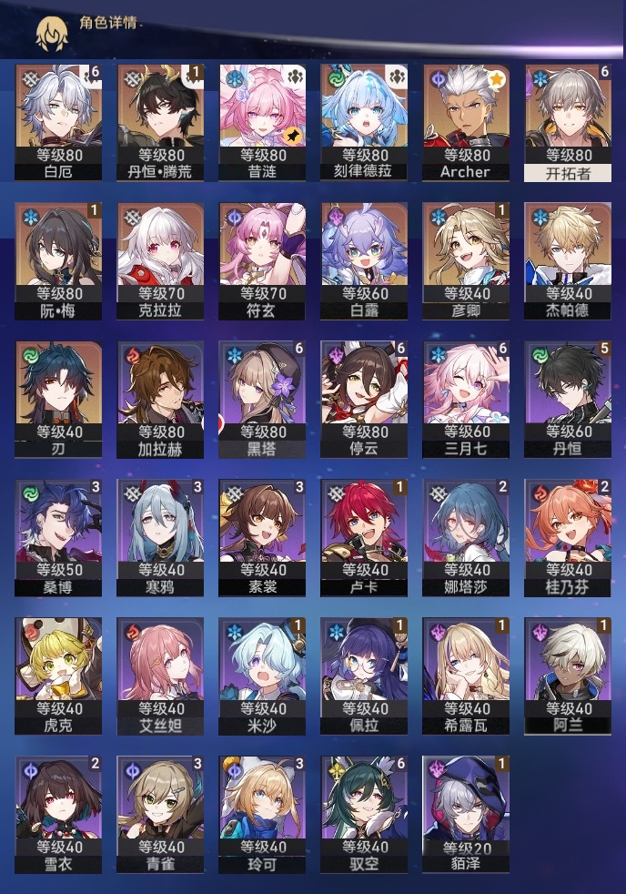 【崩坏·星穹铁道】【lyxq9870】冒险等级:70,男主,五星数量:16,五星角色:白厄 6命彦卿 1命丹恒·腾荒 1命白露杰帕德克拉拉刃符玄archer刻律德菈昔涟__五星光锥:记忆永不落幕 2精无可取代的东西但战斗还未结束黎明恰如此燃烧理想燃烧的地狱__四星角色:黑塔 6命停云 6命三月七 6命驭空 6命丹恒 5命素裳 3命桑博 3命青雀 3命玲可 3命寒鸦 3命娜塔莎 2命桂乃芬 2命雪衣 2命阿兰 1命貊泽 1命希露瓦 1命佩拉 1命卢卡 1命米沙 1命虎克艾丝妲加拉赫满命白厄,昔涟,刻律