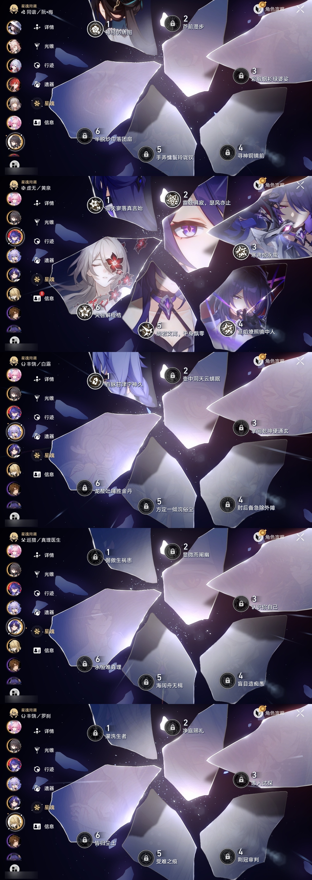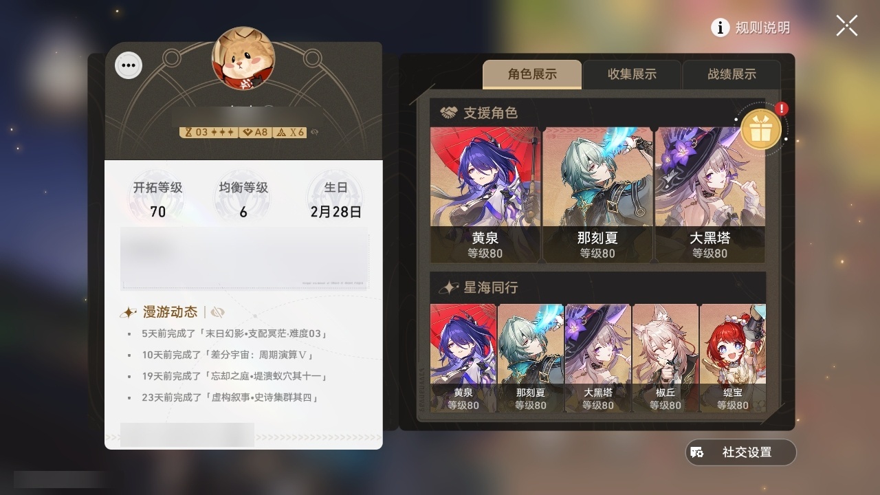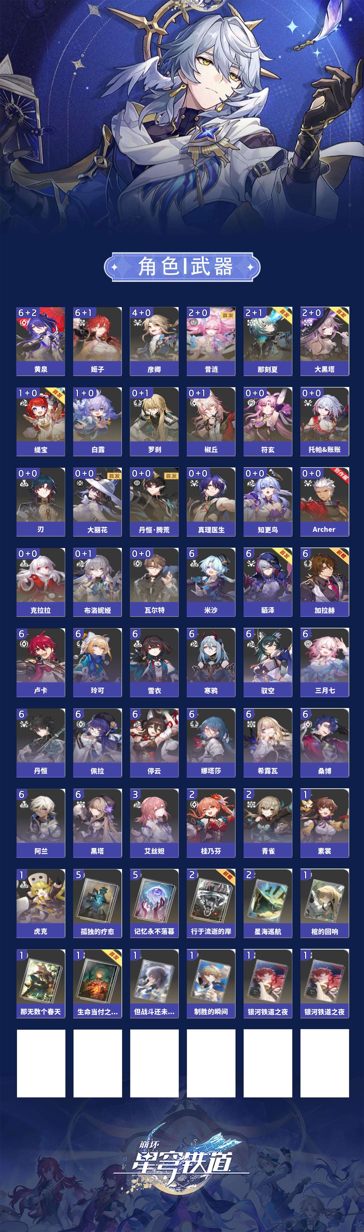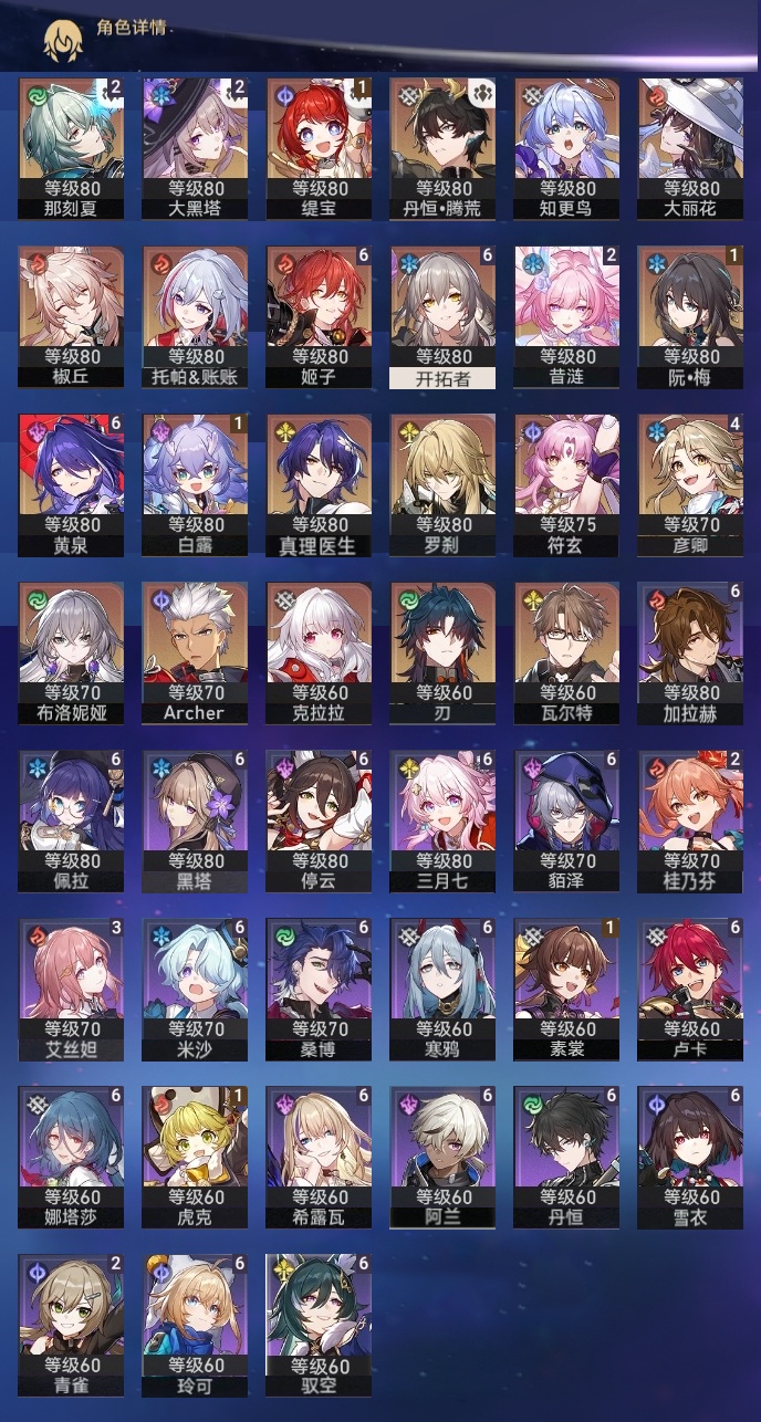 【崩坏·星穹铁道】【lyxq9835】冒险等级:70,女主,五星数量:33,五星角色:姬子 6命黄泉 6命彦卿 4命大黑塔 2命那刻夏 2命昔涟 2命白露 1命缇宝 1命椒丘布洛妮娅瓦尔特克拉拉罗刹刃符玄托帕账账真理医生知更鸟archer丹恒·腾荒大丽花__五星光锥:不息的演算 5精孤独的疗愈 5精记忆永不落幕 5精星海巡航 2精行于流逝的岸 2精那无数个春天制胜的瞬间银河铁道之夜银河铁道之夜但战斗还未结束棺的回响生命当付之一炬__四星角色:阿兰 6命娜塔莎 6命貊泽 6命黑塔 6命丹恒 6命希露瓦 6命停云 6命桑博 6命三月七 6命佩拉 6命驭空 6命卢卡 6命玲可 6命寒鸦 6命雪衣 6命米沙 6命加拉赫 6命艾丝妲 3命青雀 2命桂乃芬 2命虎克 1命素裳 1命