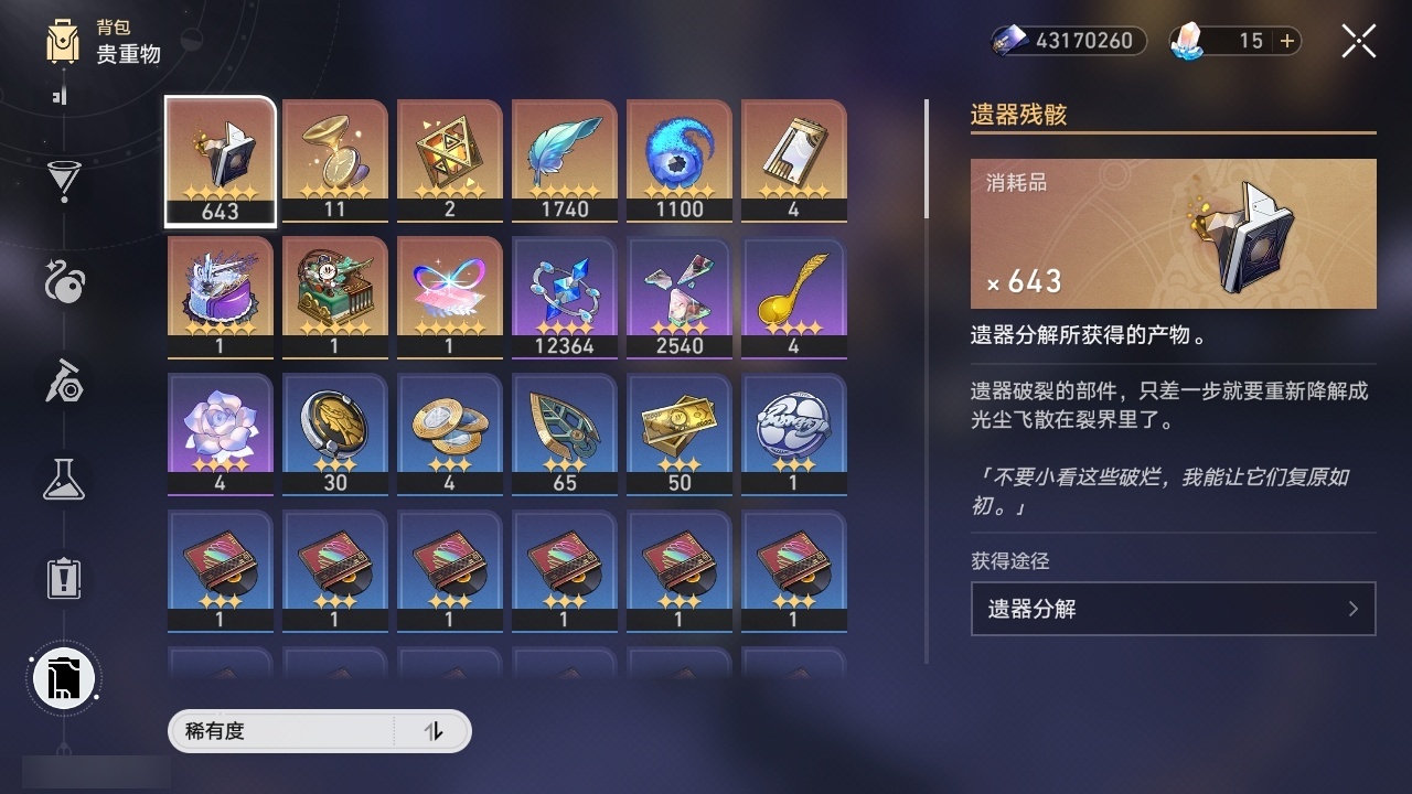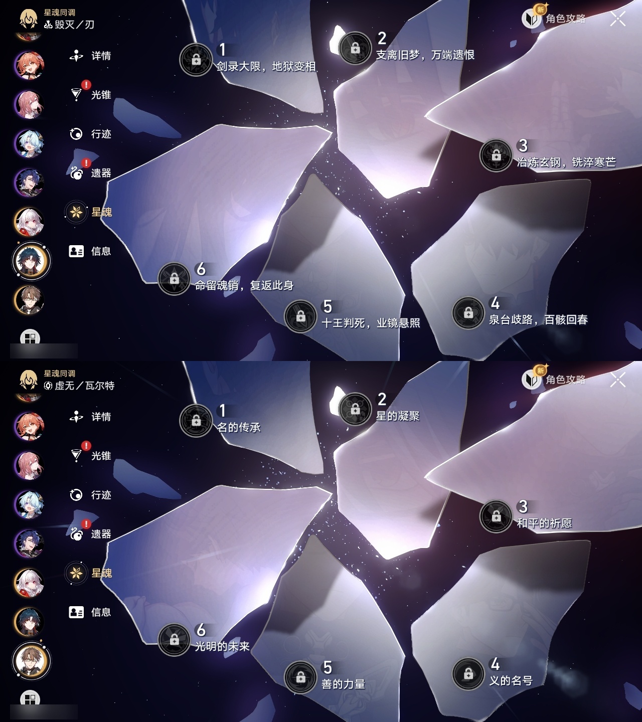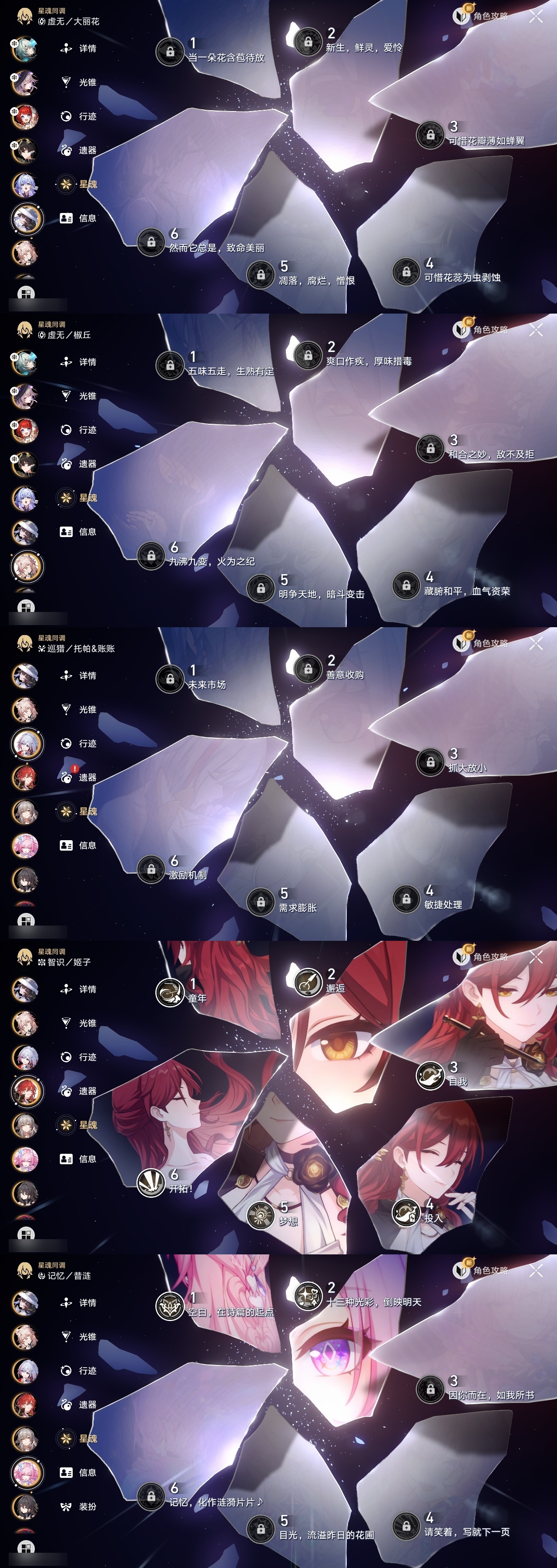 【崩坏·星穹铁道】【lyxq9835】冒险等级:70,女主,五星数量:33,五星角色:姬子 6命黄泉 6命彦卿 4命大黑塔 2命那刻夏 2命昔涟 2命白露 1命缇宝 1命椒丘布洛妮娅瓦尔特克拉拉罗刹刃符玄托帕账账真理医生知更鸟archer丹恒·腾荒大丽花__五星光锥:不息的演算 5精孤独的疗愈 5精记忆永不落幕 5精星海巡航 2精行于流逝的岸 2精那无数个春天制胜的瞬间银河铁道之夜银河铁道之夜但战斗还未结束棺的回响生命当付之一炬__四星角色:阿兰 6命娜塔莎 6命貊泽 6命黑塔 6命丹恒 6命希露瓦 6命停云 6命桑博 6命三月七 6命佩拉 6命驭空 6命卢卡 6命玲可 6命寒鸦 6命雪衣 6命米沙 6命加拉赫 6命艾丝妲 3命青雀 2命桂乃芬 2命虎克 1命素裳 1命