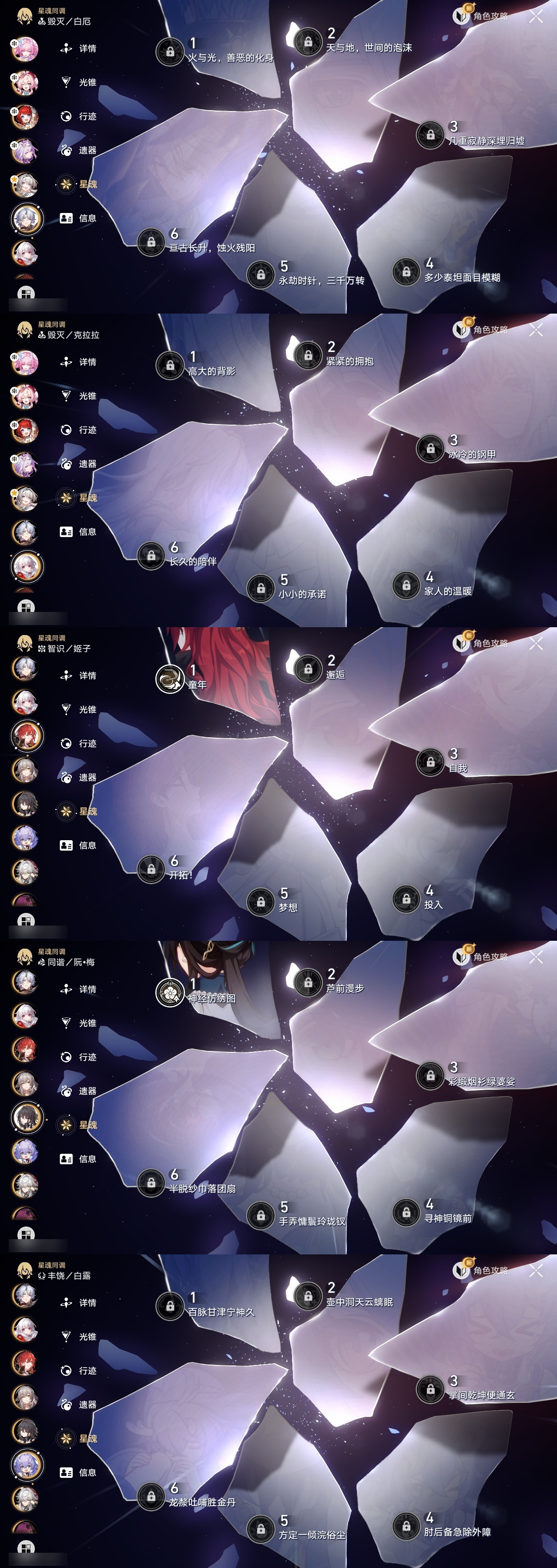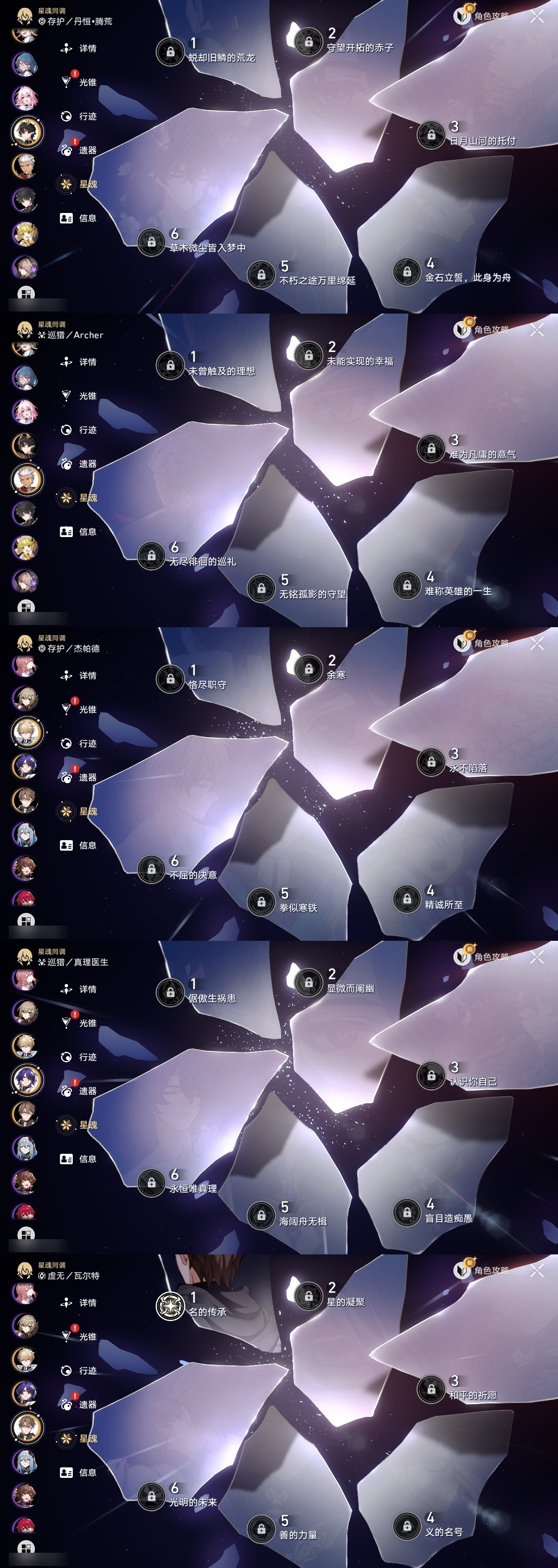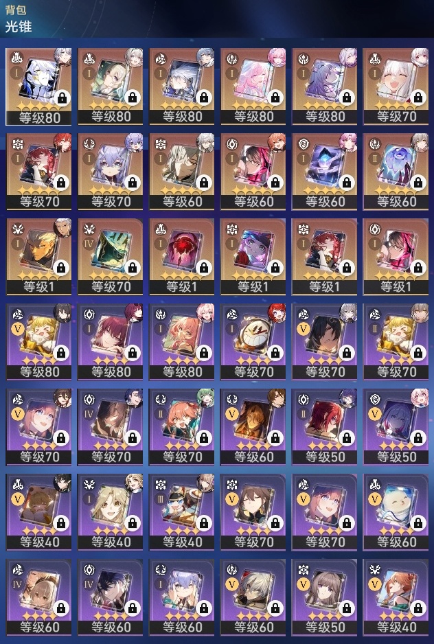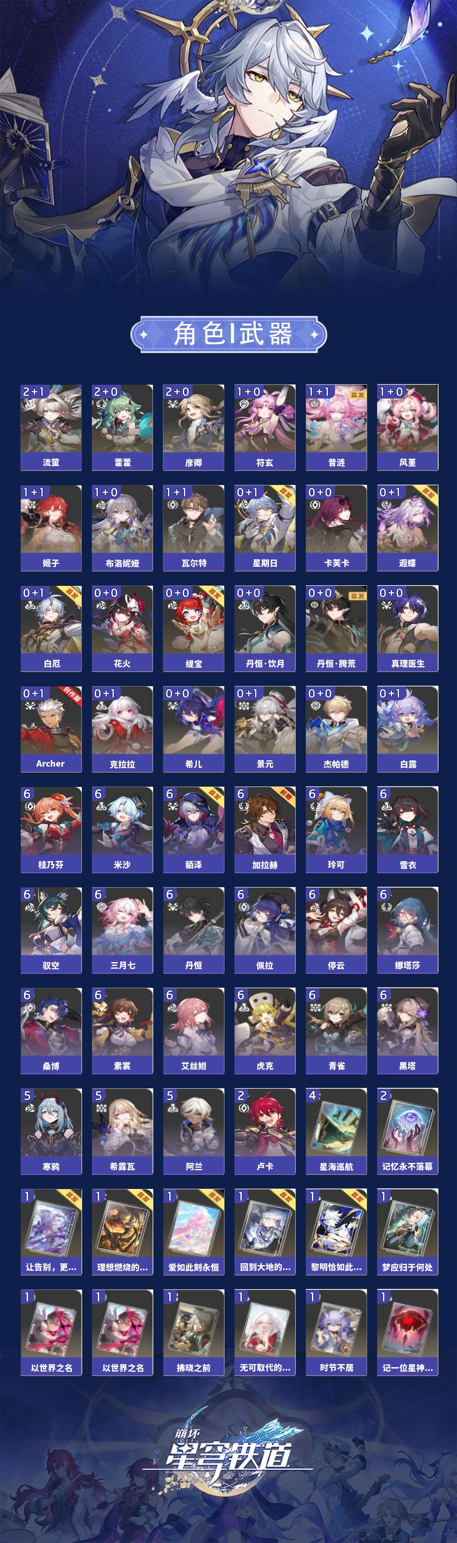 【崩坏·星穹铁道】【lyxq9891】冒险等级:70,女主,五星数量:41,五星角色:彦卿 2命藿藿 2命流萤 2命布洛妮娅 1命姬子 1命瓦尔特 1命符玄 1命风堇 1命昔涟 1命景元希儿白露杰帕德克拉拉星期日缇宝卡芙卡丹恒·饮月遐蝶真理医生花火白厄archer丹恒·腾荒__五星光锥:星海巡航 4精记忆永不落幕 2精记忆的质料记一位星神的陨落银河铁道之夜银河铁道之夜以世界之名以世界之名无可取代的东西时节不居拂晓之前回到大地的飞行让告别,更美一些黎明恰如此燃烧理想燃烧的地狱爱如此刻永恒梦应归于何处__四星角色:娜塔莎 6命虎克 6命貊泽 6命黑塔 6命丹恒 6命艾丝妲 6命停云 6命素裳 6命桑博 6命三月七 6命青雀 6命佩拉 6命驭空 6命玲可 6命桂乃芬 6命雪衣 6命米沙 6命加拉赫 6命阿兰 5命希露瓦 5命寒鸦 5命卢卡 2命