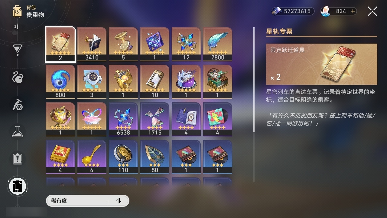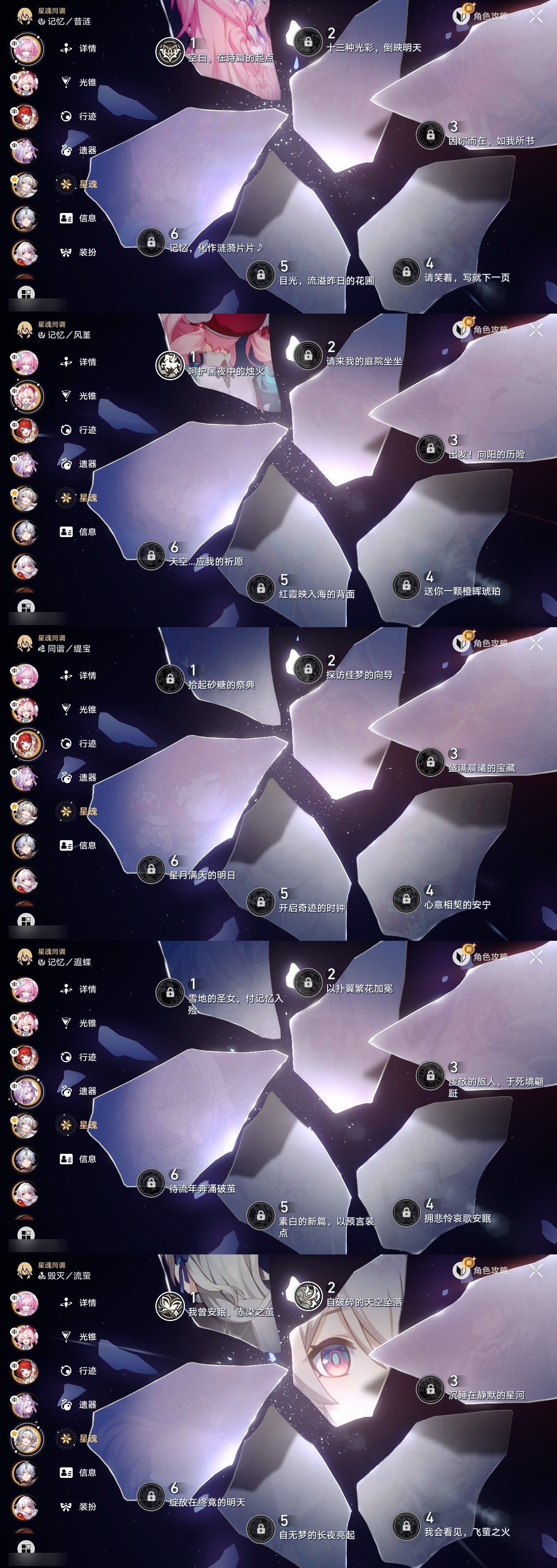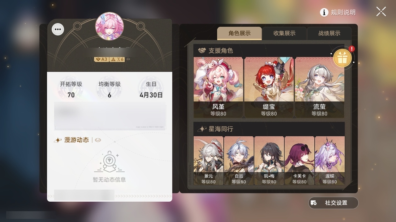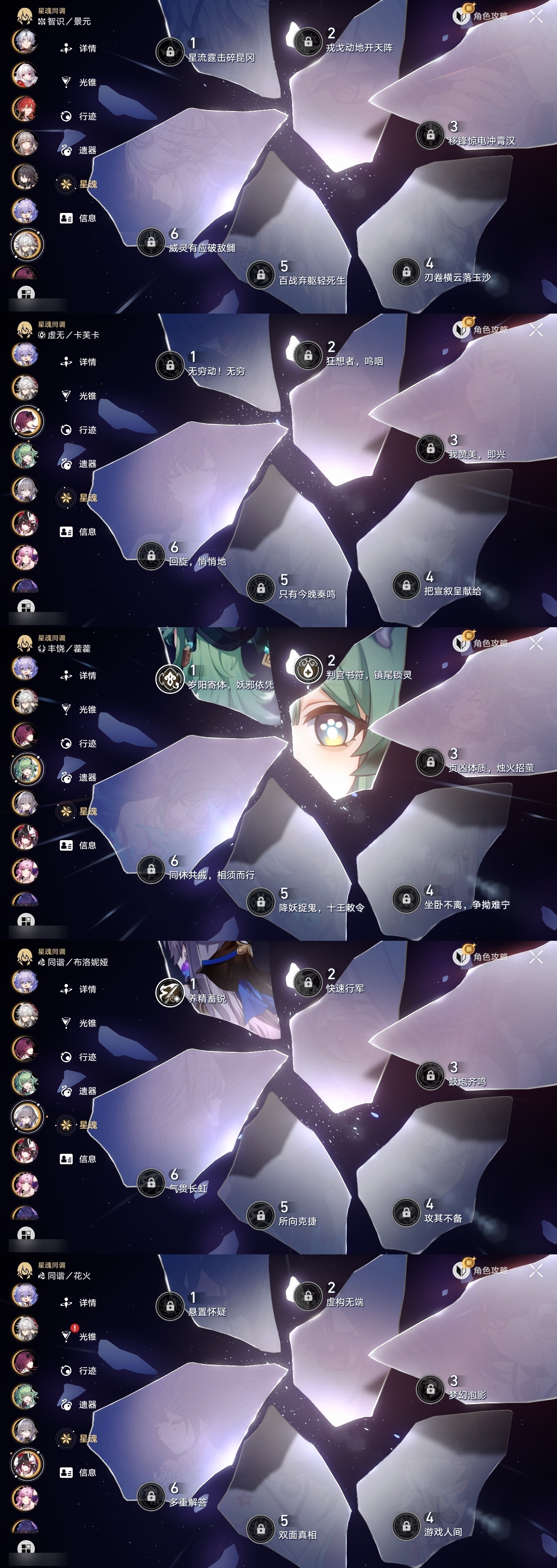 【崩坏·星穹铁道】【lyxq9891】冒险等级:70,女主,五星数量:41,五星角色:彦卿 2命藿藿 2命流萤 2命布洛妮娅 1命姬子 1命瓦尔特 1命符玄 1命风堇 1命昔涟 1命景元希儿白露杰帕德克拉拉星期日缇宝卡芙卡丹恒·饮月遐蝶真理医生花火白厄archer丹恒·腾荒__五星光锥:星海巡航 4精记忆永不落幕 2精记忆的质料记一位星神的陨落银河铁道之夜银河铁道之夜以世界之名以世界之名无可取代的东西时节不居拂晓之前回到大地的飞行让告别,更美一些黎明恰如此燃烧理想燃烧的地狱爱如此刻永恒梦应归于何处__四星角色:娜塔莎 6命虎克 6命貊泽 6命黑塔 6命丹恒 6命艾丝妲 6命停云 6命素裳 6命桑博 6命三月七 6命青雀 6命佩拉 6命驭空 6命玲可 6命桂乃芬 6命雪衣 6命米沙 6命加拉赫 6命阿兰 5命希露瓦 5命寒鸦 5命卢卡 2命