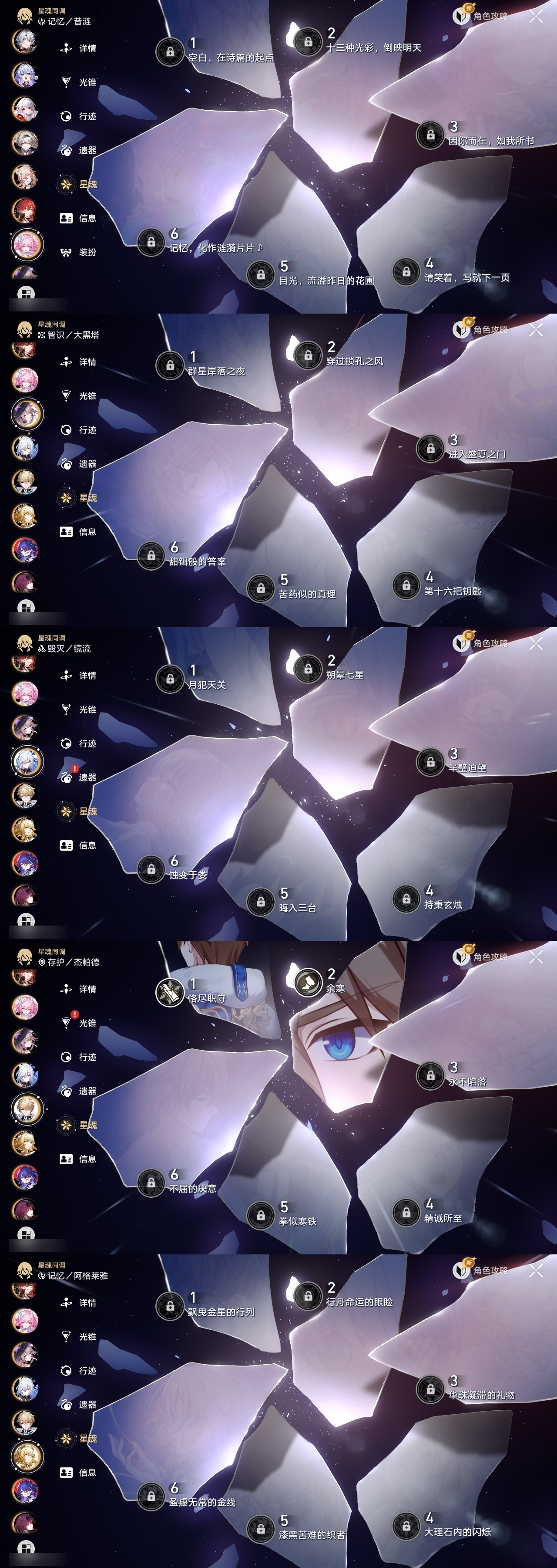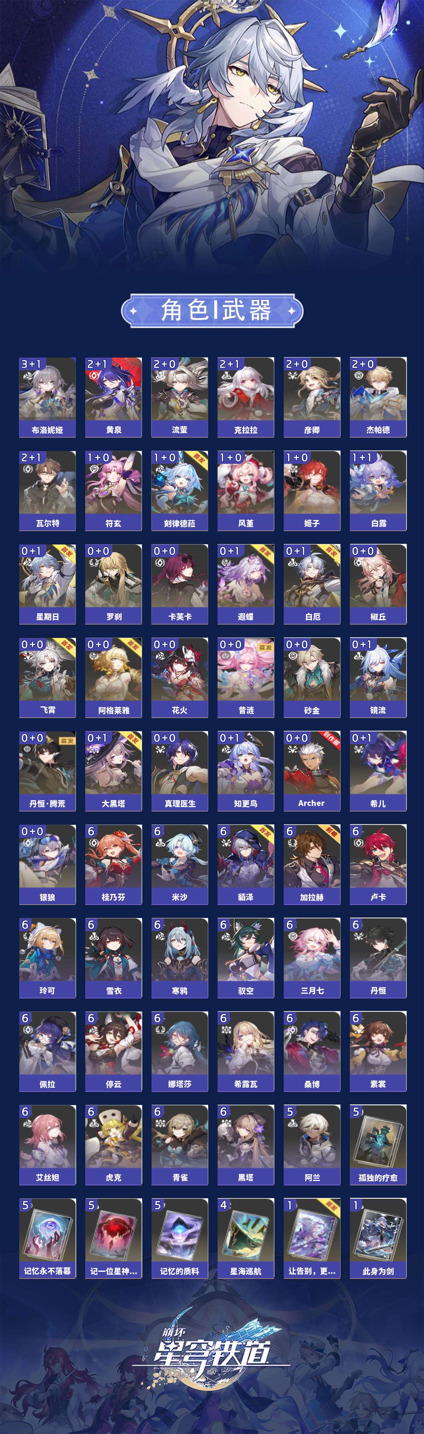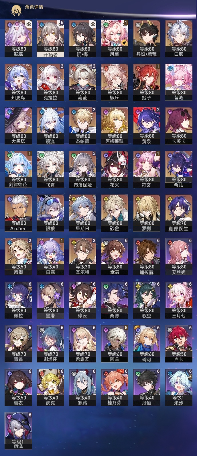【崩坏·星穹铁道】【lyxq9885】冒险等级:70,女主,五星数量:53,五星角色:布洛妮娅 3命杰帕德 2命彦卿 2命瓦尔特 2命克拉拉 2命黄泉 2命流萤 2命白露 1命姬子 1命符玄 1命风堇 1命刻律德菈 1命椒丘飞霄银狼希儿星期日大黑塔罗刹阿格莱雅卡芙卡遐蝶镜流真理医生花火砂金知更鸟白厄archer丹恒·腾荒昔涟__五星光锥:记忆的质料 5精记一位星神的陨落 5精孤独的疗愈 5精记忆永不落幕 5精星海巡航 4精以世界之名以世界之名无可取代的东西时节不居时节不居时节不居但战斗还未结束但战斗还未结束于夜色中不息的演算回到大地的飞行向着不可追问处让告别,更美一些此身为剑行于流逝的岸夜色流光溢彩黎明恰如此燃烧__四星角色:娜塔莎 6命虎克 6命貊泽 6命黑塔 6命丹恒 6命艾丝妲 6命希露瓦 6命停云 6命素裳 6命桑博 6命三月七 6命青雀 6命佩拉 6命驭空 6命卢卡 6命玲可 6命桂乃芬 6命寒鸦 6命雪衣 6命米沙 6命加拉赫 6命阿兰 5命记忆队,白厄队,海泉队,击破队