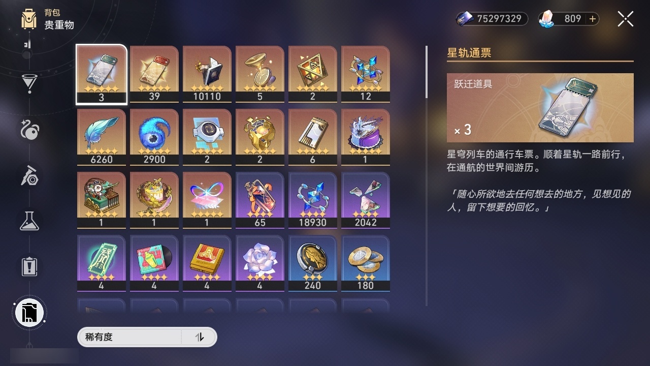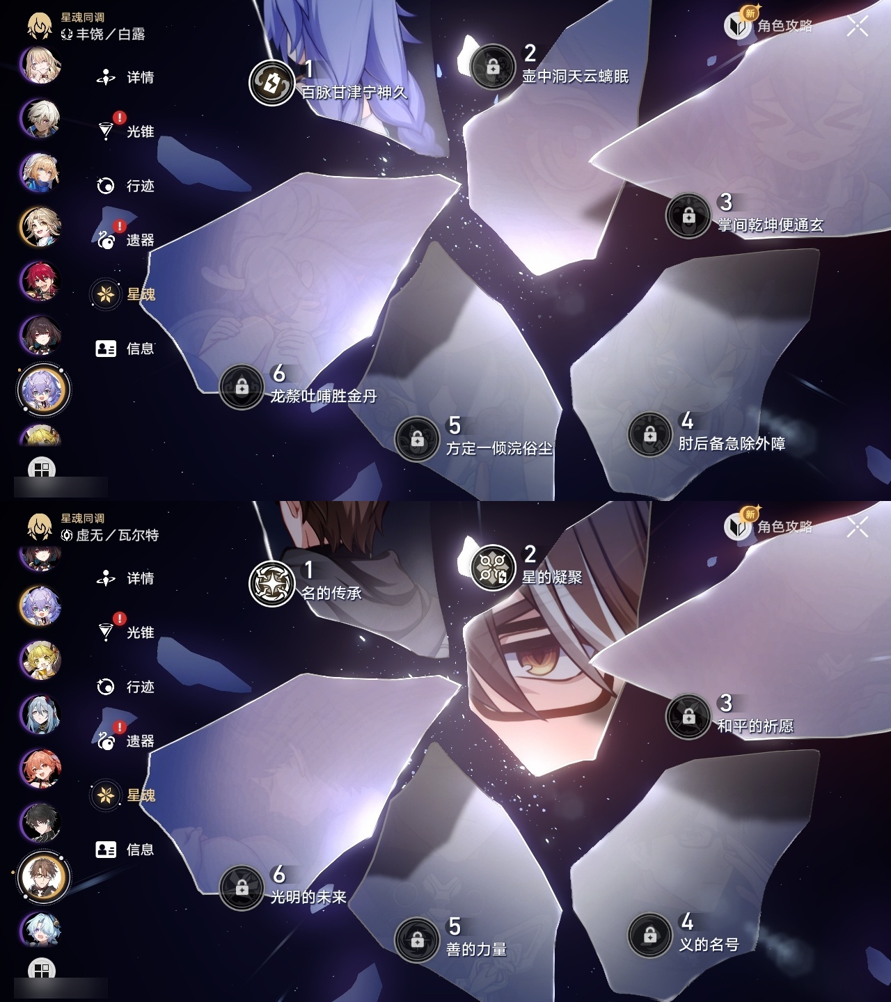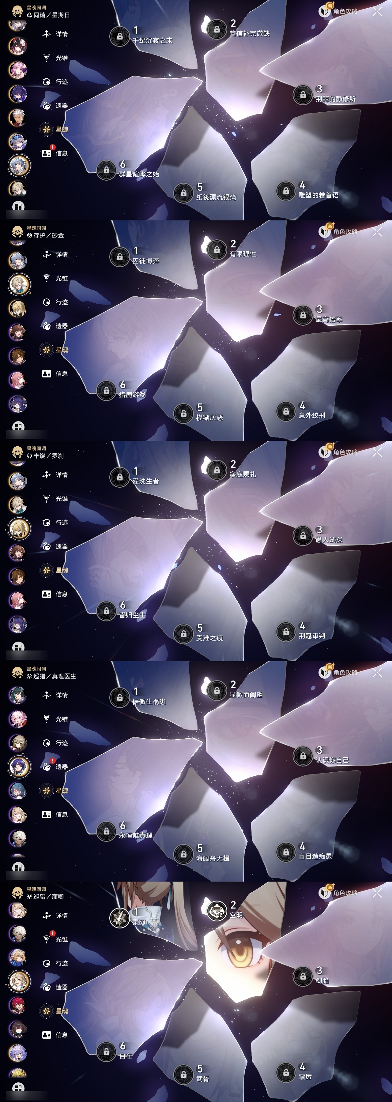 【崩坏·星穹铁道】【lyxq9885】冒险等级:70,女主,五星数量:53,五星角色:布洛妮娅 3命杰帕德 2命彦卿 2命瓦尔特 2命克拉拉 2命黄泉 2命流萤 2命白露 1命姬子 1命符玄 1命风堇 1命刻律德菈 1命椒丘飞霄银狼希儿星期日大黑塔罗刹阿格莱雅卡芙卡遐蝶镜流真理医生花火砂金知更鸟白厄archer丹恒·腾荒昔涟__五星光锥:记忆的质料 5精记一位星神的陨落 5精孤独的疗愈 5精记忆永不落幕 5精星海巡航 4精以世界之名以世界之名无可取代的东西时节不居时节不居时节不居但战斗还未结束但战斗还未结束于夜色中不息的演算回到大地的飞行向着不可追问处让告别,更美一些此身为剑行于流逝的岸夜色流光溢彩黎明恰如此燃烧__四星角色:娜塔莎 6命虎克 6命貊泽 6命黑塔 6命丹恒 6命艾丝妲 6命希露瓦 6命停云 6命素裳 6命桑博 6命三月七 6命青雀 6命佩拉 6命驭空 6命卢卡 6命玲可 6命桂乃芬 6命寒鸦 6命雪衣 6命米沙 6命加拉赫 6命阿兰 5命记忆队,白厄队,海泉队,击破队