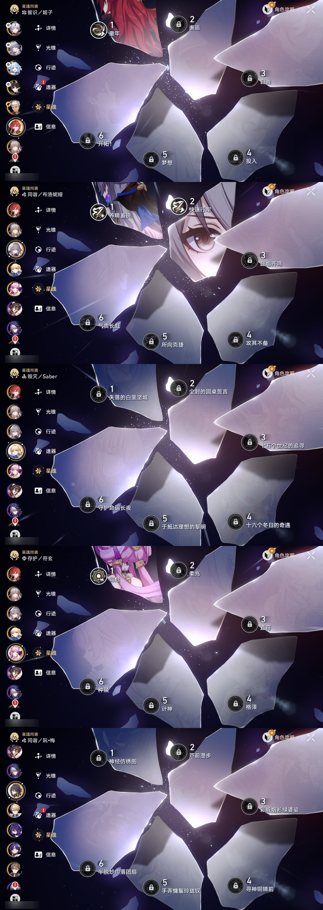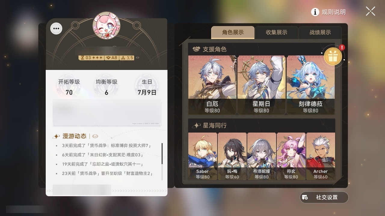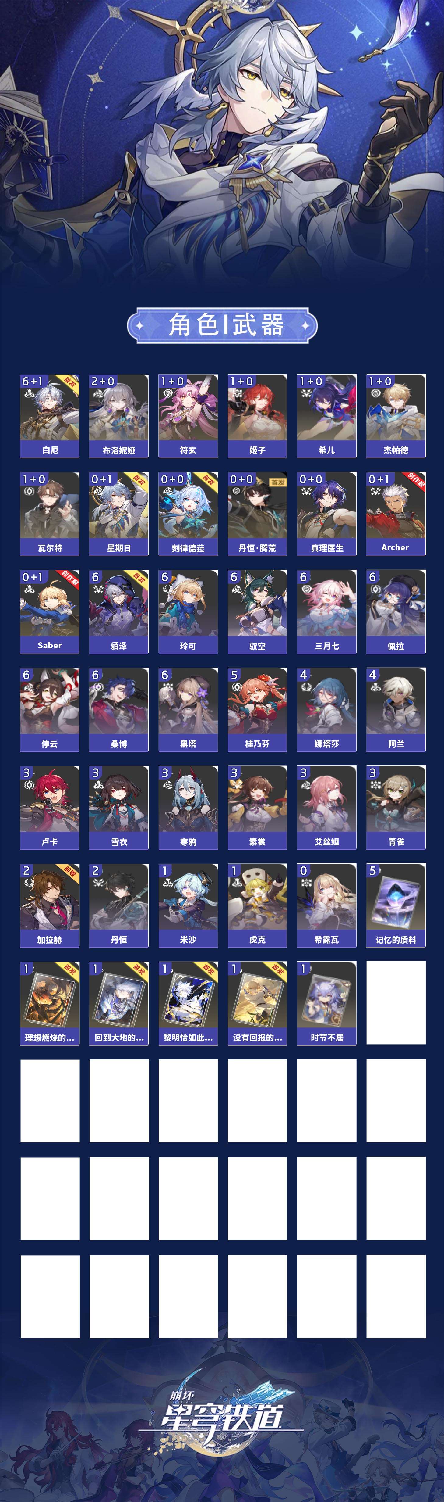 【崩坏·星穹铁道】【lyxq9840】冒险等级:70,女主,五星数量:19,五星角色:白厄 6命布洛妮娅 2命希儿 1命姬子 1命杰帕德 1命瓦尔特 1命符玄 1命星期日真理医生saberarcher刻律德菈丹恒·腾荒__五星光锥:记忆的质料 5精时节不居回到大地的飞行黎明恰如此燃烧理想燃烧的地狱没有回报的加冕__四星角色:貊泽 6命黑塔 6命停云 6命桑博 6命三月七 6命佩拉 6命驭空 6命玲可 6命桂乃芬 5命阿兰 4命娜塔莎 4命艾丝妲 3命素裳 3命青雀 3命卢卡 3命寒鸦 3命雪衣 3命丹恒 2命加拉赫 2命虎克 1命米沙 1命希露瓦